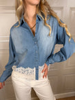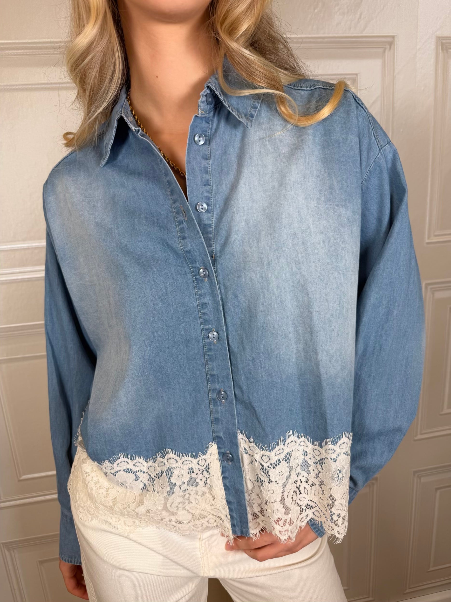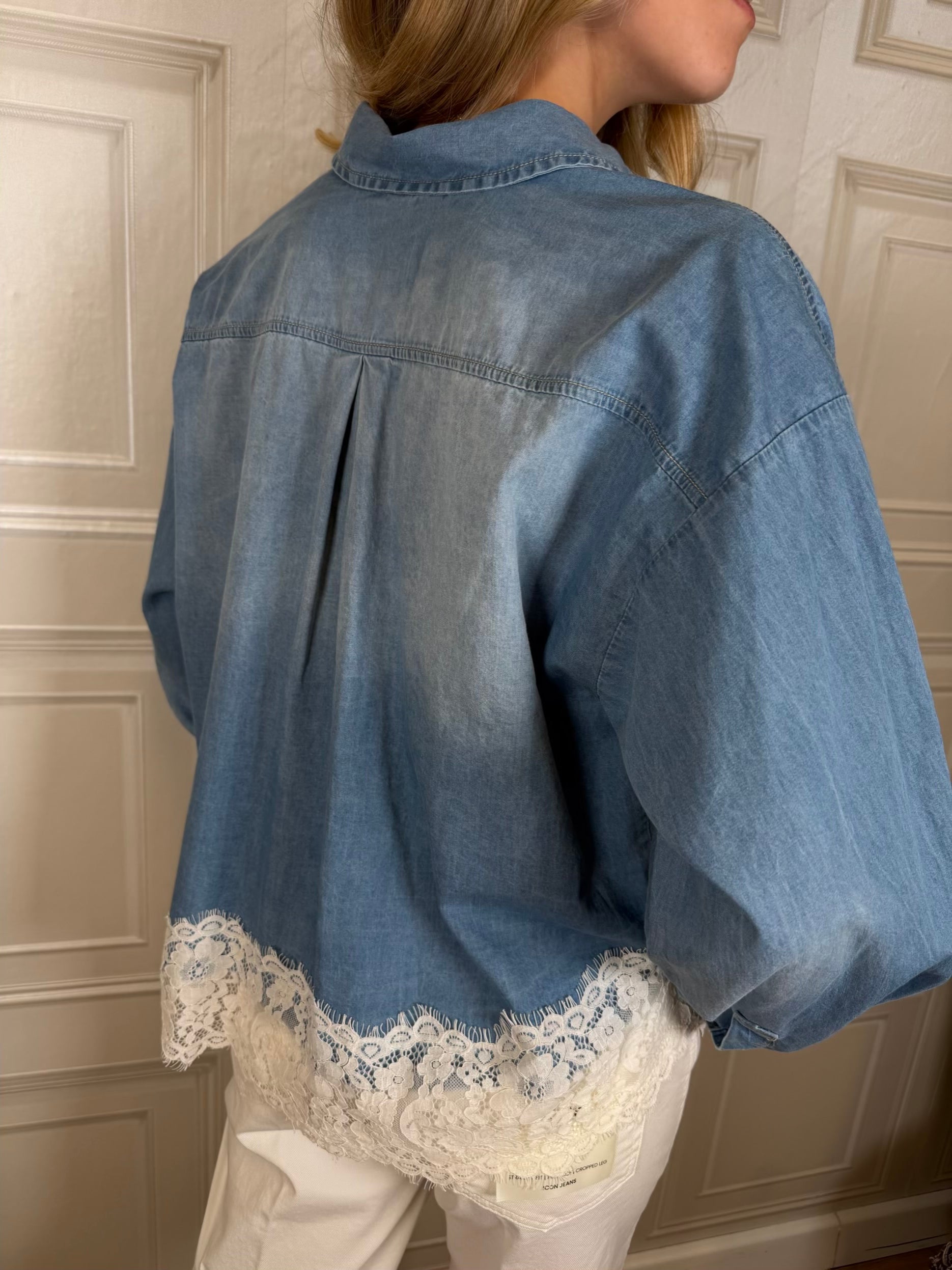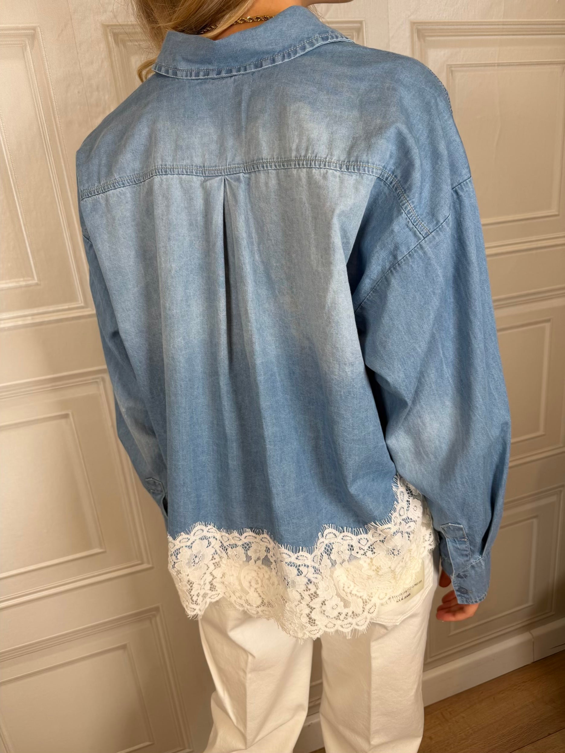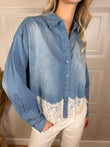 Camicia chambray. Modello over. Chiusura con bottoncini sul davanti e sui polsini. Dettaglio di fondo di pizzo bianco.