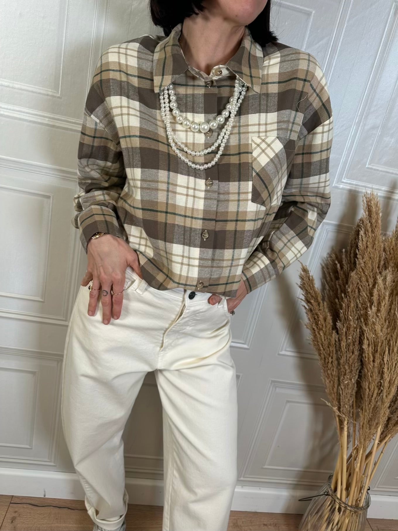 Camicia Check in flanella sui toni del beige con collana perle removibile compresa.