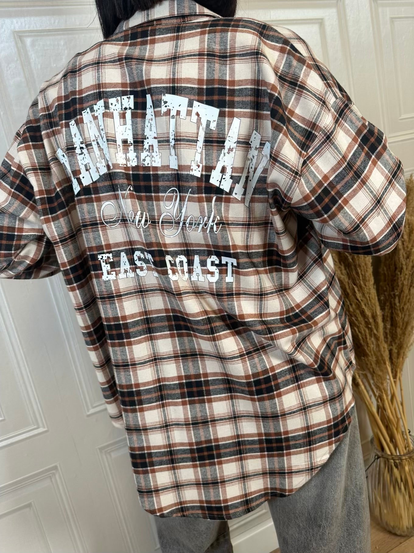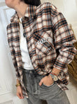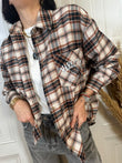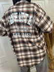 Camicia Check in flanella sui toni del mattone nero e beige con stampa sul retro. Chiusura con bottoncini frontali.