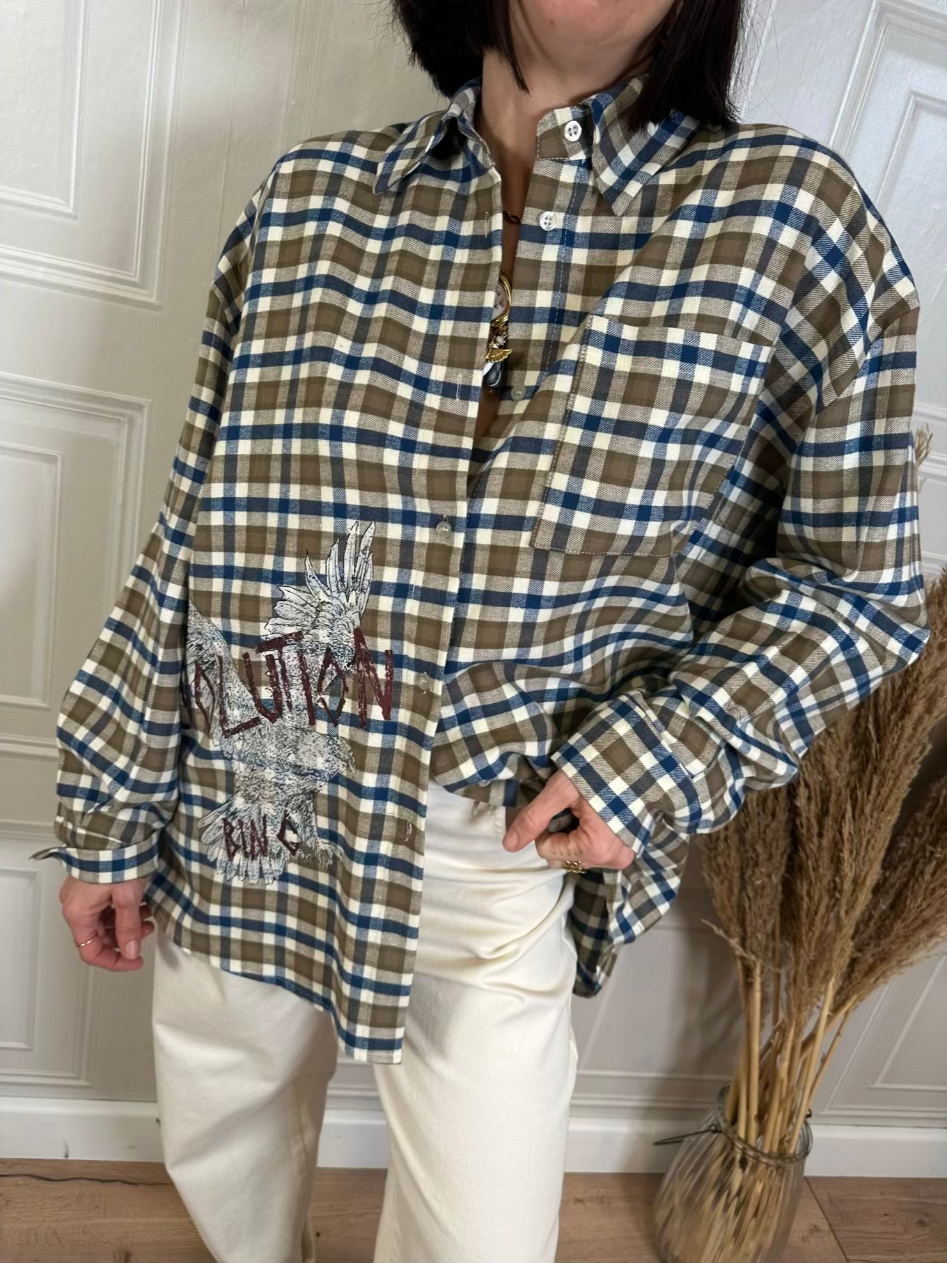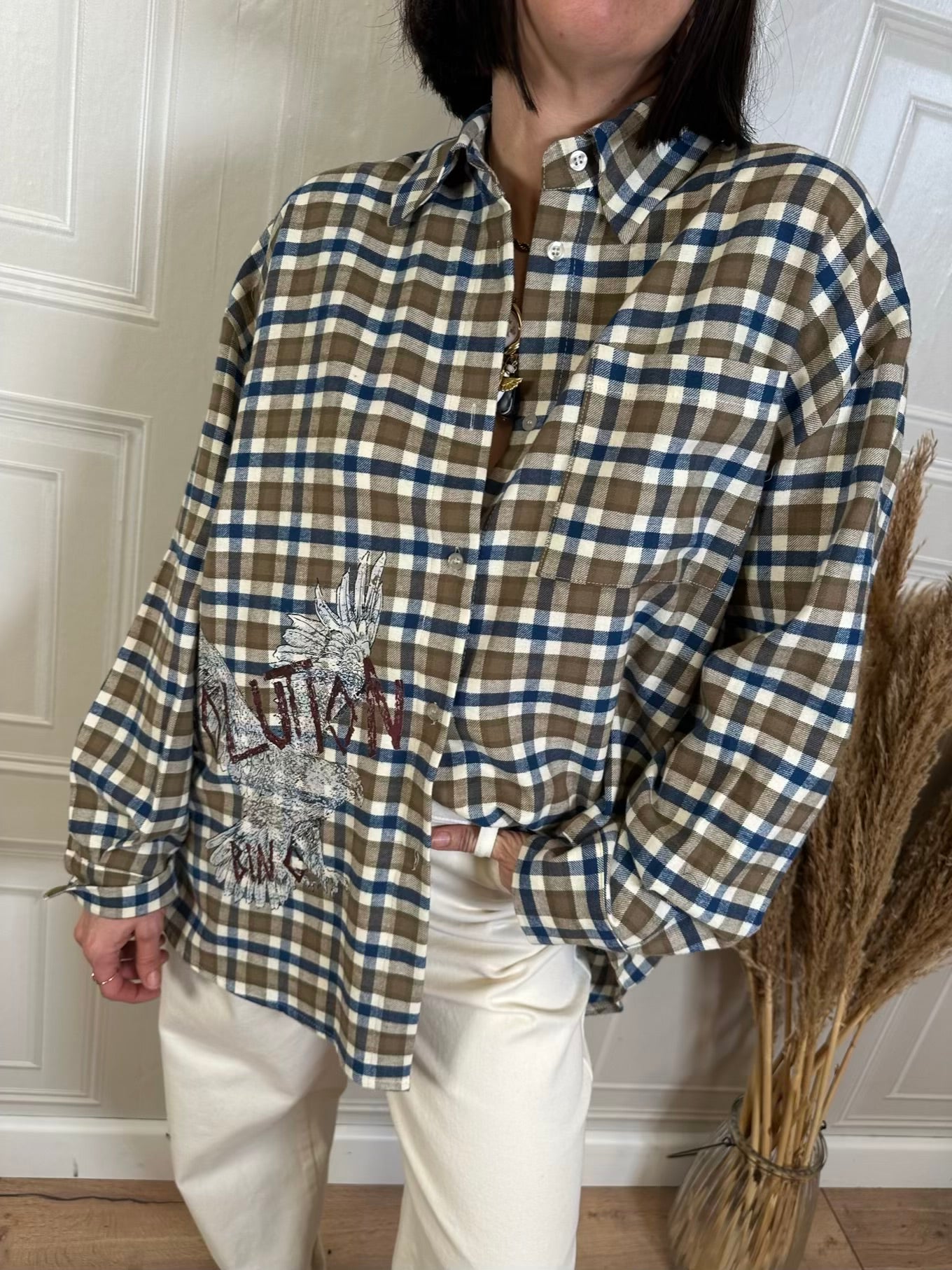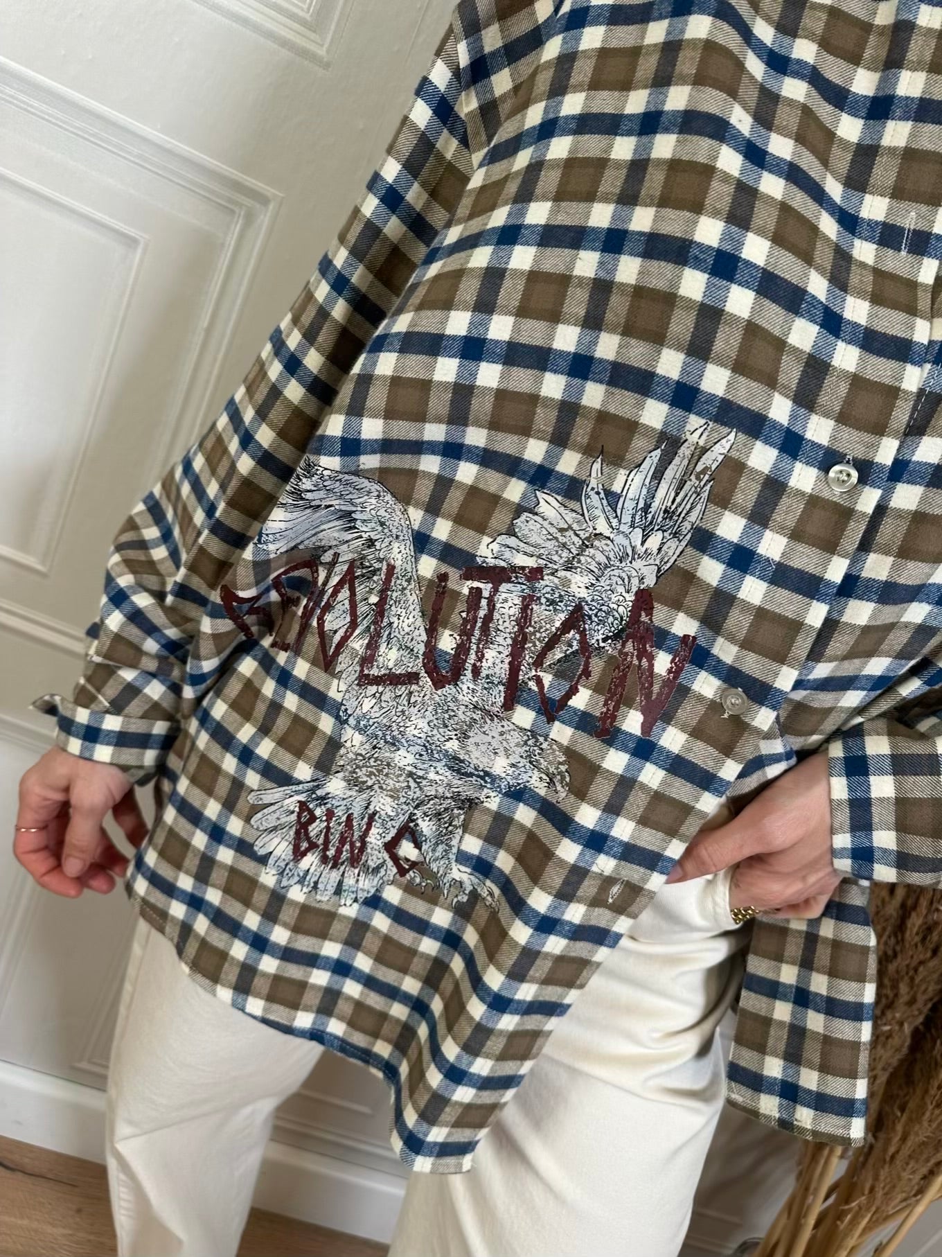 Camicia chek con stampa aquila e scritta revolution. Chiusura con bottoncini sul fronte. Manica scesa. Toni del blu, cammello, panna e bordeaux.