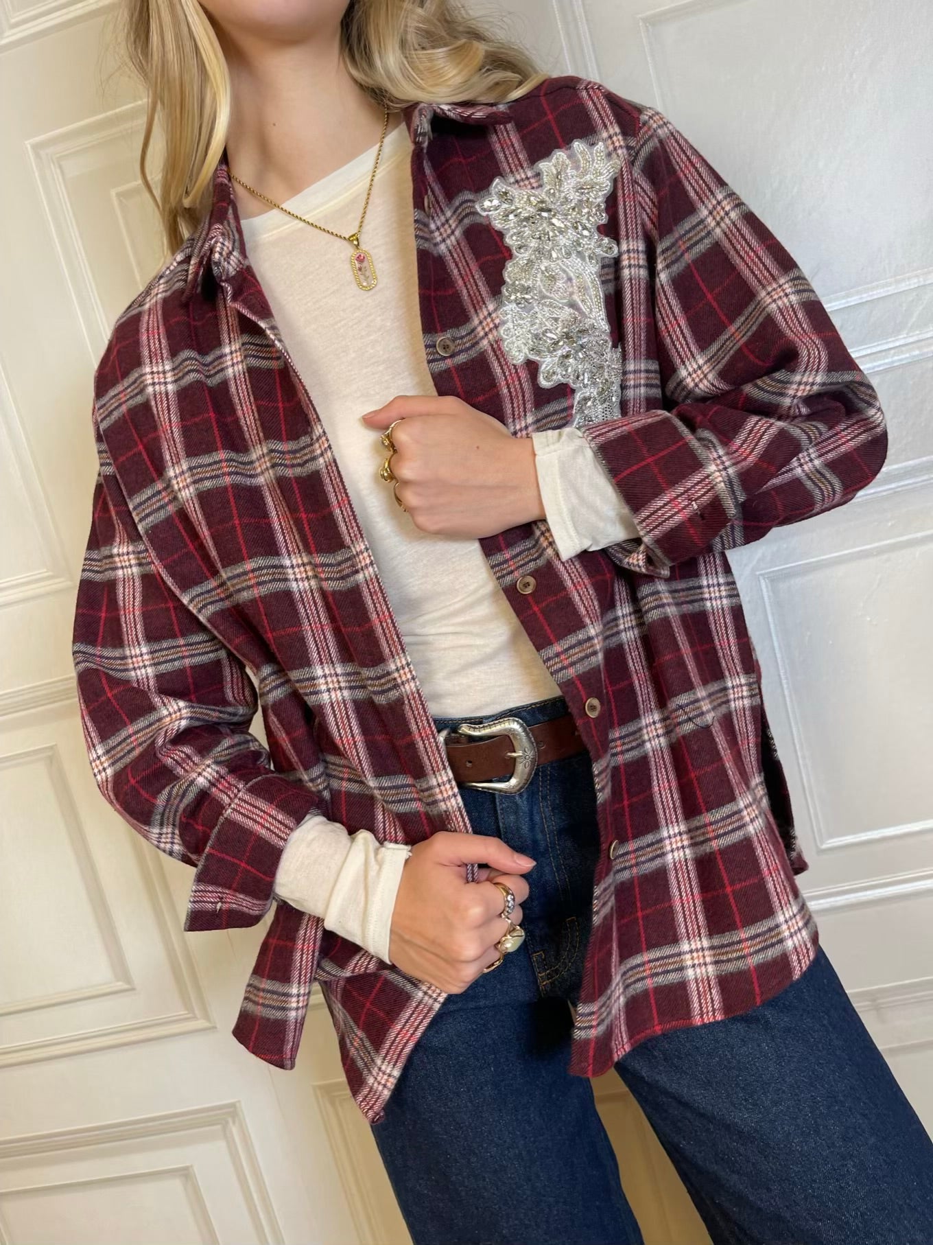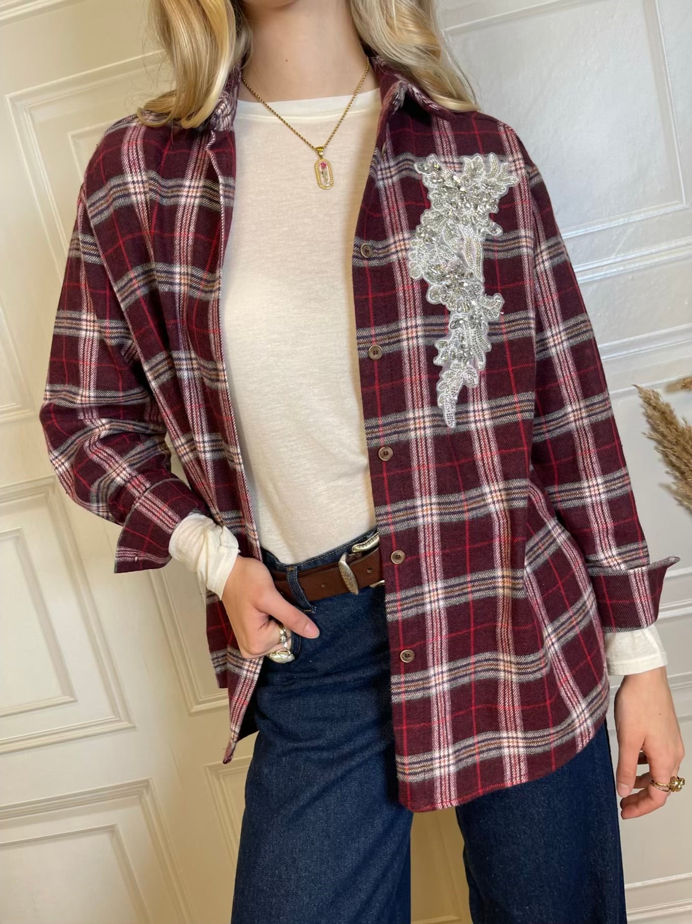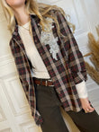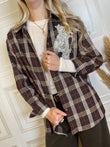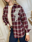 Camicia fantasia check, con dettaglio cabochon sul fronte. Chiusura con bottoncini.