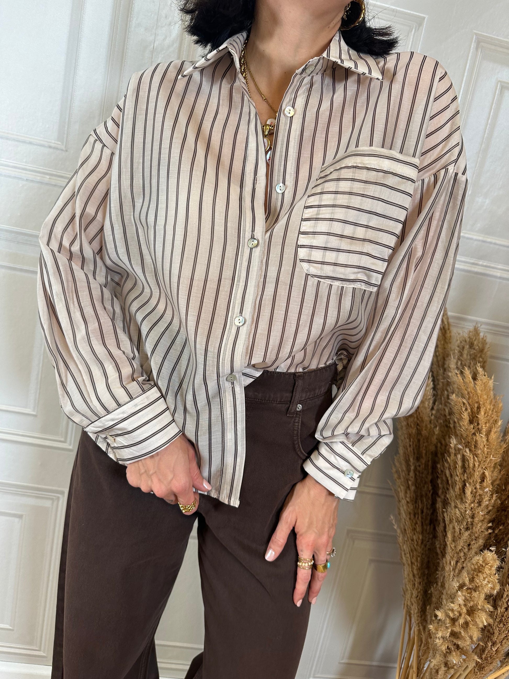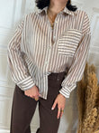 Camicia a fantasia gessata base avorio con righe moro. Modello con colletto, taschino frontale e chiusura con bottoncini.