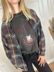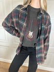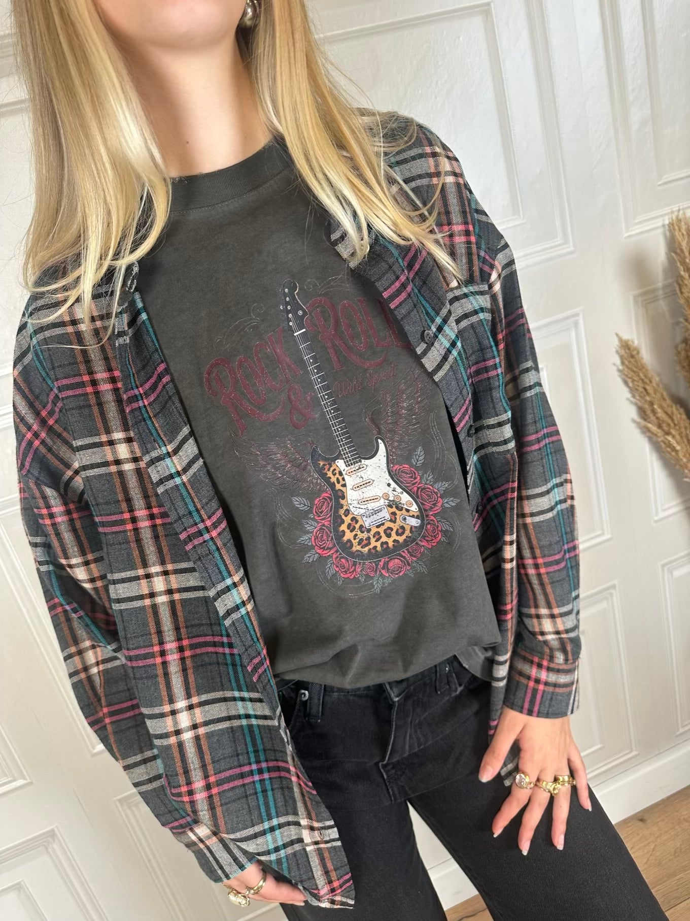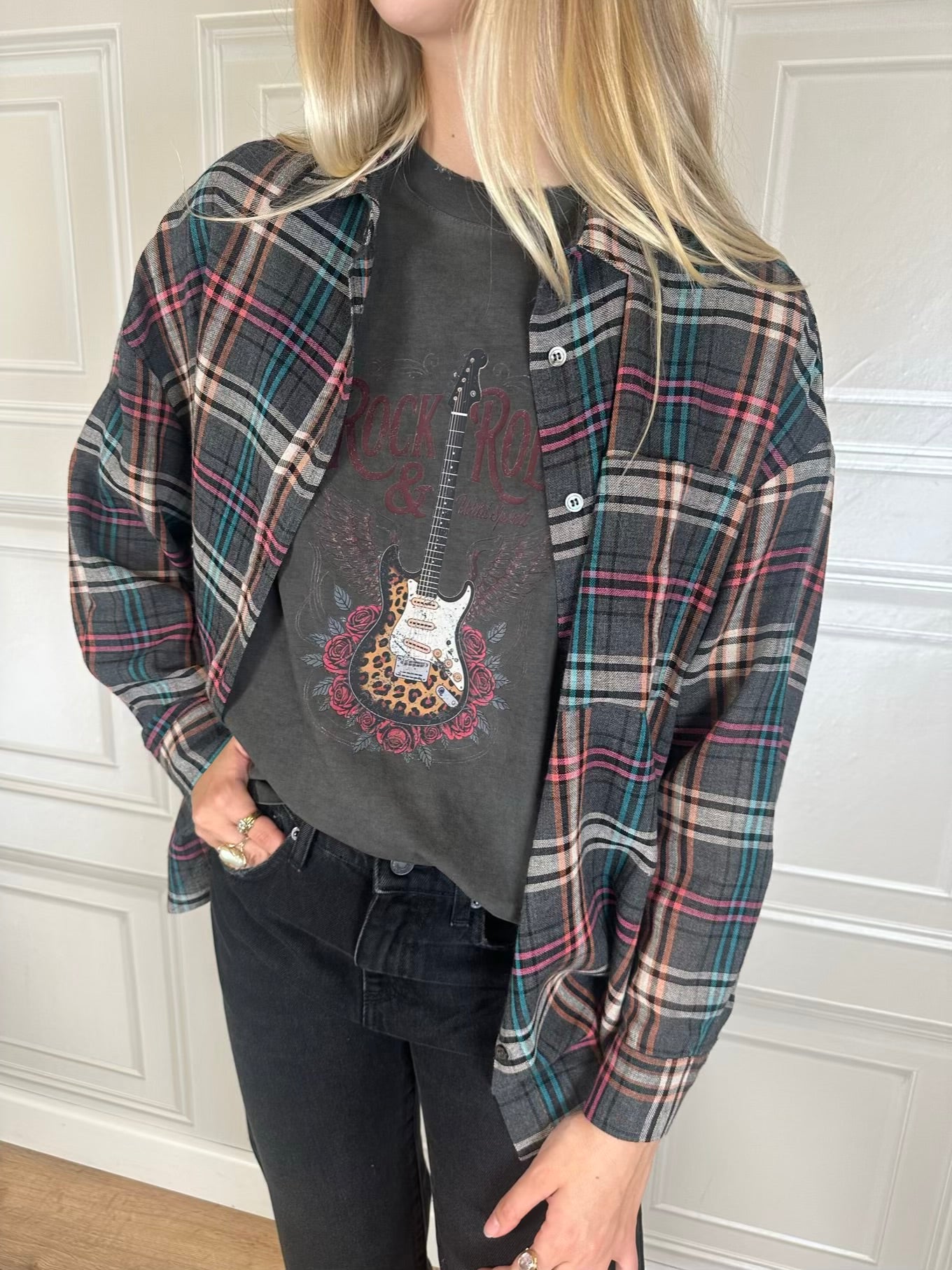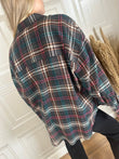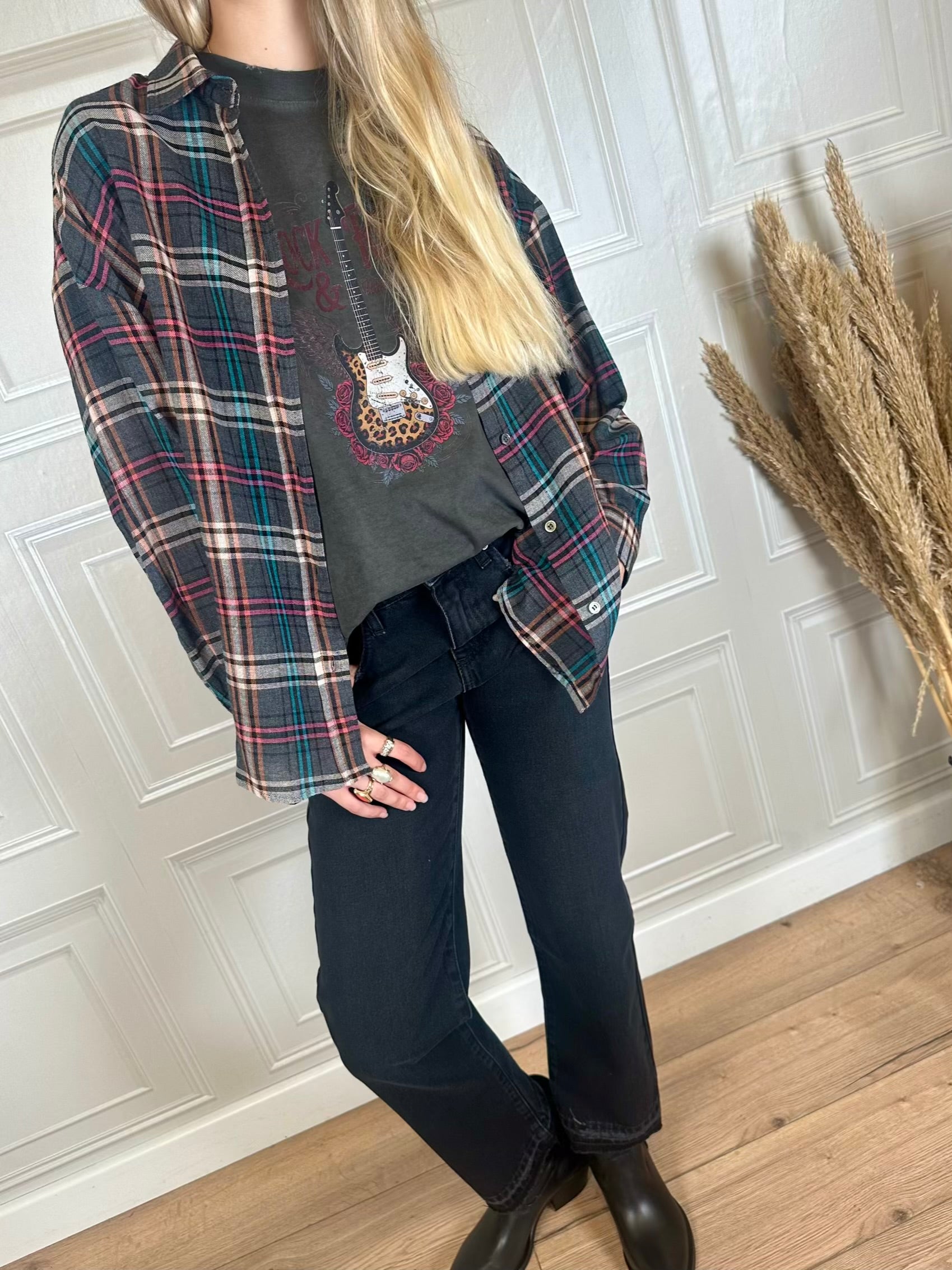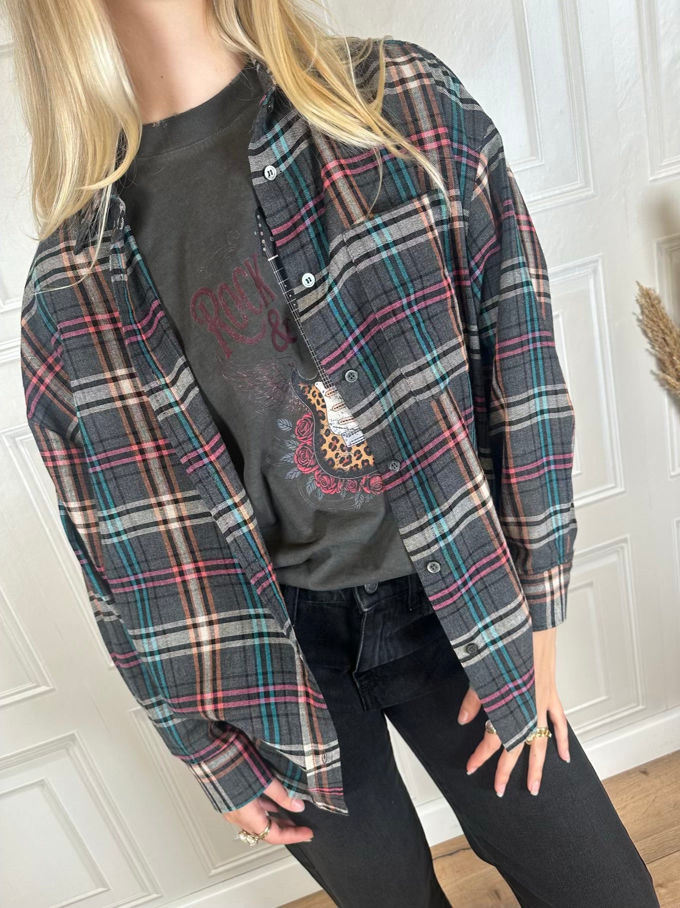 Camicia scozzese sui toni del grigio e bianco, con righe fucsia arancione e azzurro. modello morbido con taschino frontale e chiusura con bottoncini.