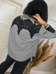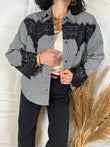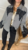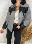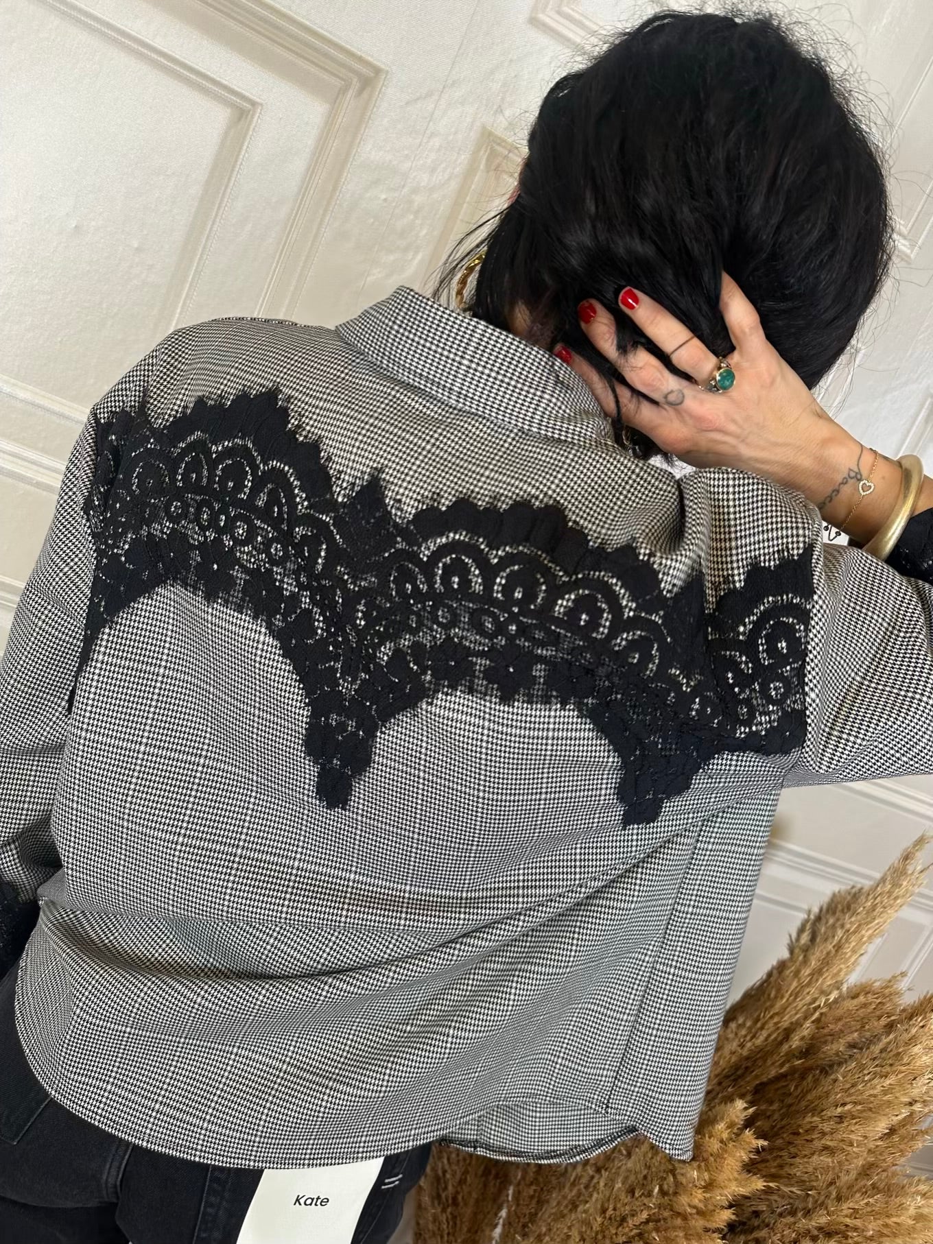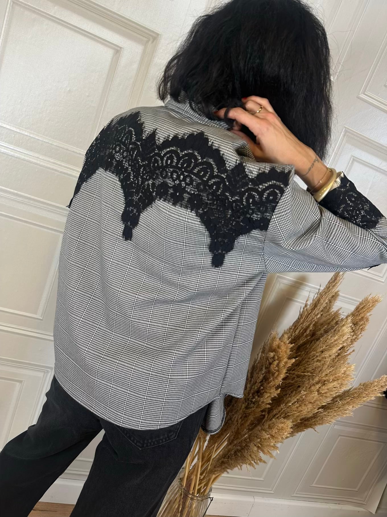 Camicia pied de poule sui toni del bianco e nero. Modello leggermente over con inserti in pizzo su manica e fronte. Chiusura con bottoncini