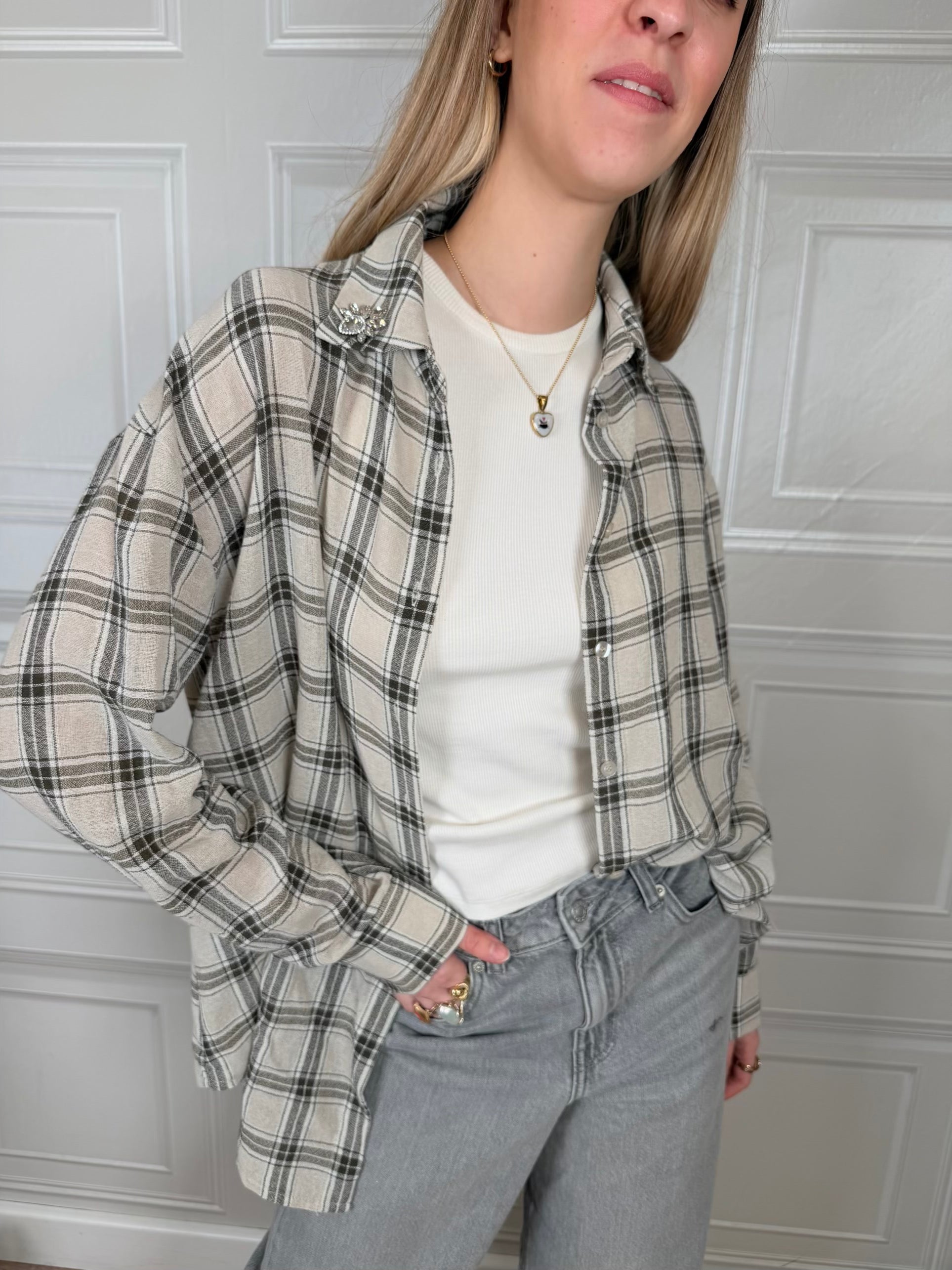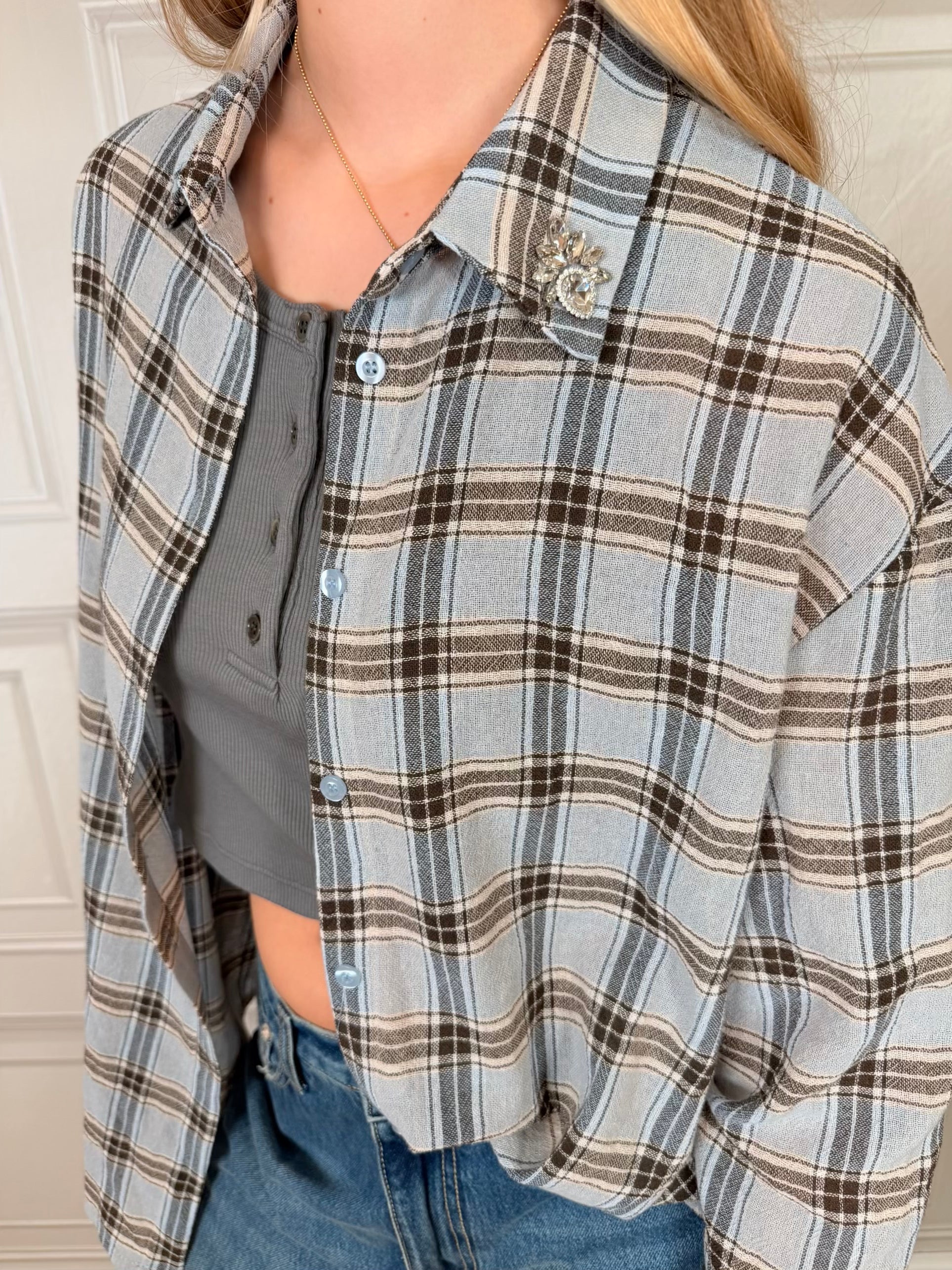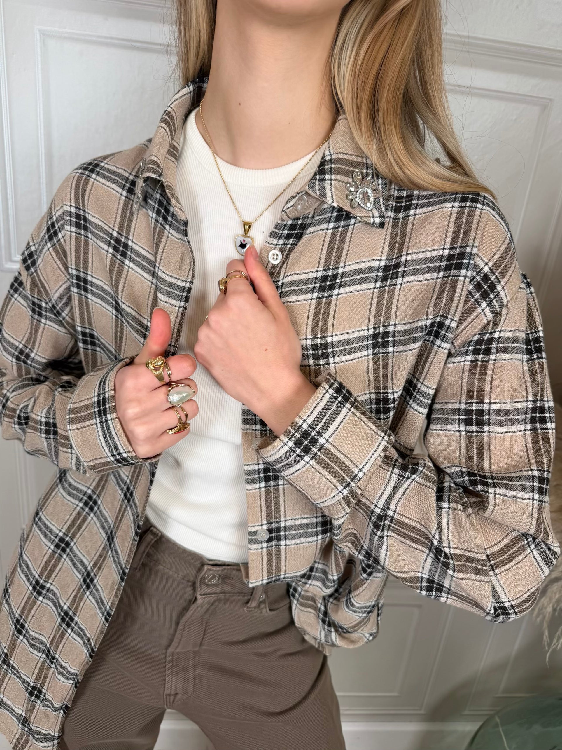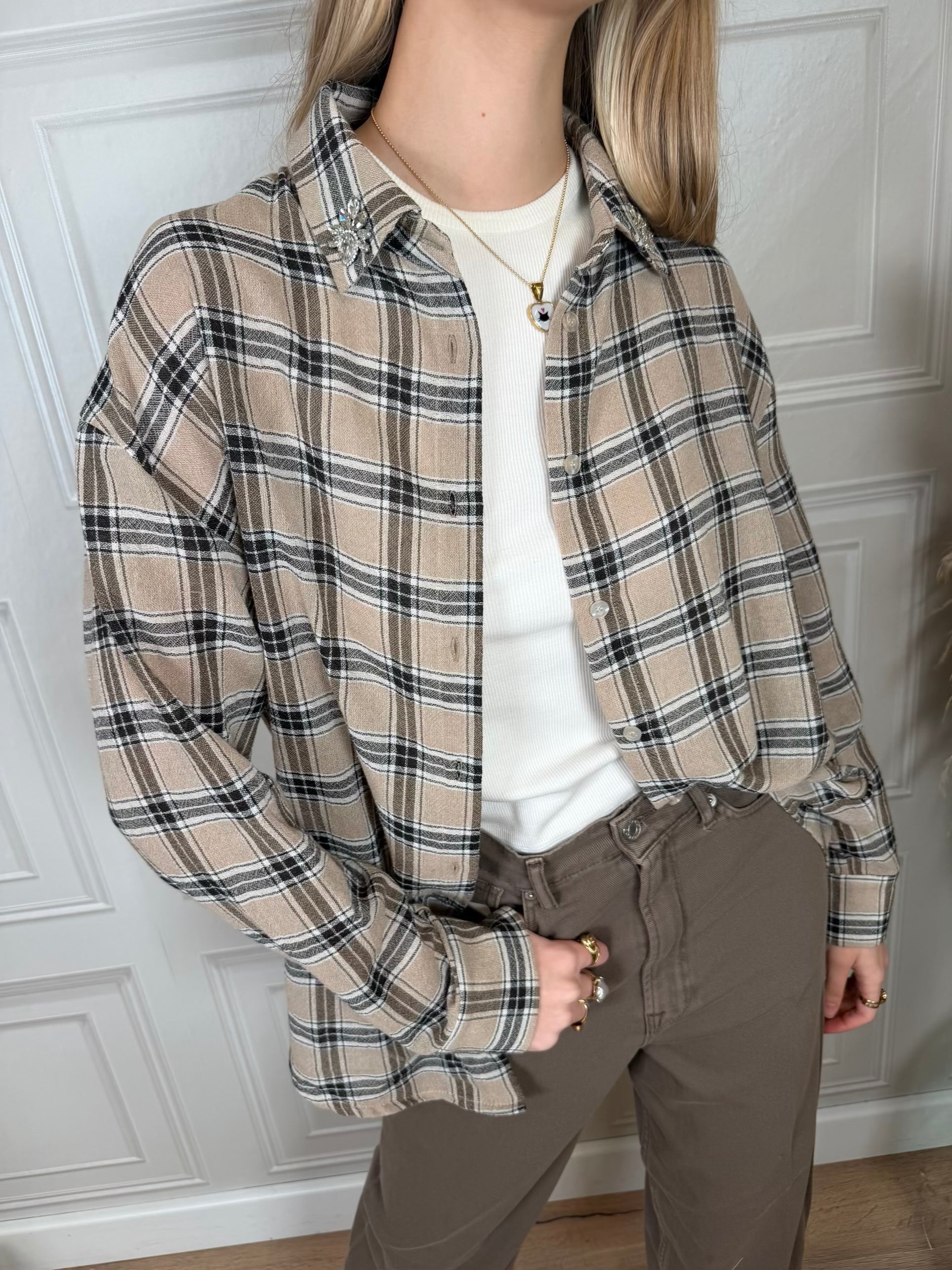 Camicia a quadri con cabochon sul collo. Modello leggermente over coi spalla scesa. Chiusura con bottoncini. Taglia unica.