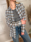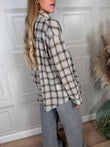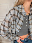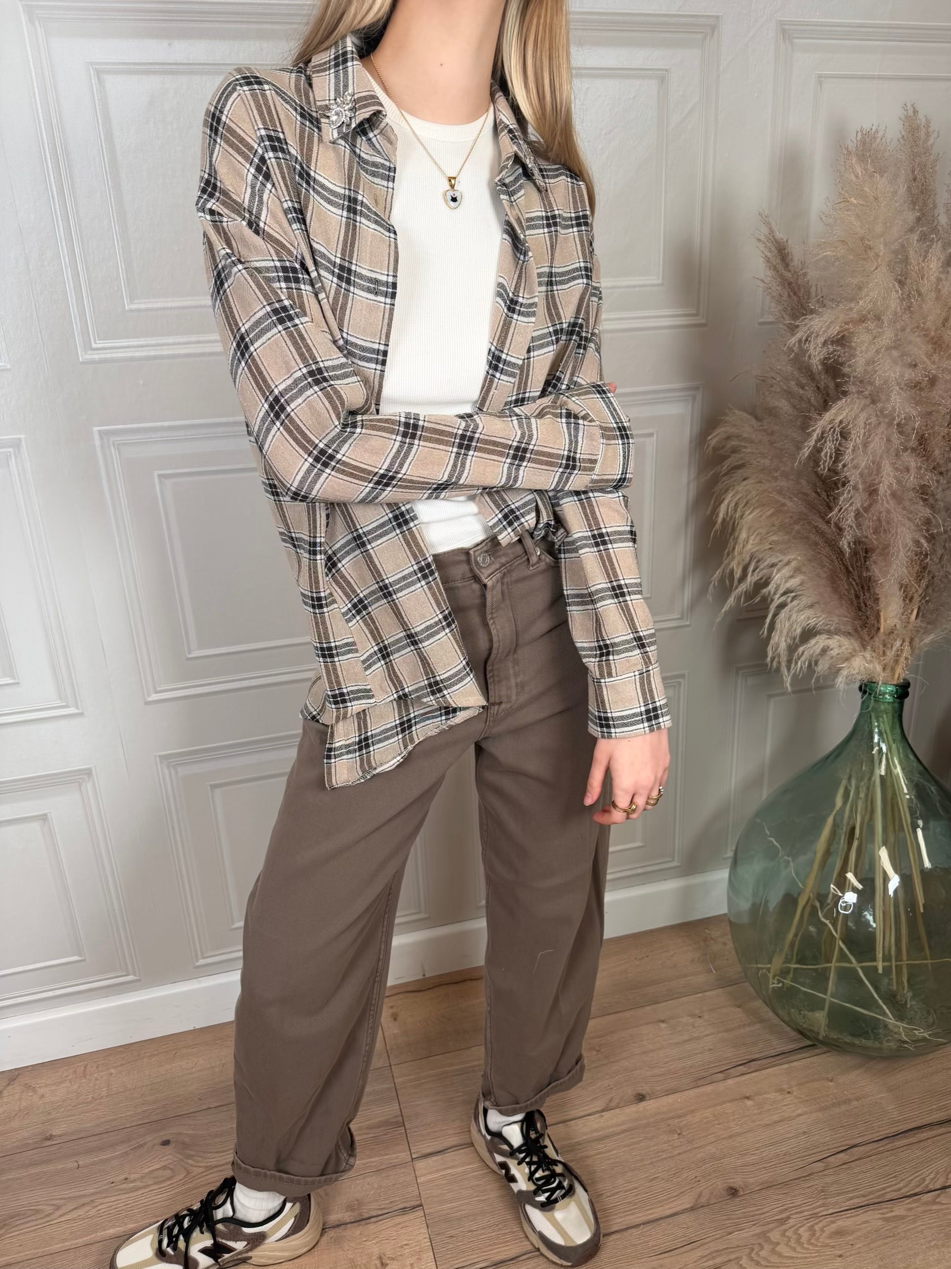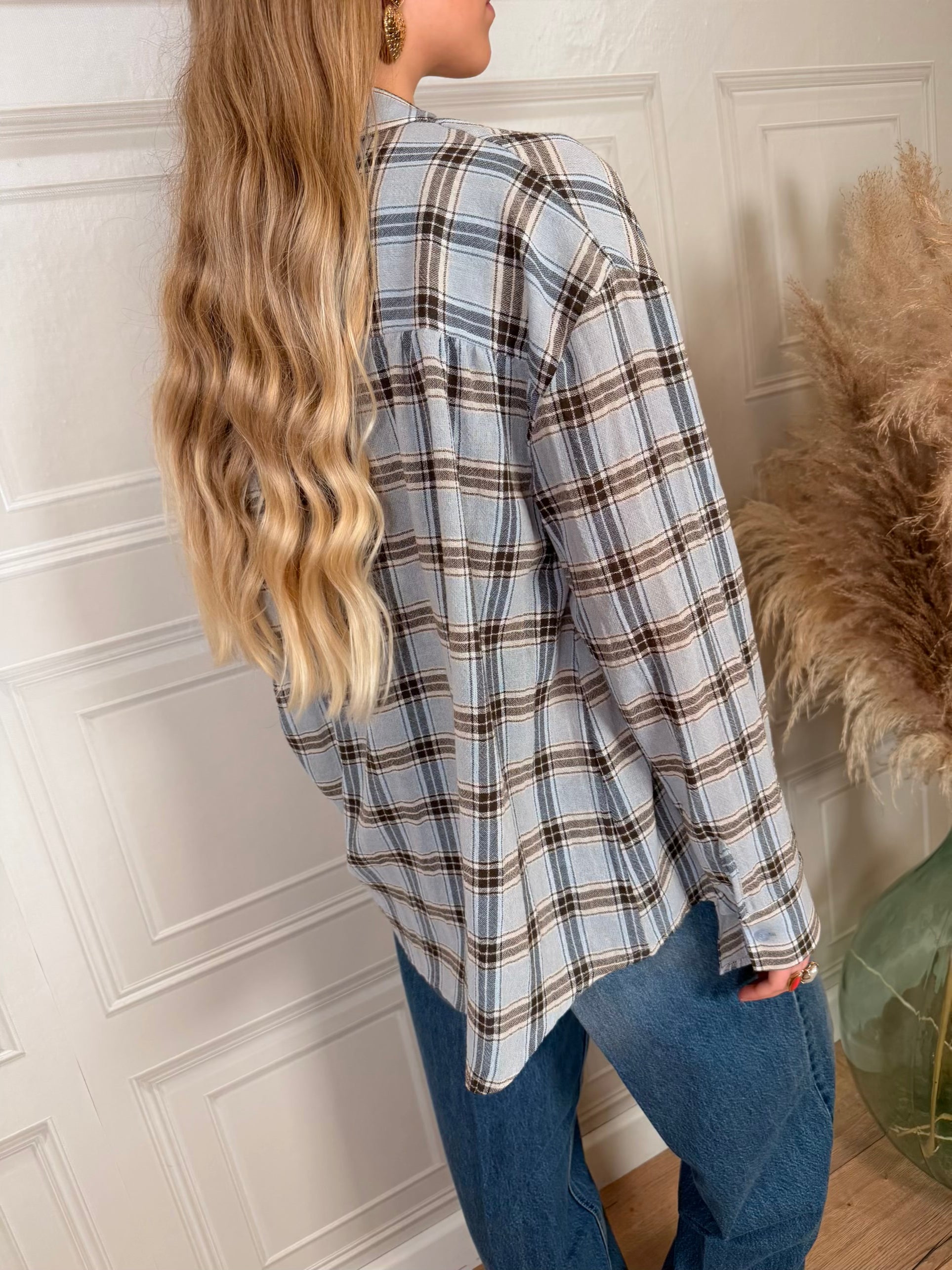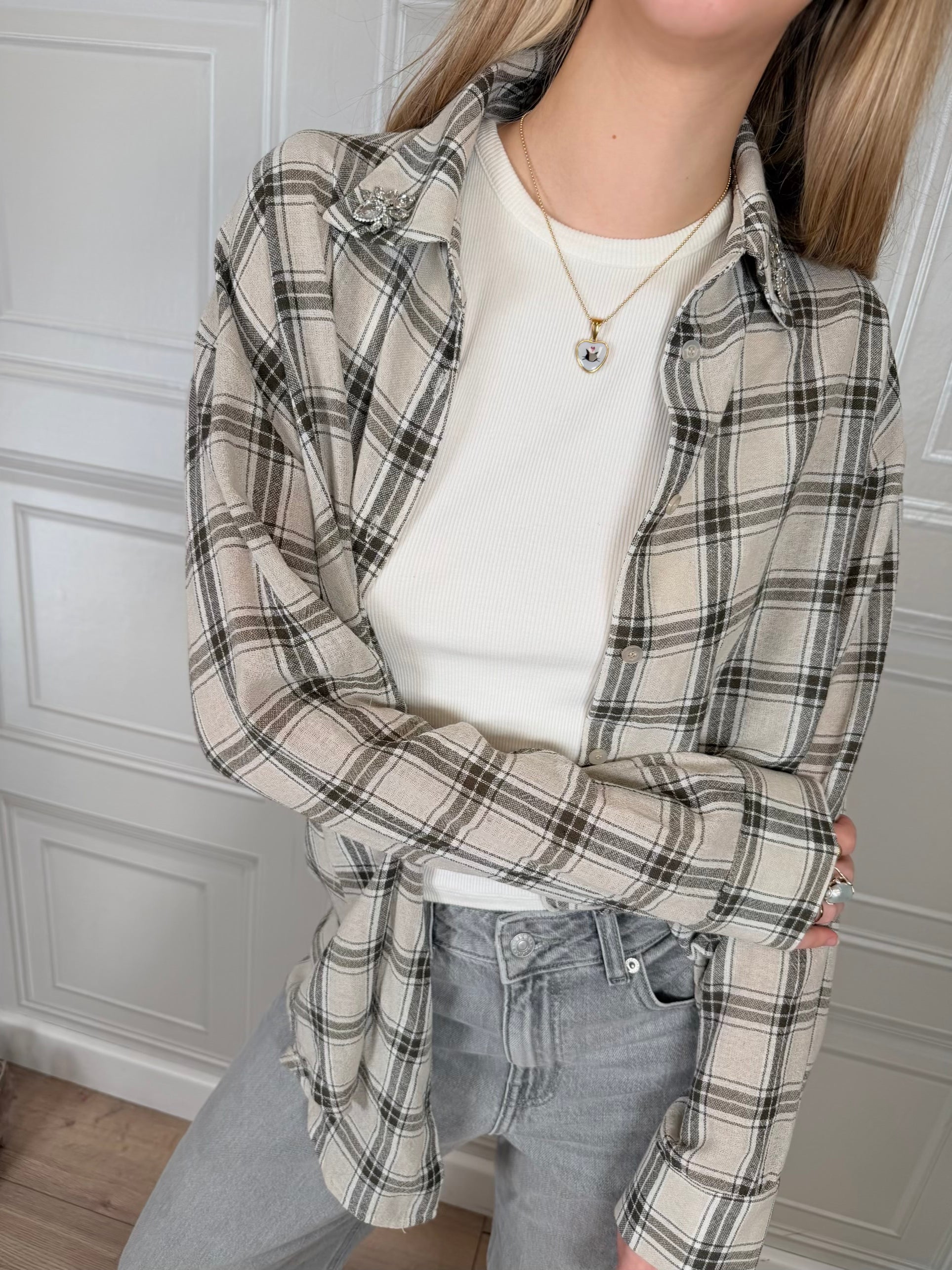 Camicia a quadri con cabochon sul collo. Modello leggermente over coi spalla scesa. Chiusura con bottoncini. Taglia unica.