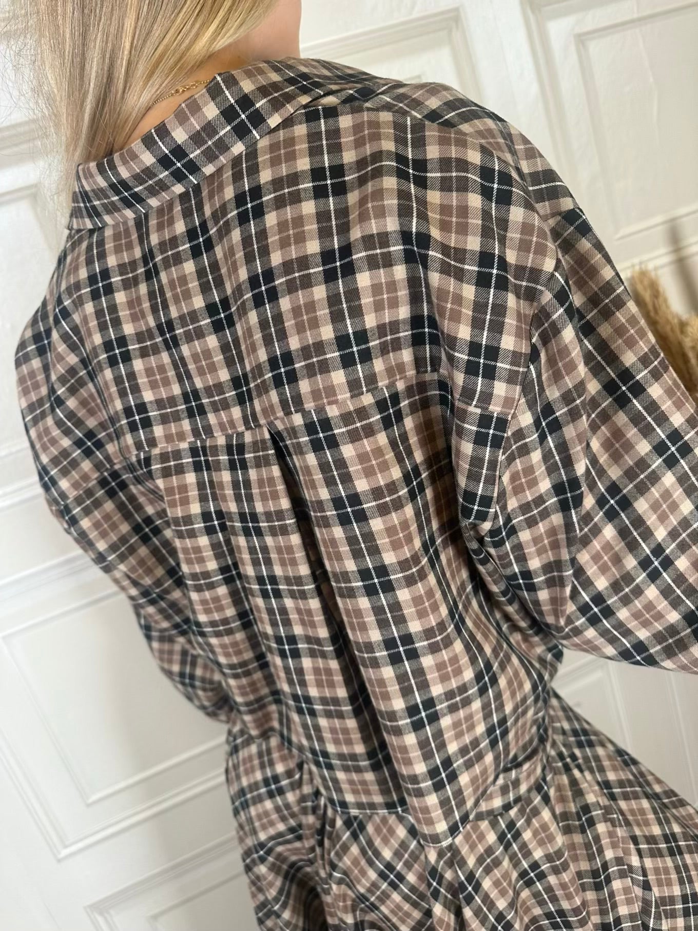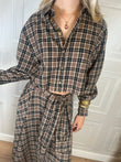 Camicia a quadri cammello, nero e sabbia. Chiusura con bottoncini. Fondo a taglio vivo. Pinces sul retro,