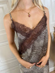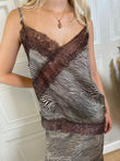 Canotta lingerie asimmetrica scollo a V con spalline sottili regolabili, fantasia ze tata sui toni del moro e burro. Pizzo sullo scollo e sul fondo