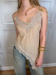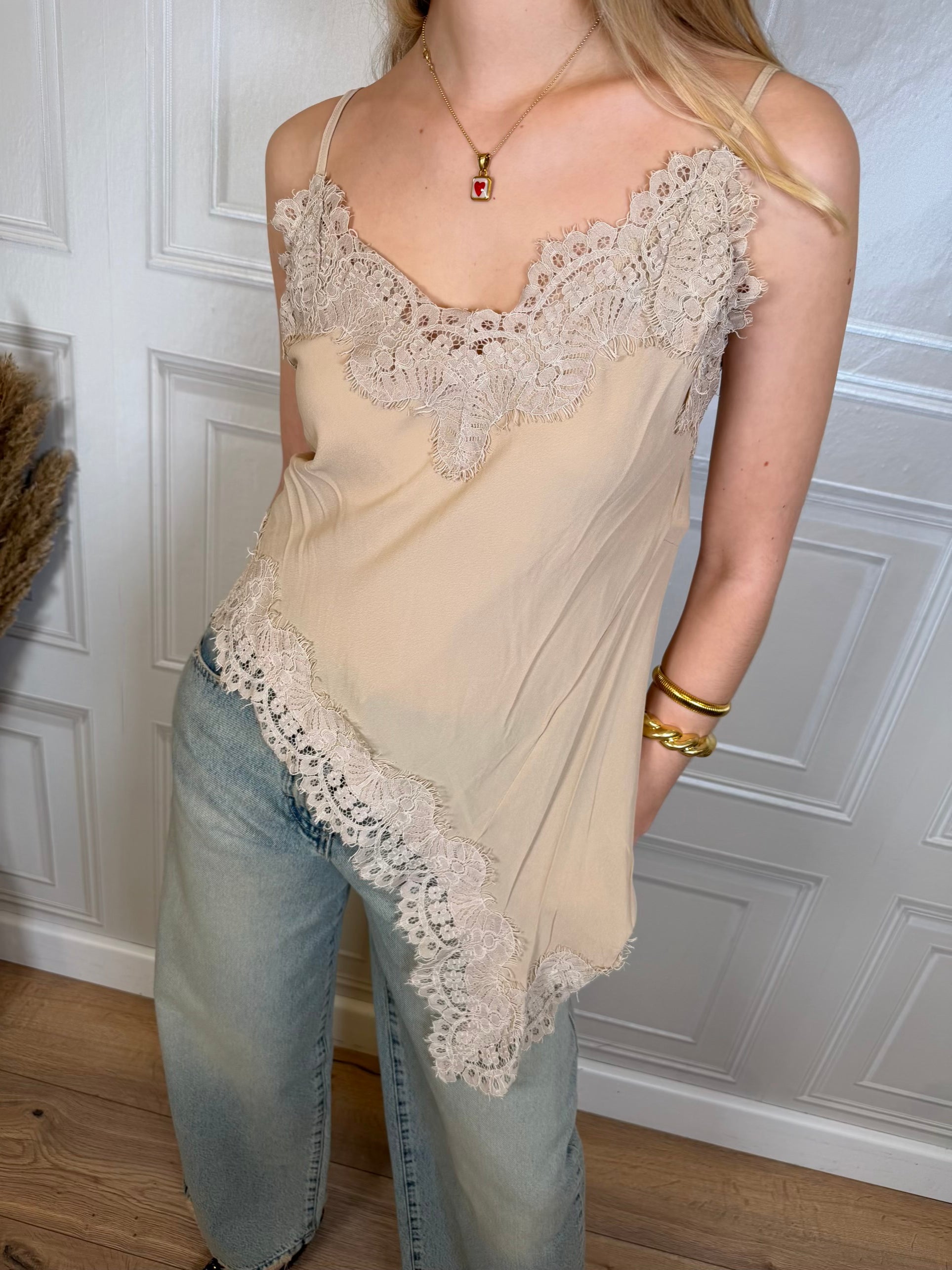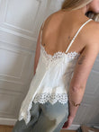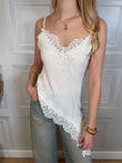 Canotta lingerie. Modello con spalline sottili. Decorazione pizzo su scollo e fondo. Fondo asimmetrico.