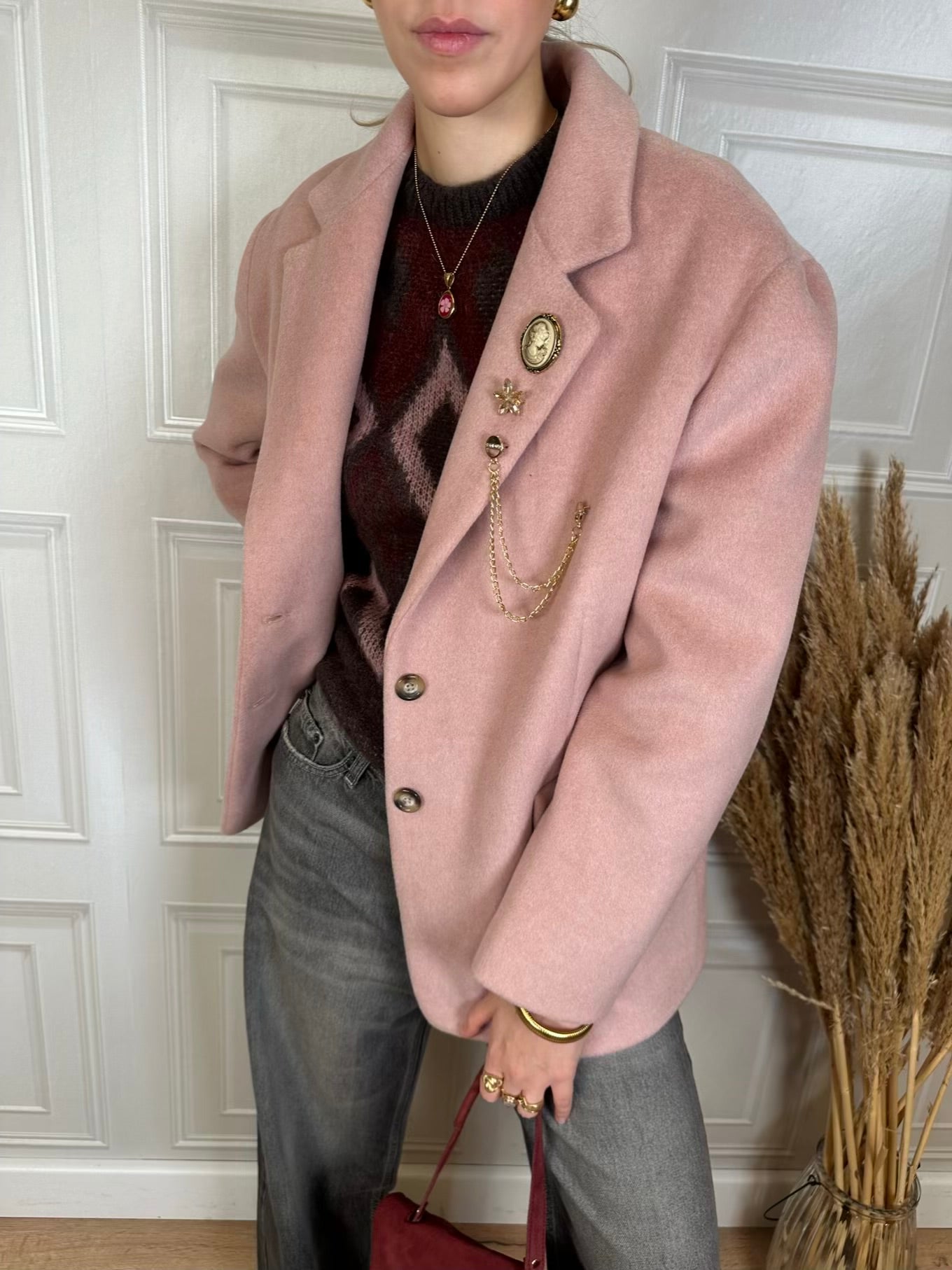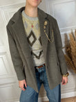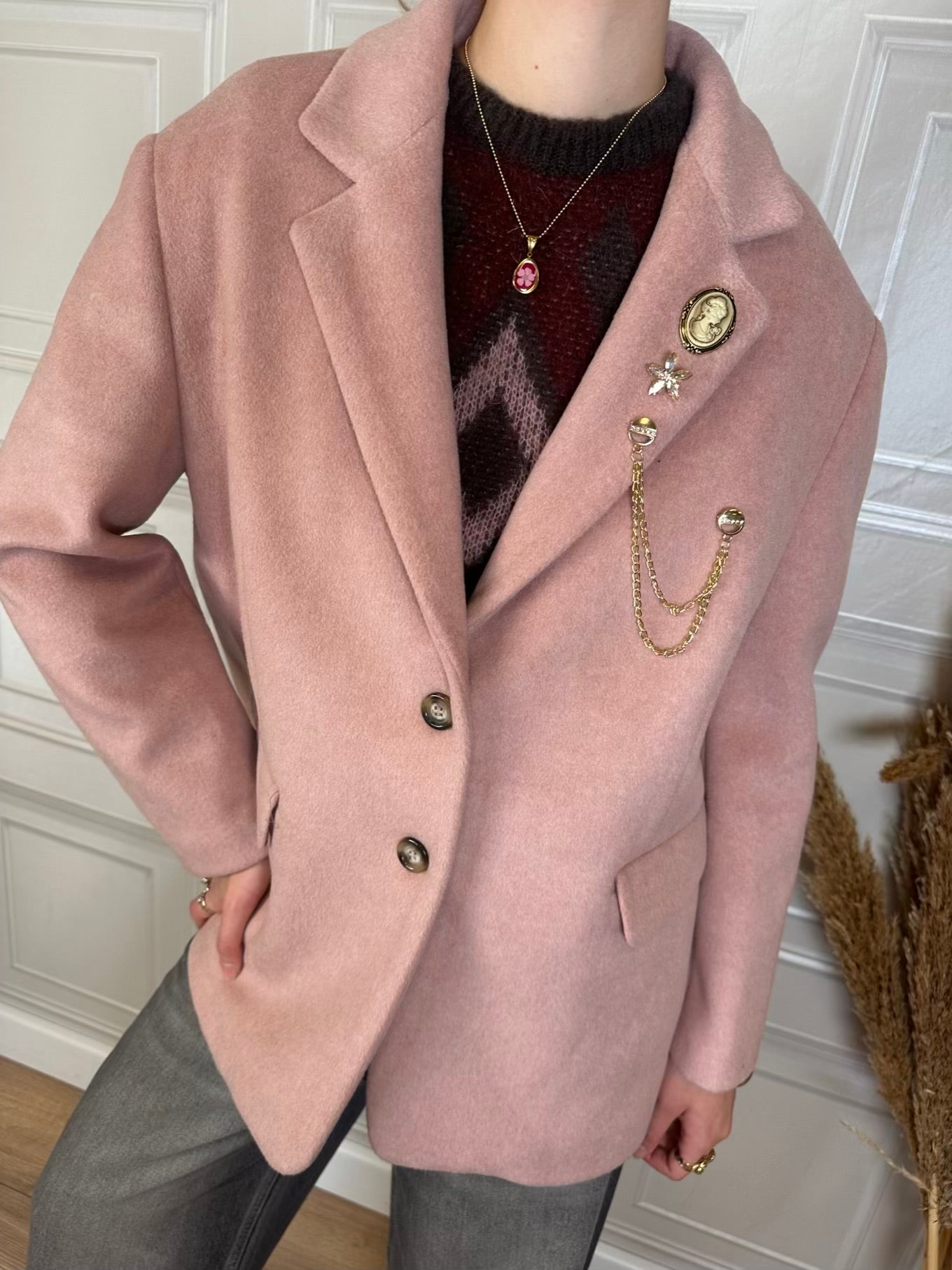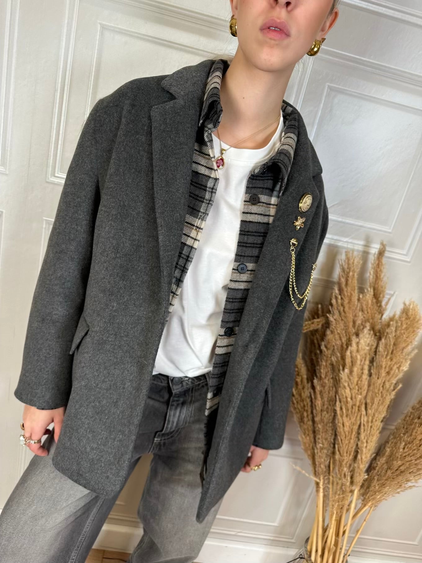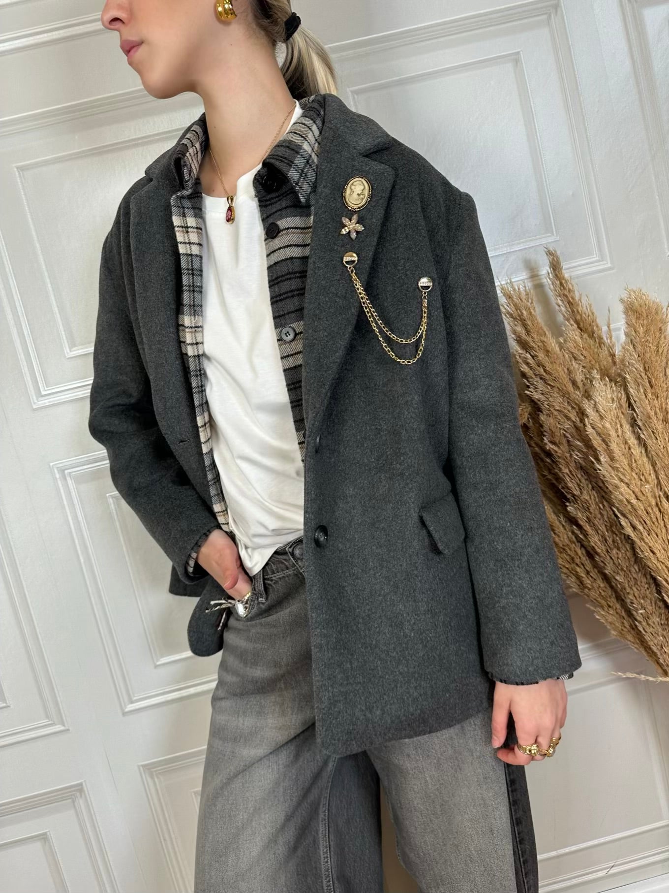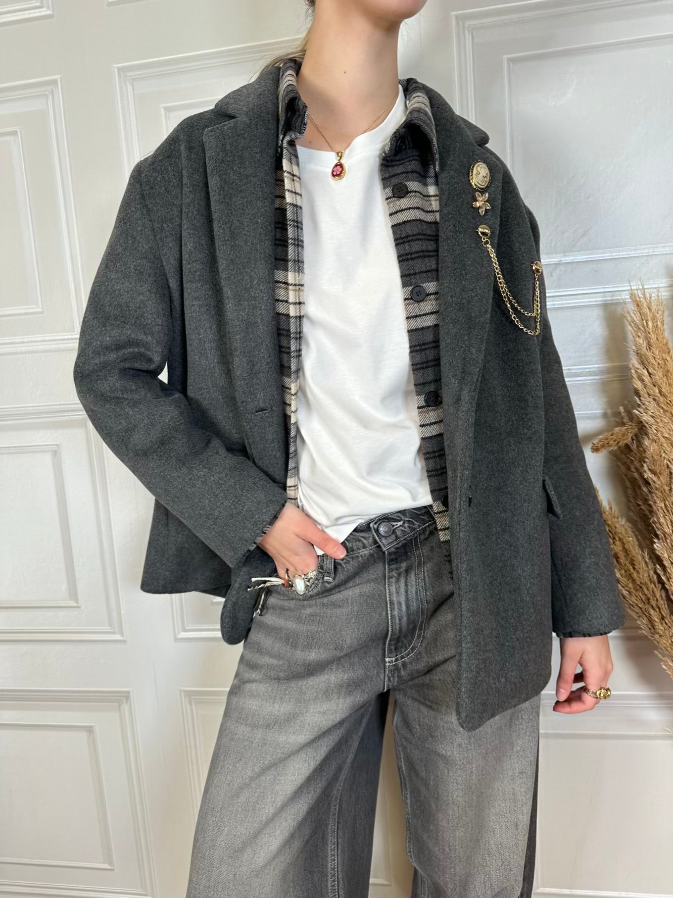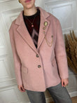 Cappotto in morbido pannetto. Taschine con patta . chiusura a due bottoni sul davanti. Dettaglio di spille sul colletto. Foderato internamente.