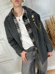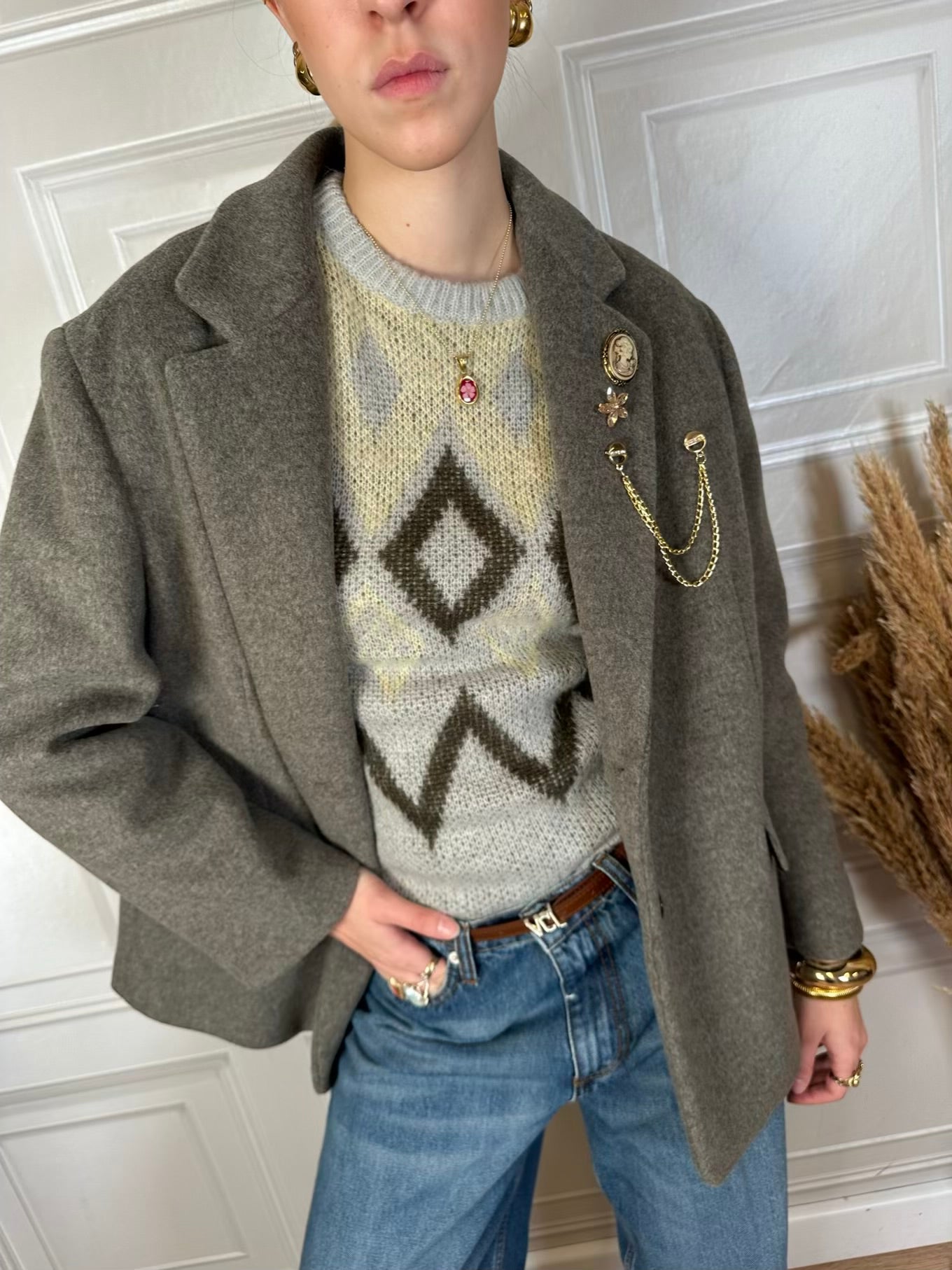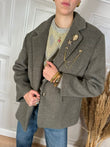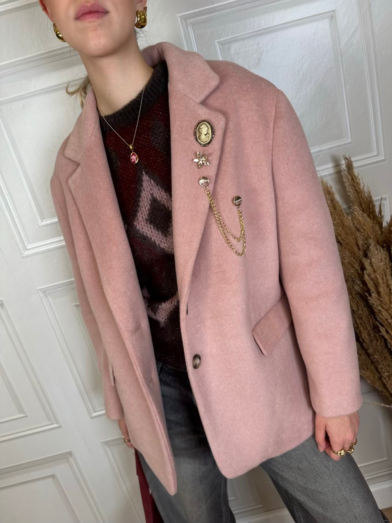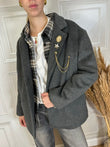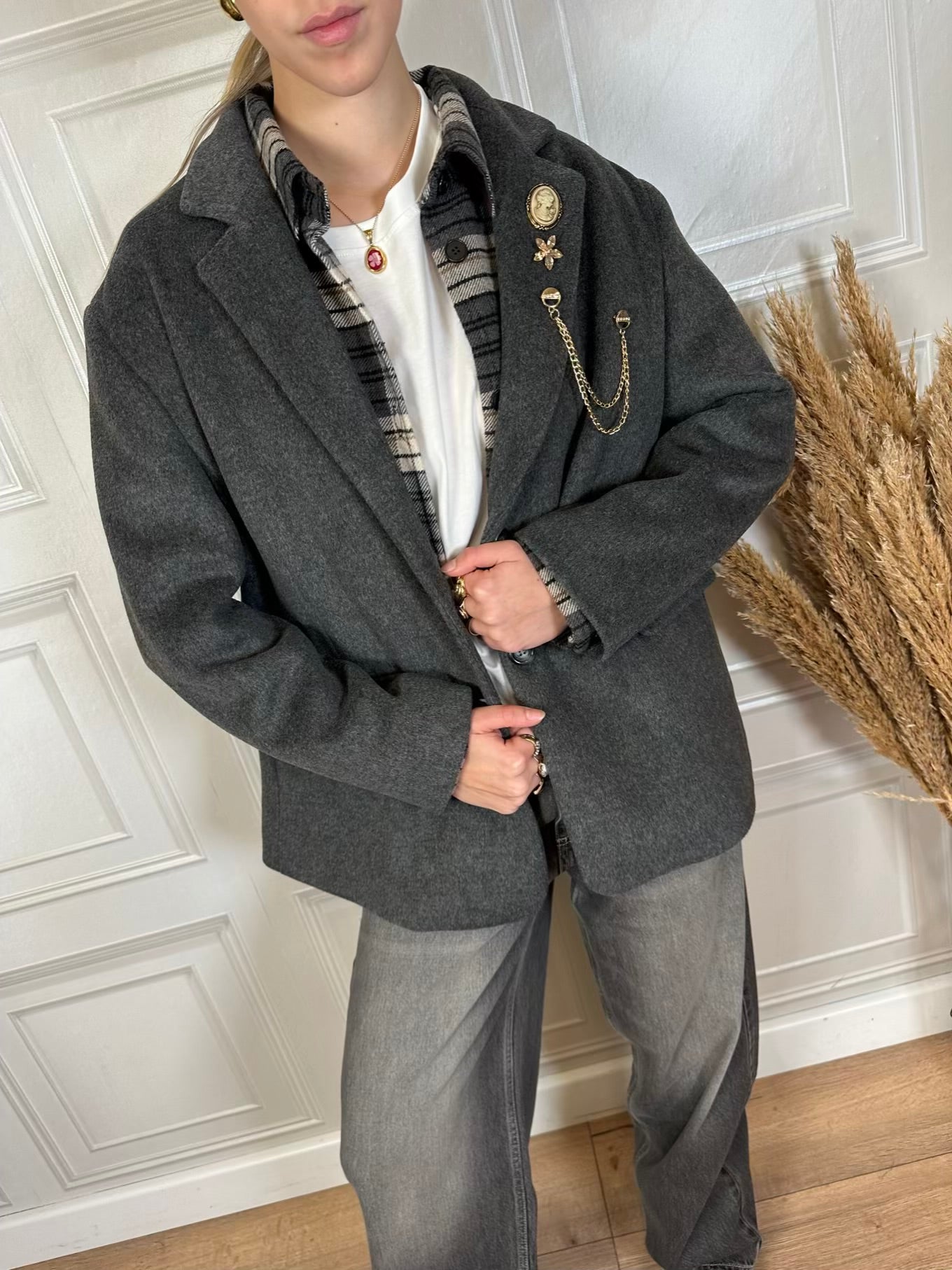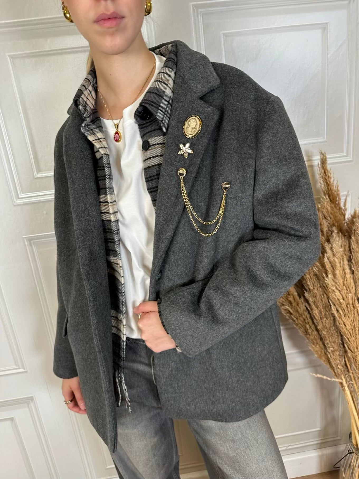 Cappotto in morbido pannetto. Taschine con patta . chiusura a due bottoni sul davanti. Dettaglio di spille sul colletto. Foderato internamente.