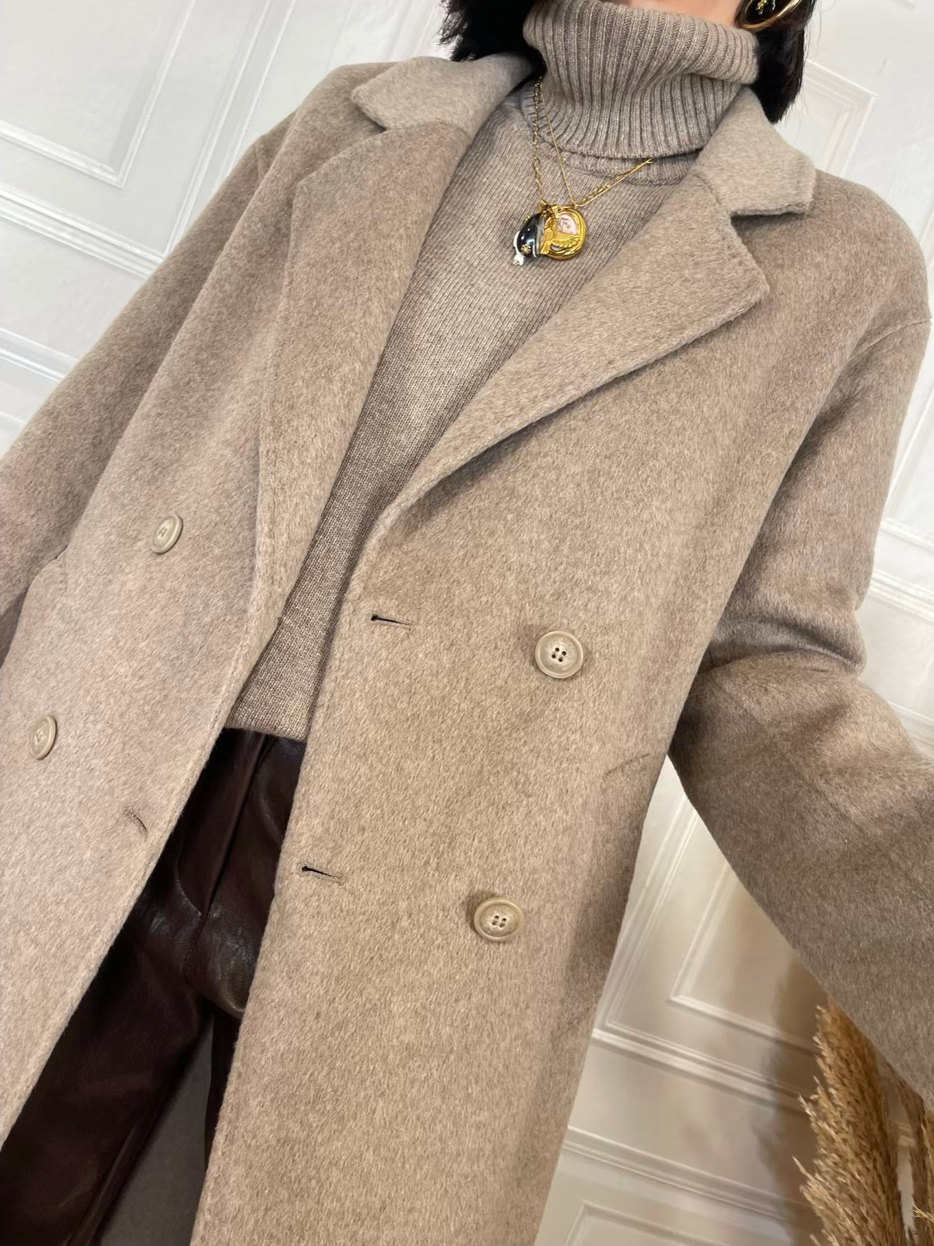 Cappotto hand Made a doppiopetto. Modello con due tasche laterali, chiusura con bottoni sul davanti. Spacchetto sul retro.