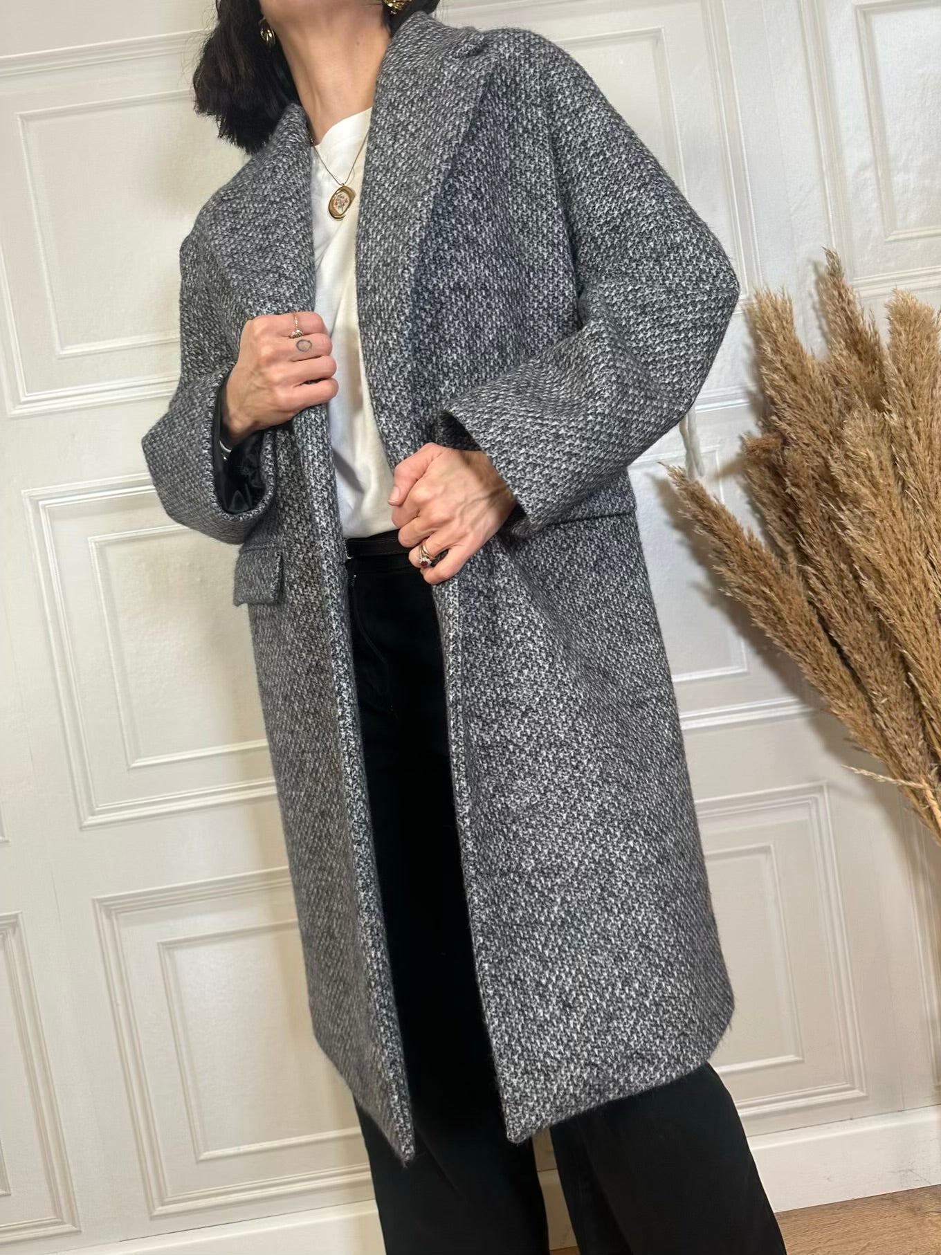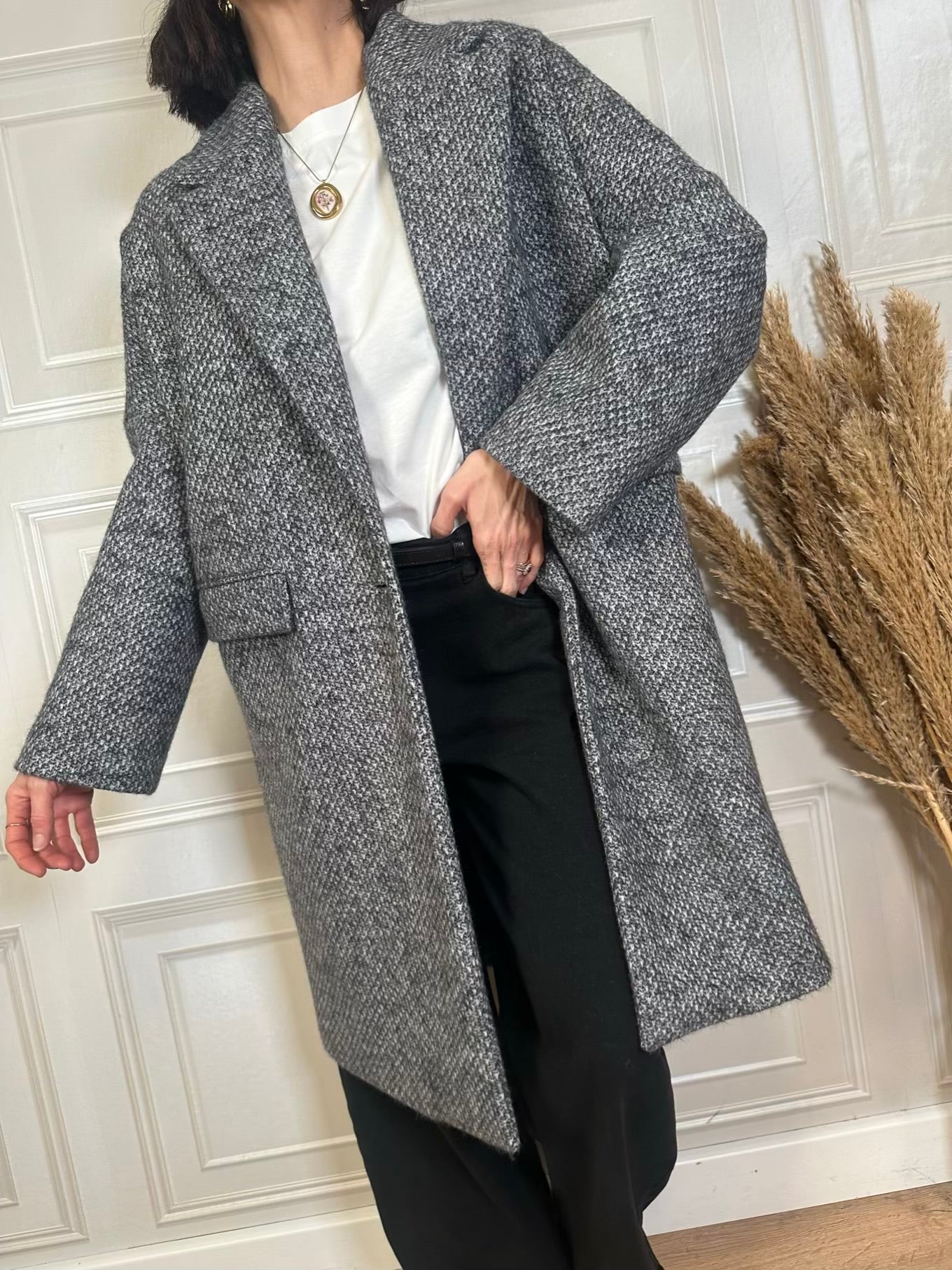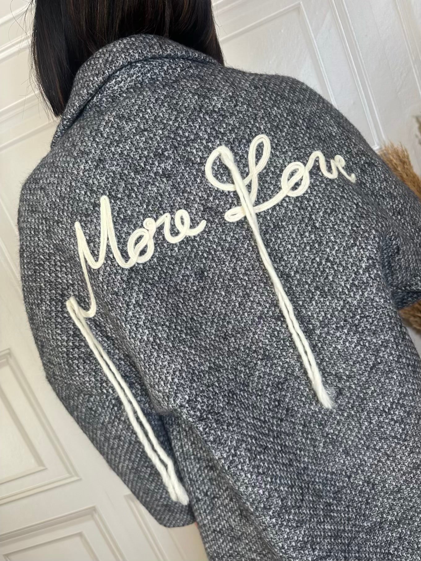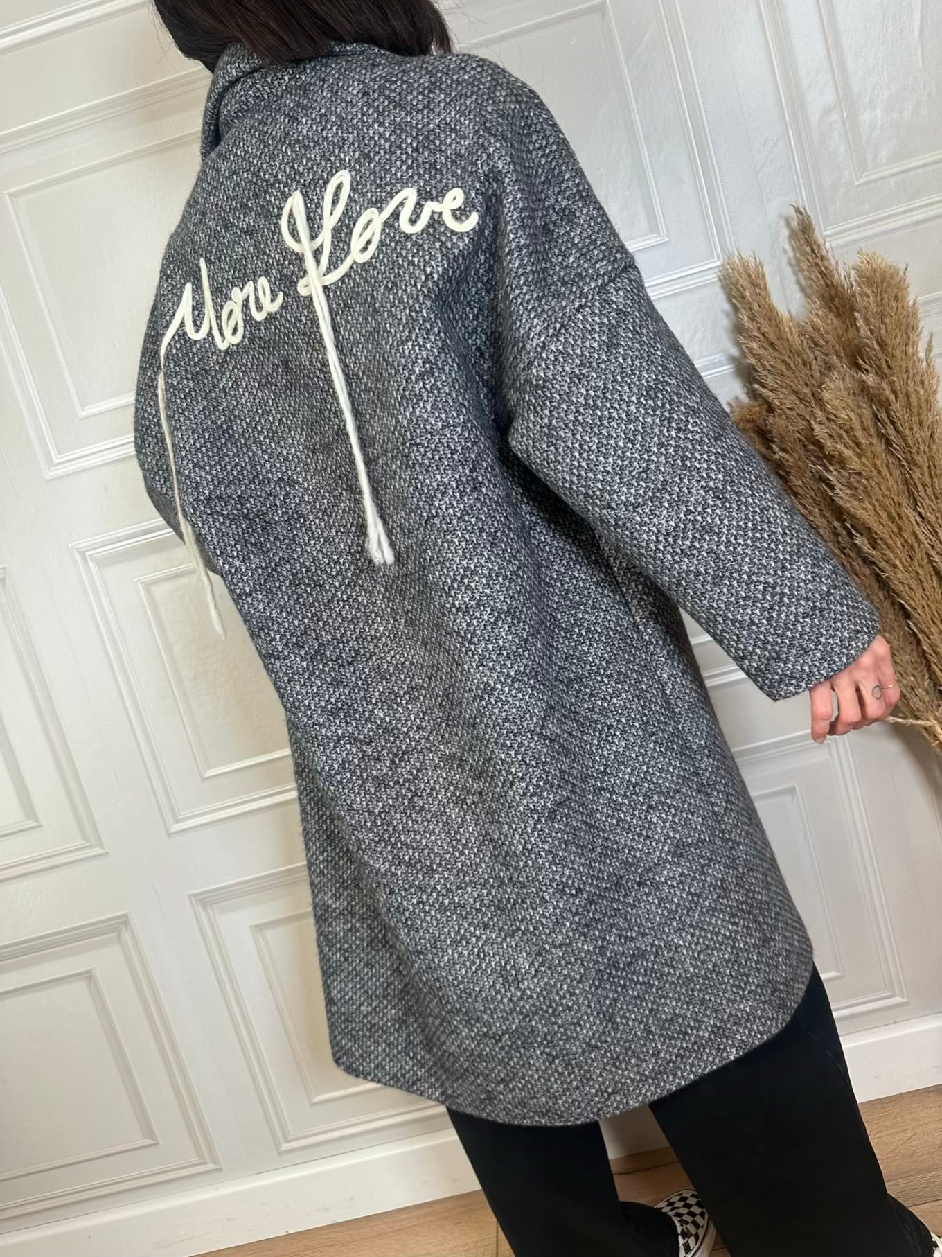 Cappotto spinato con fodera interna. Scritta ricamata sul retro. Modello ovetro con manica raglan, collo revers e chiusura a due bottoni. Tasche sul davanti. Vestibilità regolare. In foto taglia M. Lunghezza da spalla 96cm.