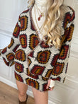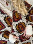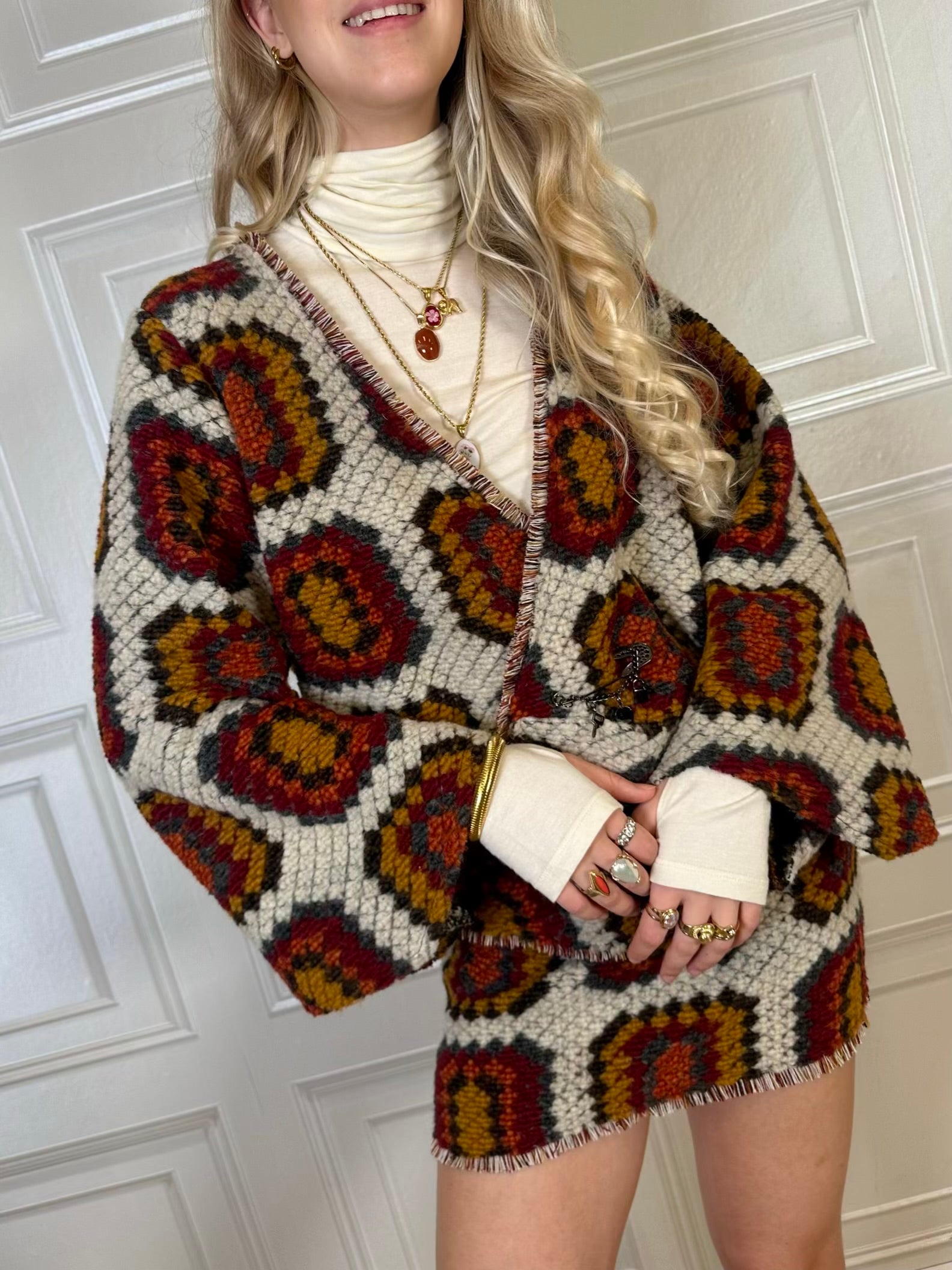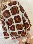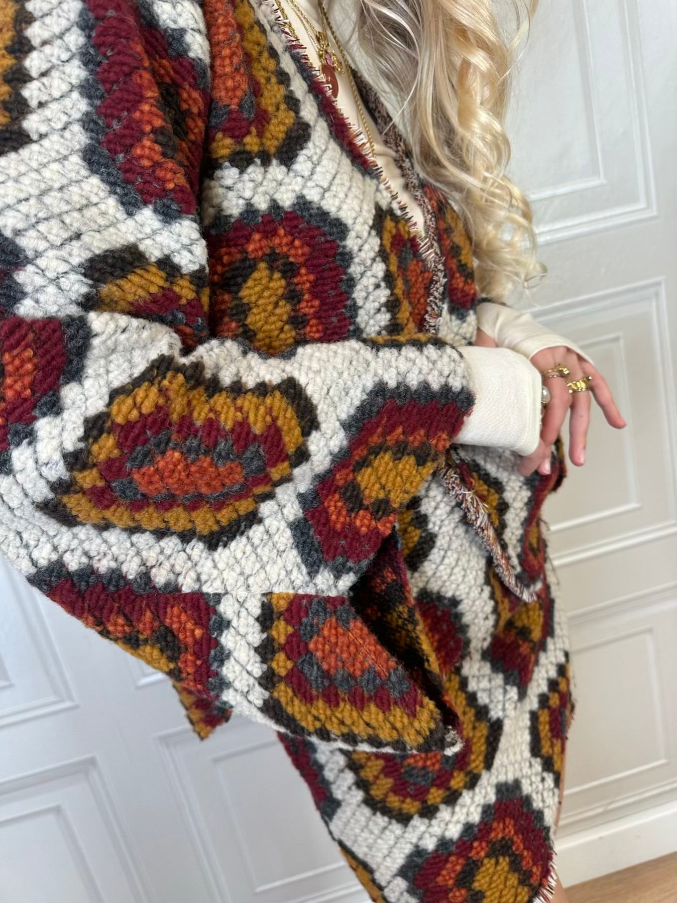 Cappotto fantasia Navajo in morbida maglia. Modello a kimono con spalla scesa e spilla a chiusura in vita. Sui toni del panna, moro, senape e india. spacco su manica.