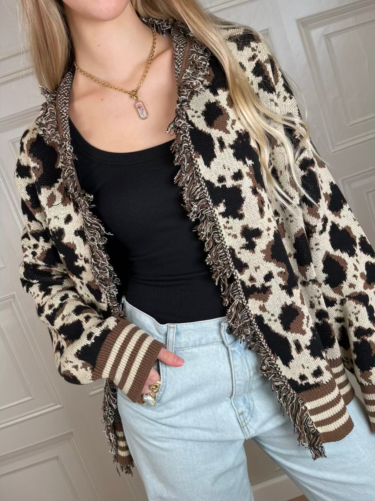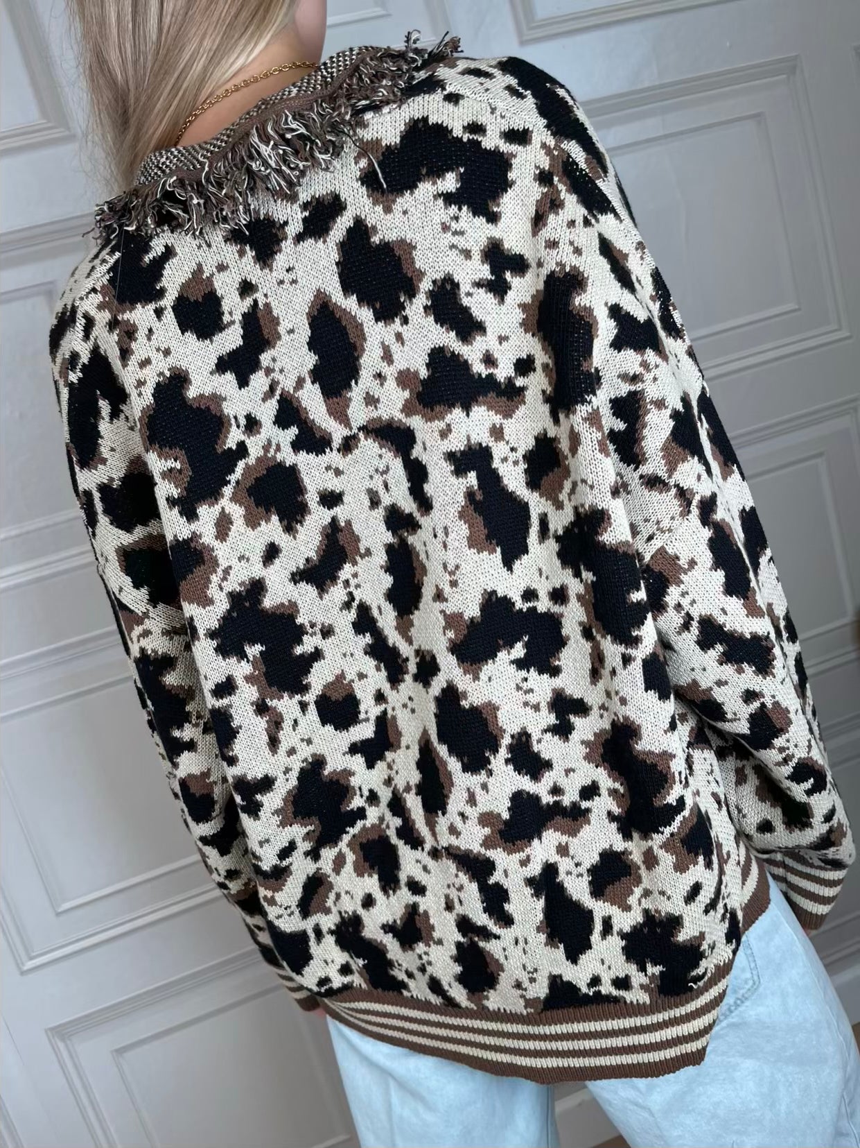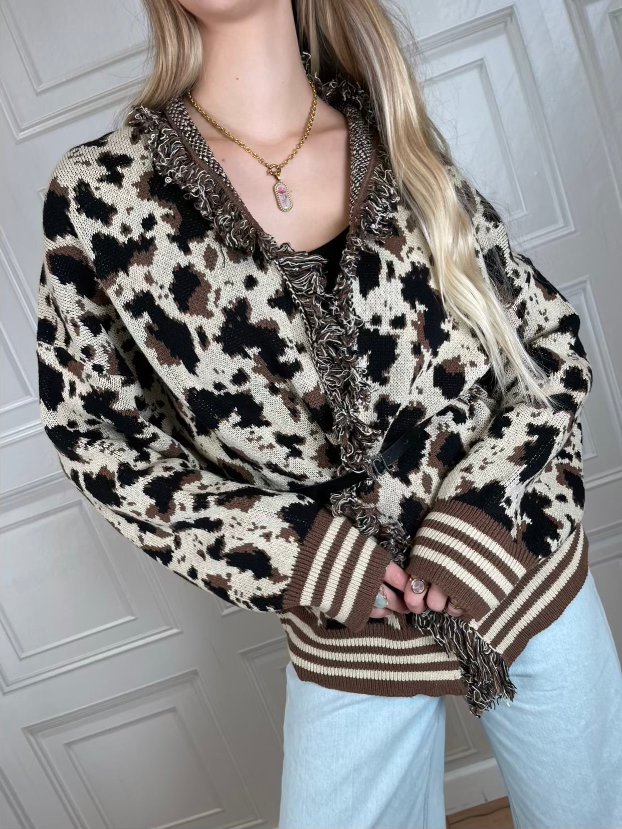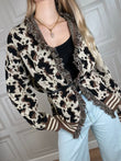 Cardigan a motivo animalier sui toni del nero, caffè e panna. Vestibilità regolare. Dettaglio di frange sulla scollatura. Polsini e fondo a righe. cinturina inclusa. Taglia unica