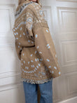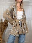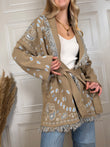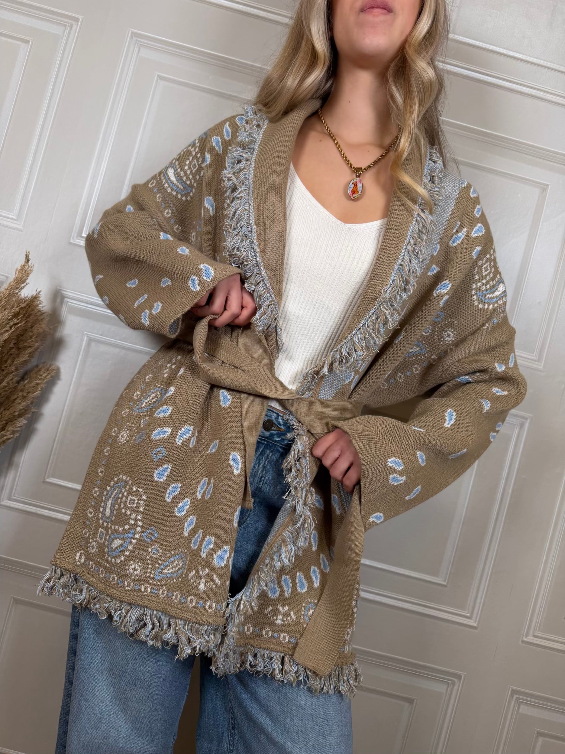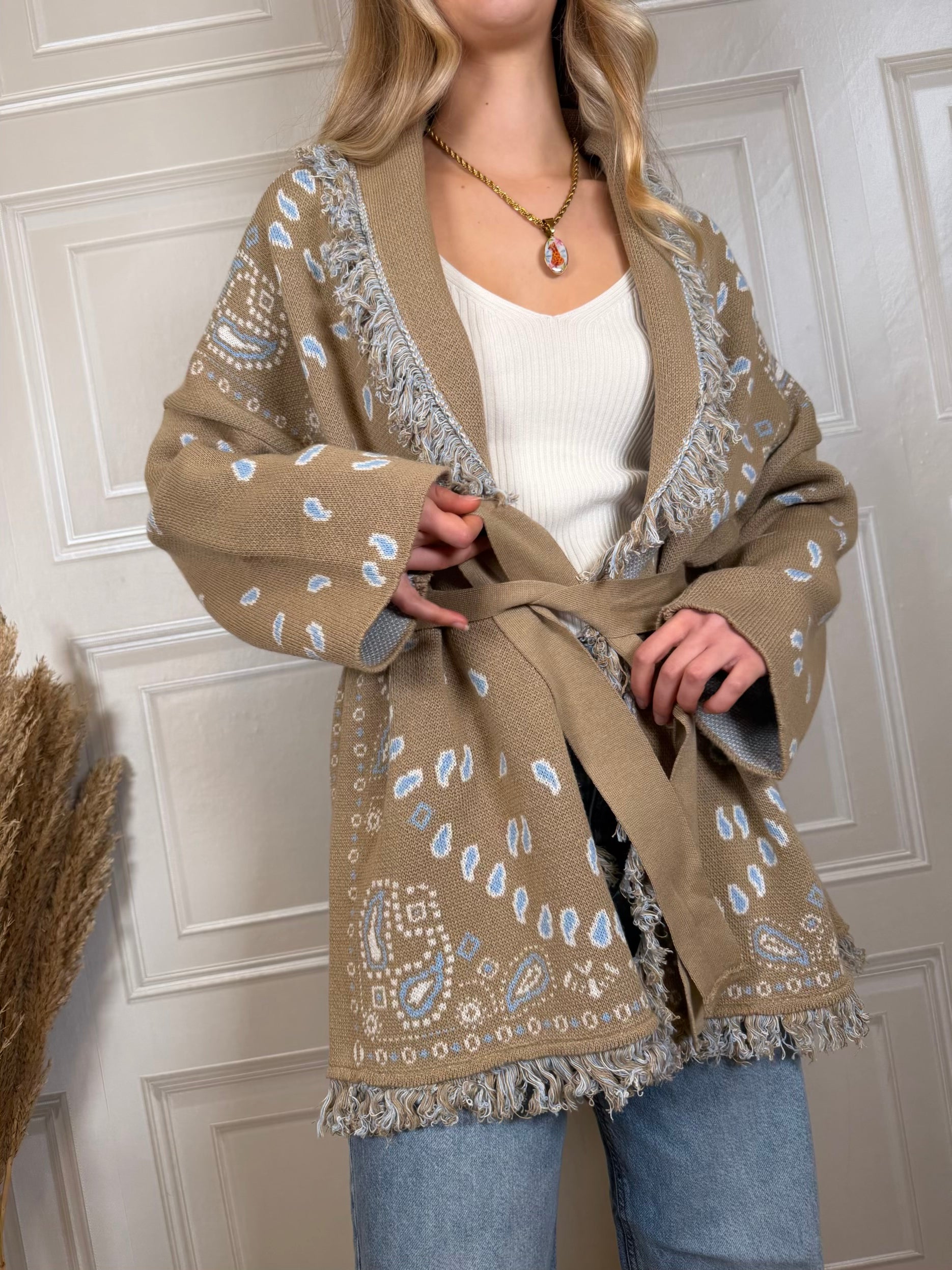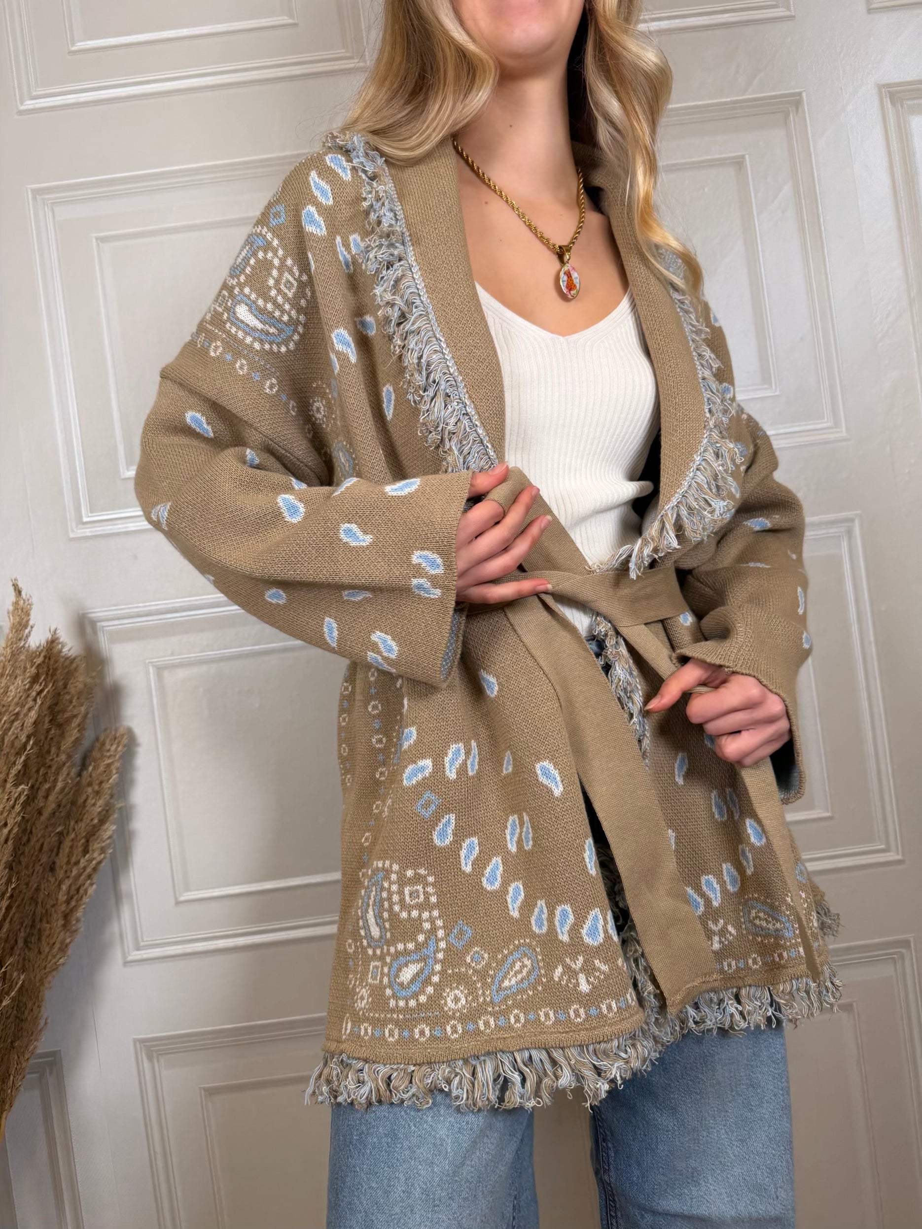 Cardigan sui toni del cammello e azzurro. Vestibilità leggermente morbida. Dettaglio di frangette. Cinturina inclusa. Taglia unica