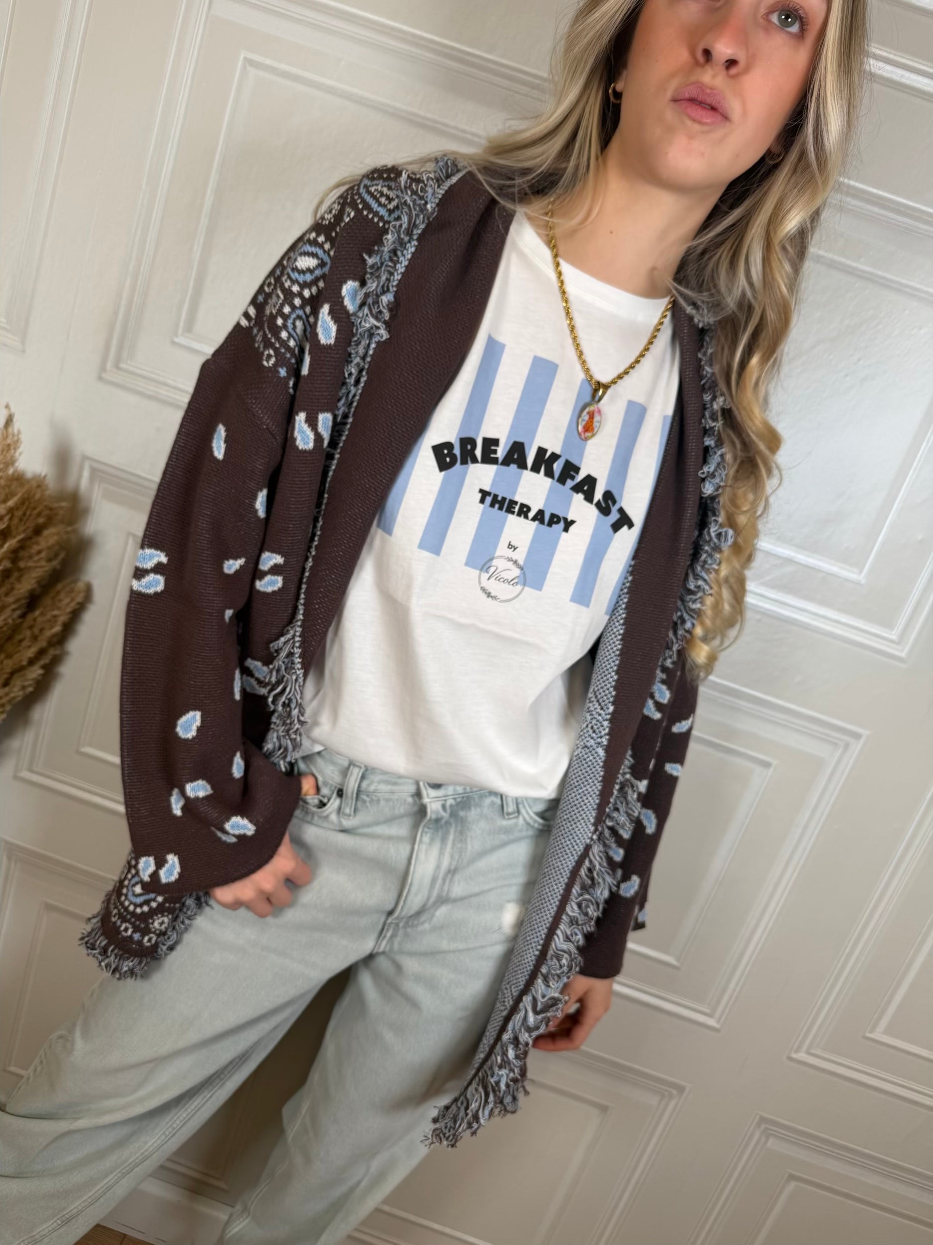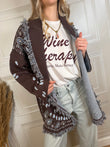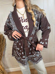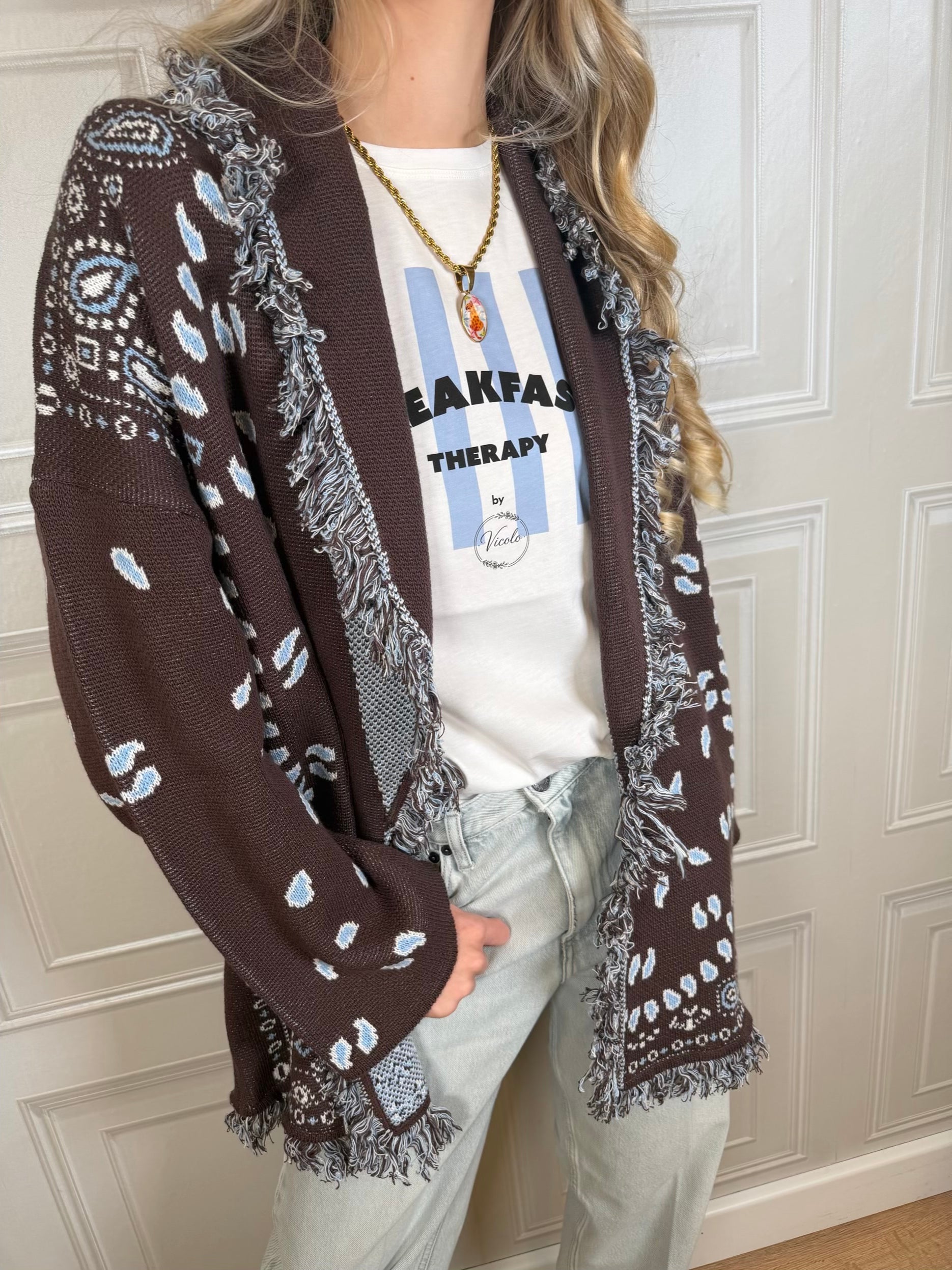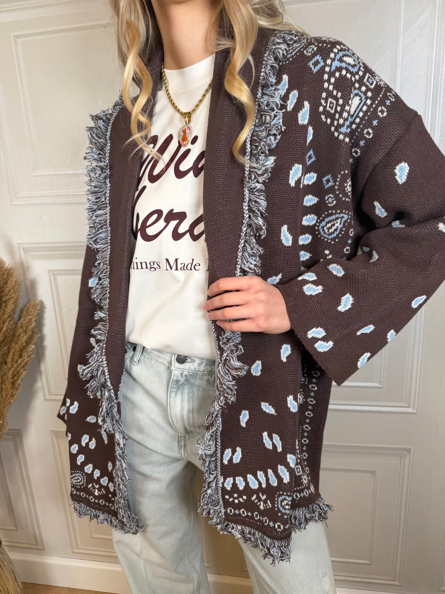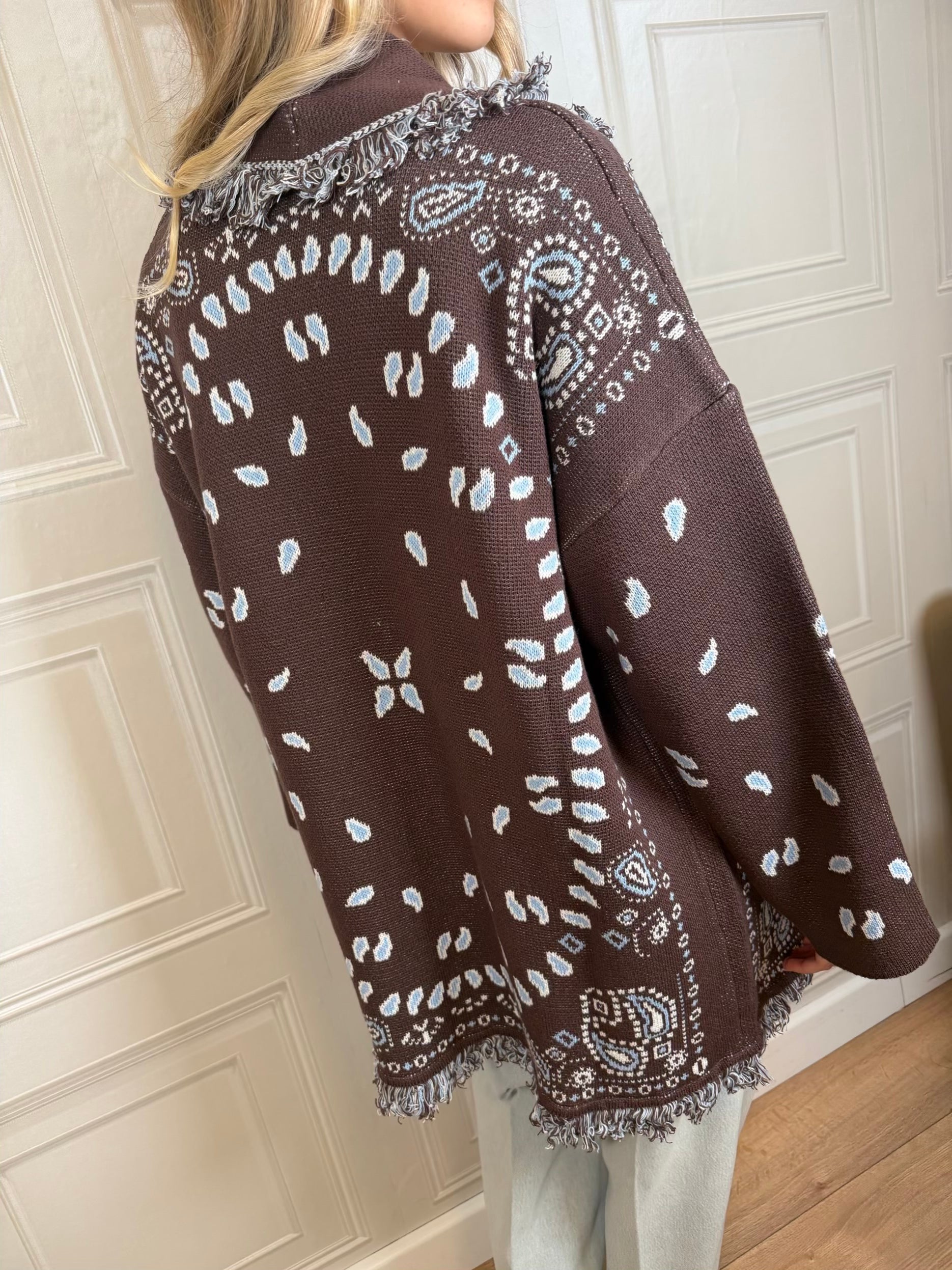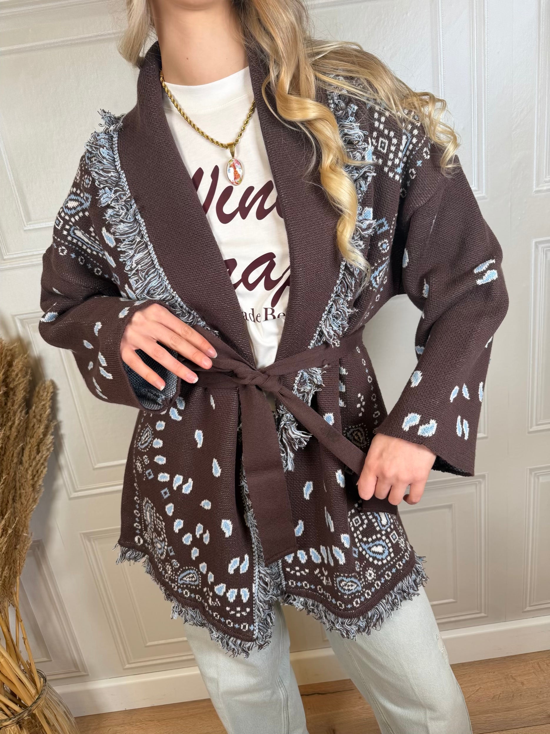 Cardigan sui toni del moro e azzurro. Vestibilità leggermente morbida. Dettaglio di frangette. Cinturina inclusa. Taglia unica
