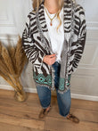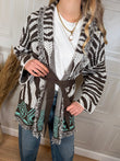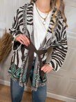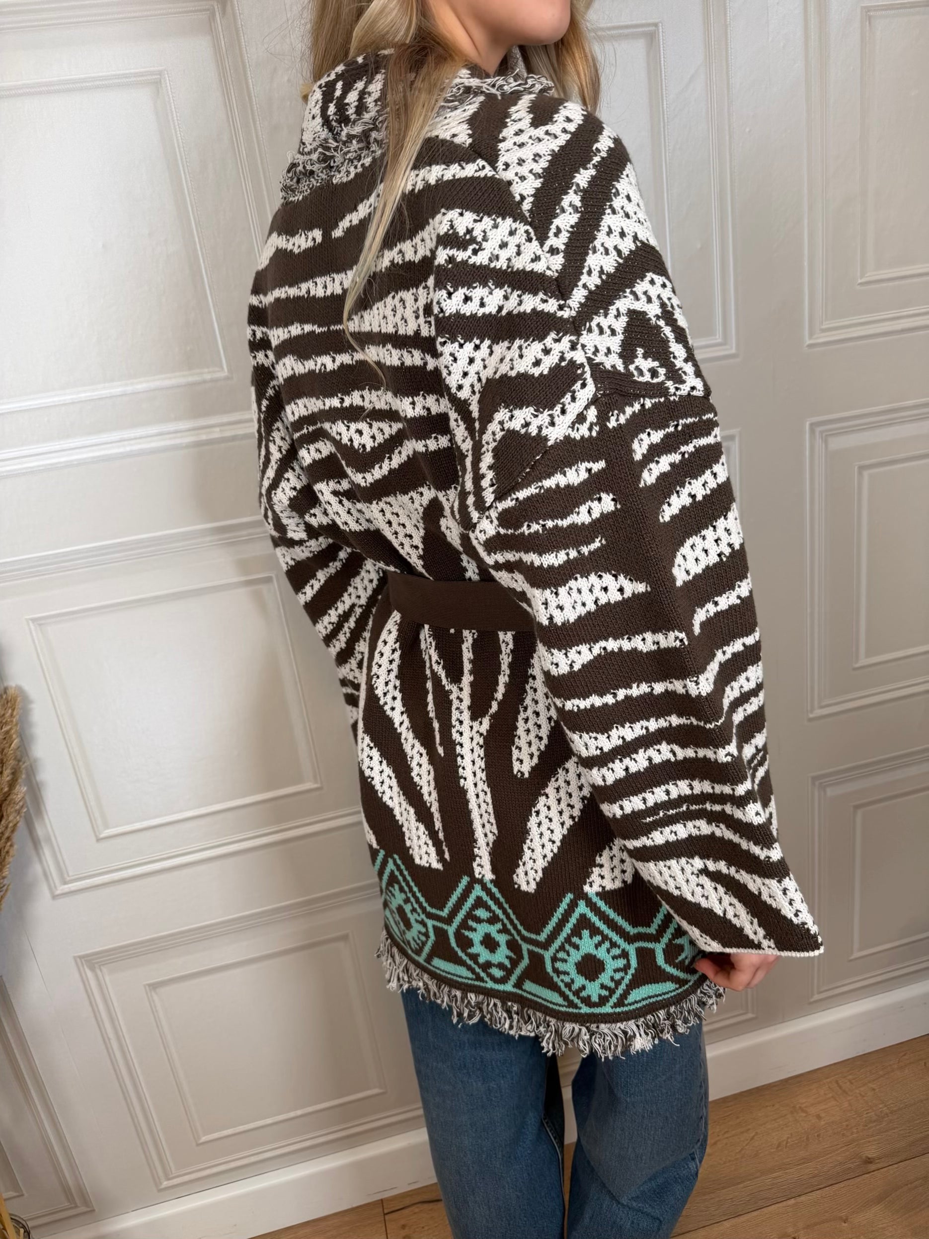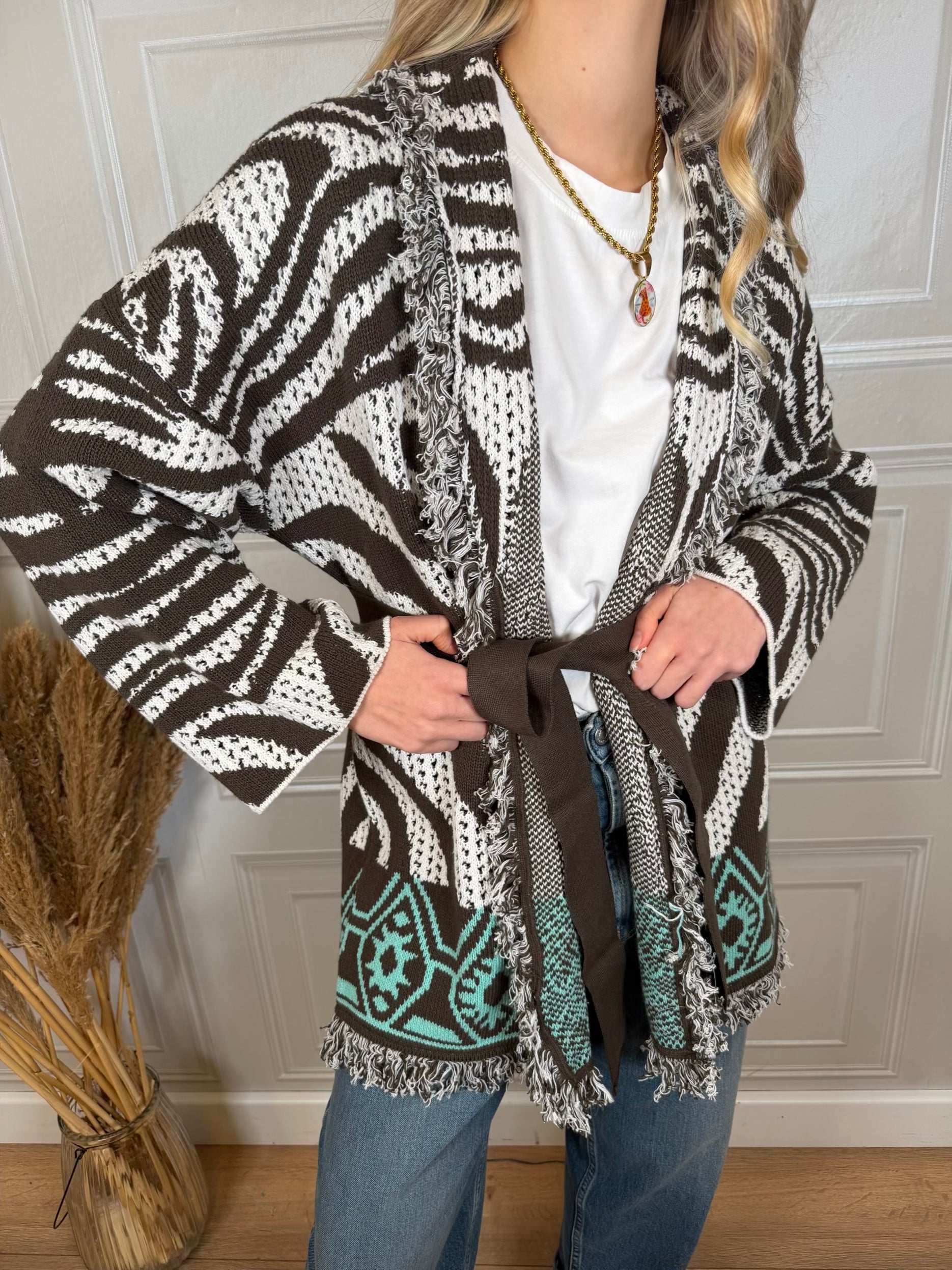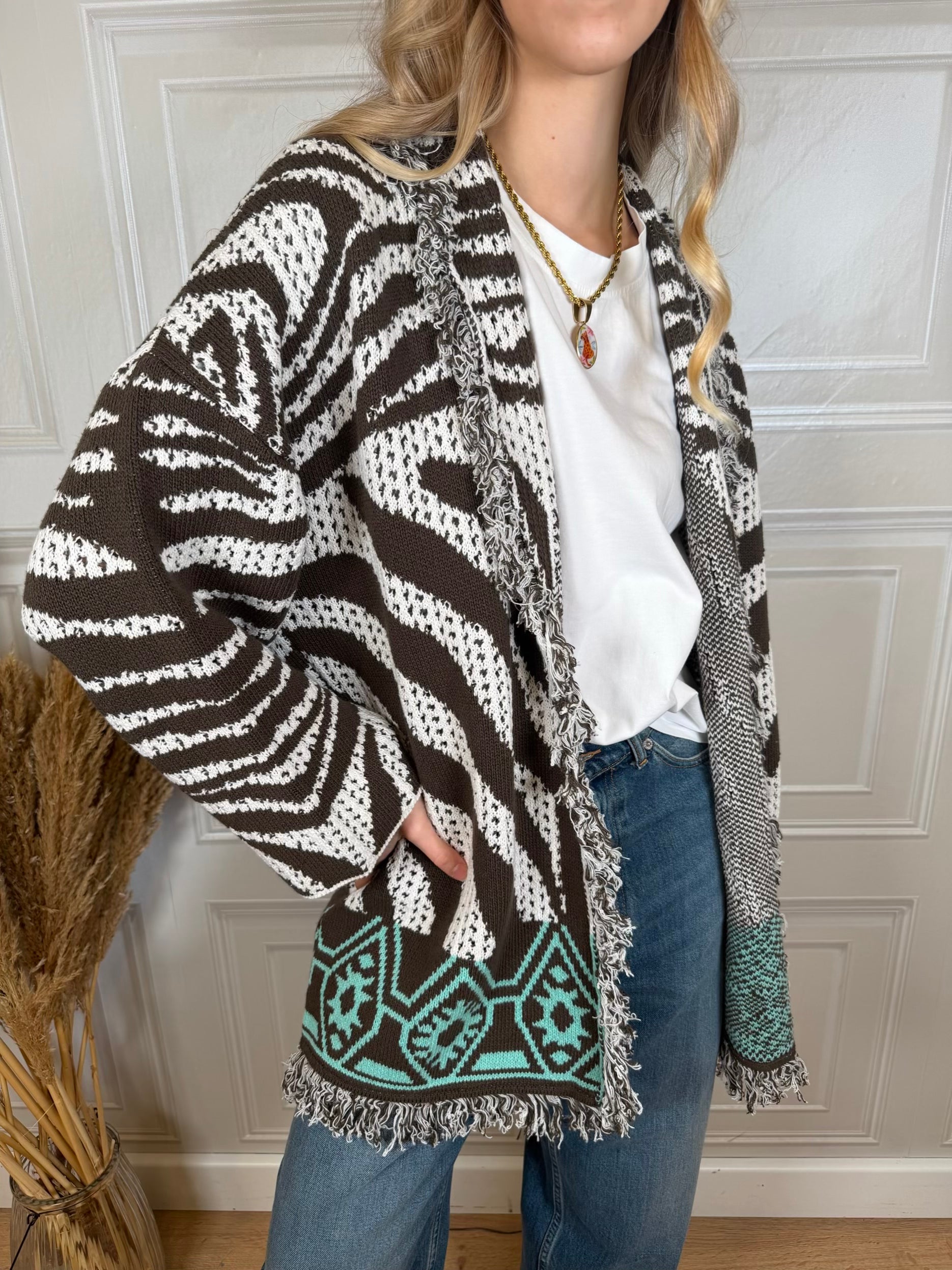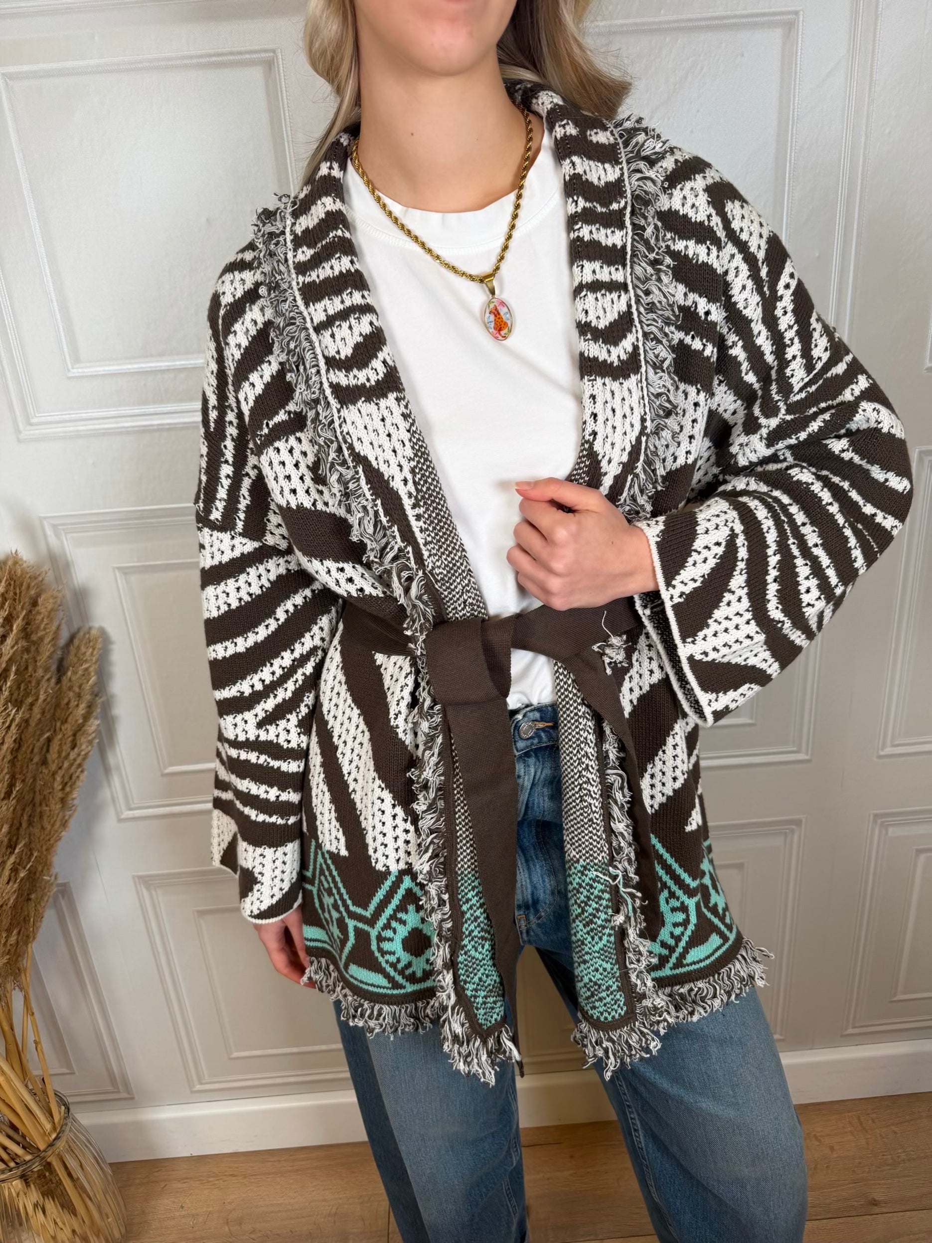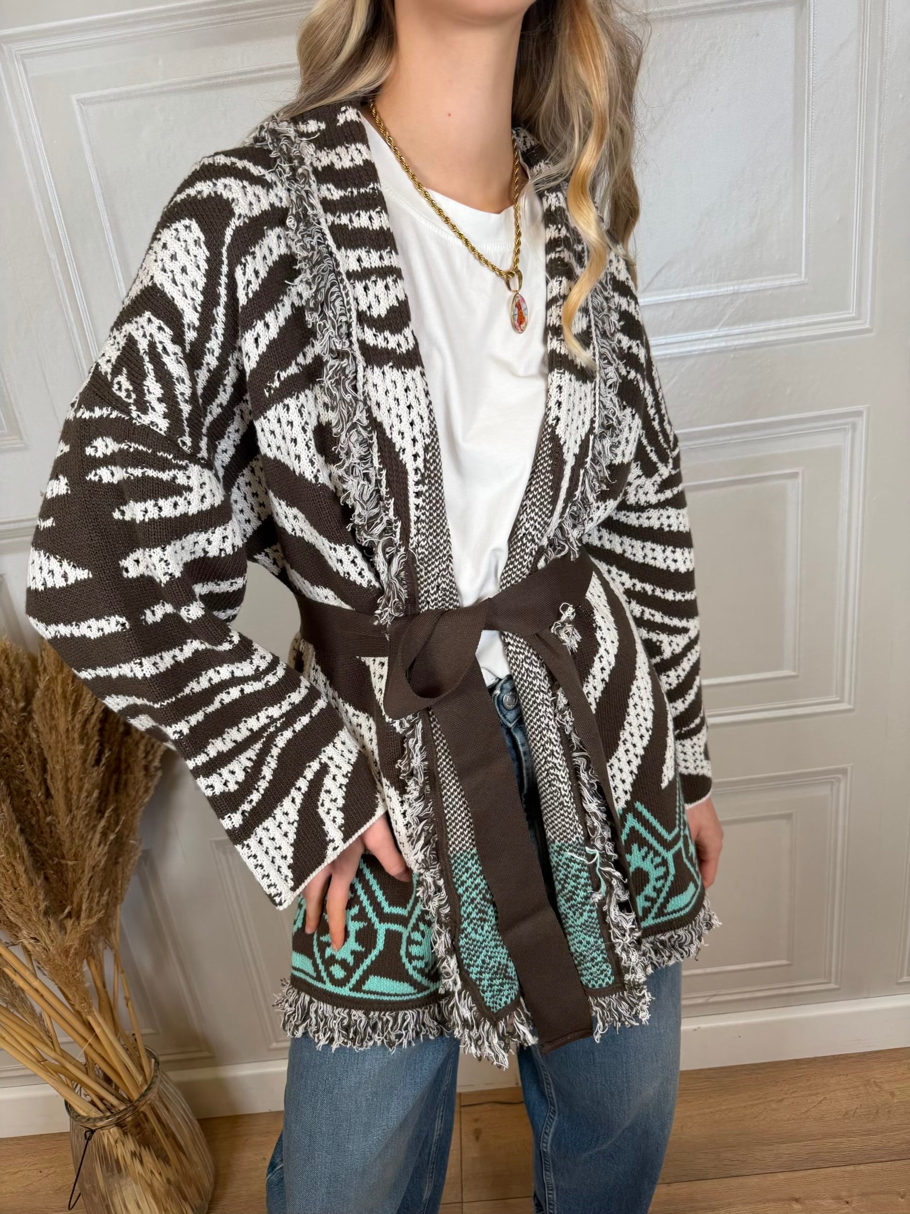 Cardigan zebrato sui toni del moro, panna e verde acqua. Vestibilità regolare. Dettaglio di frange sulla scollatura. cinturino incluso. Taglia unica