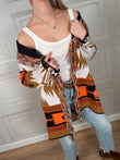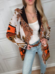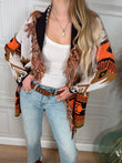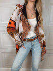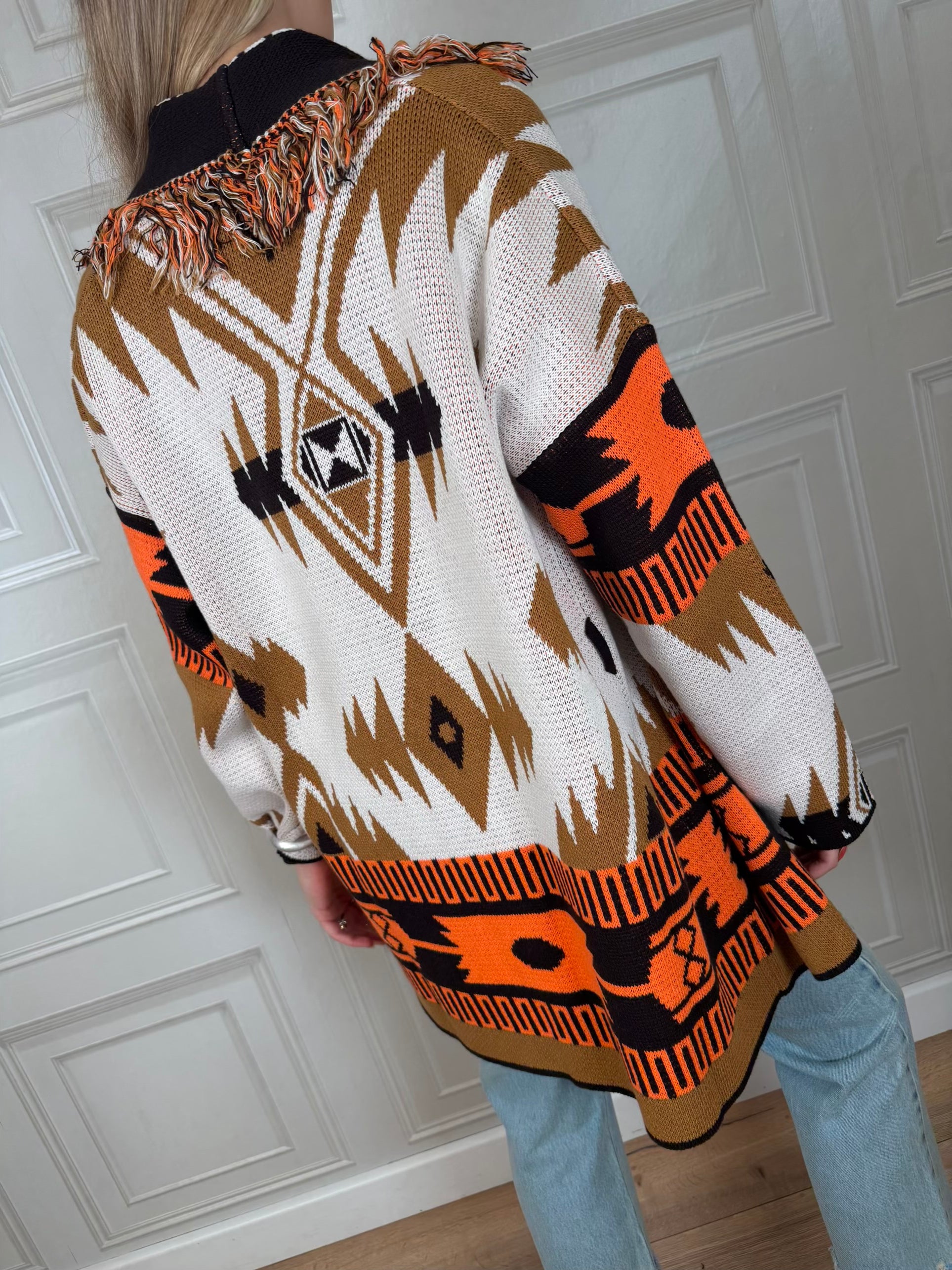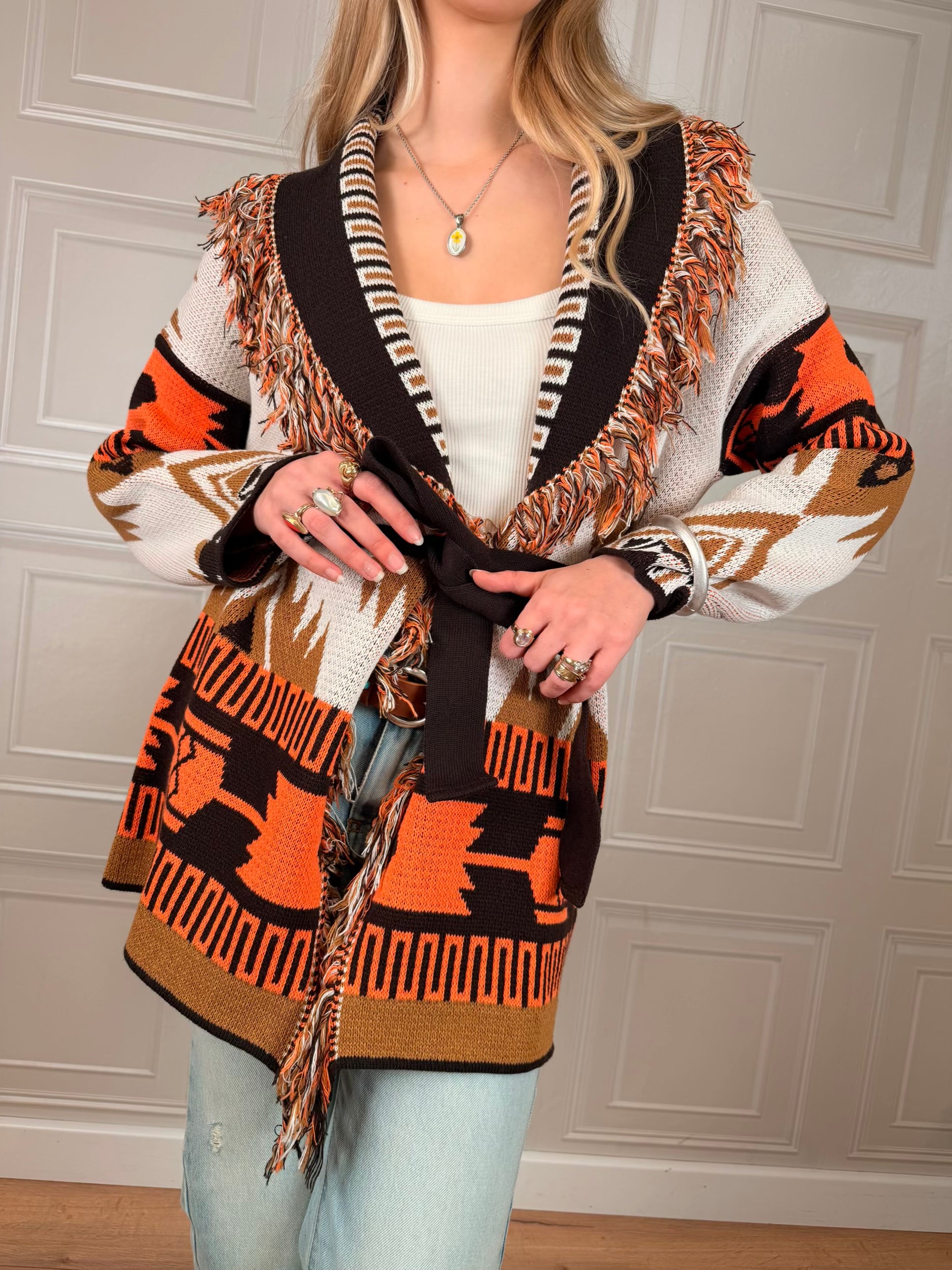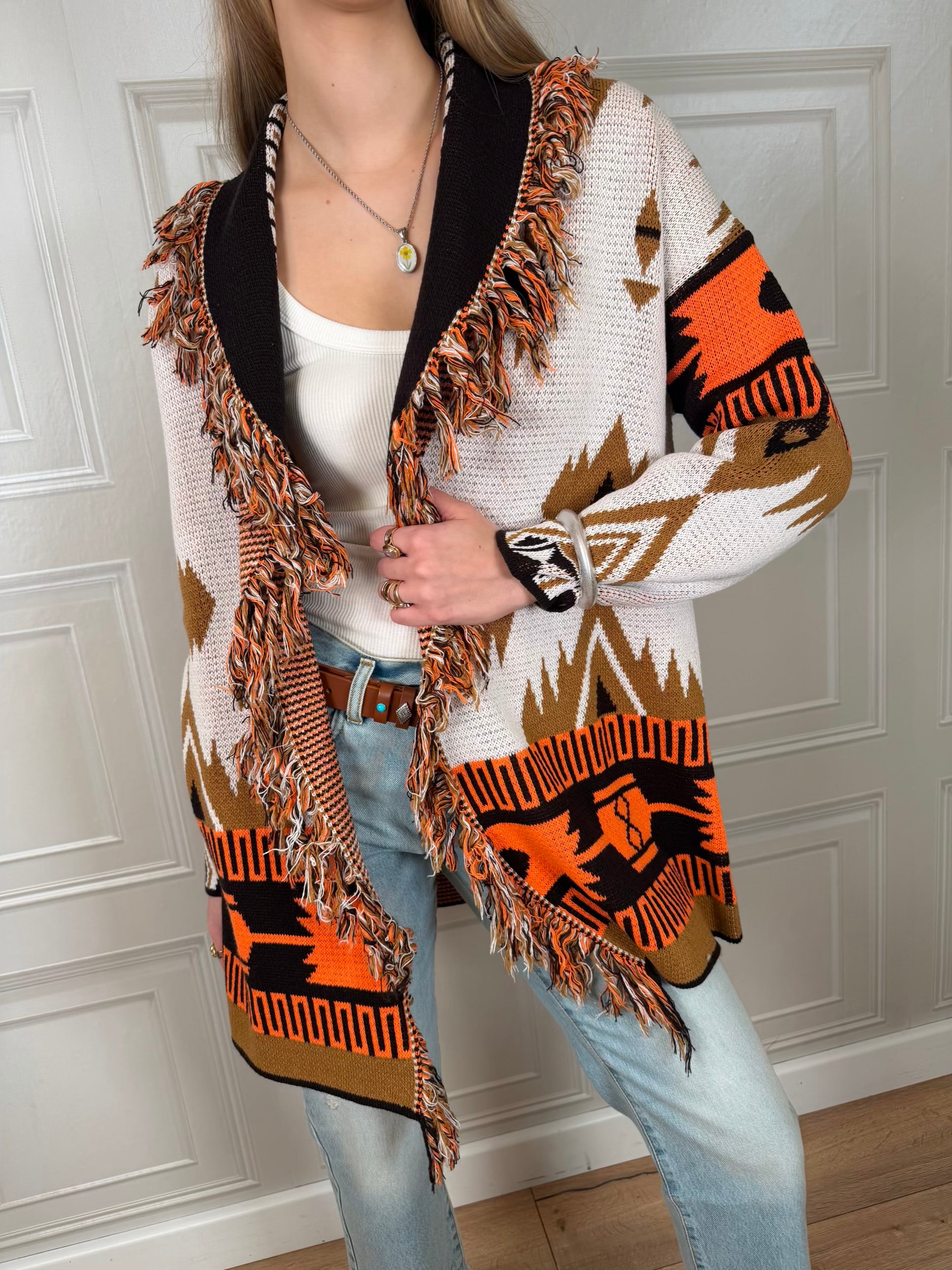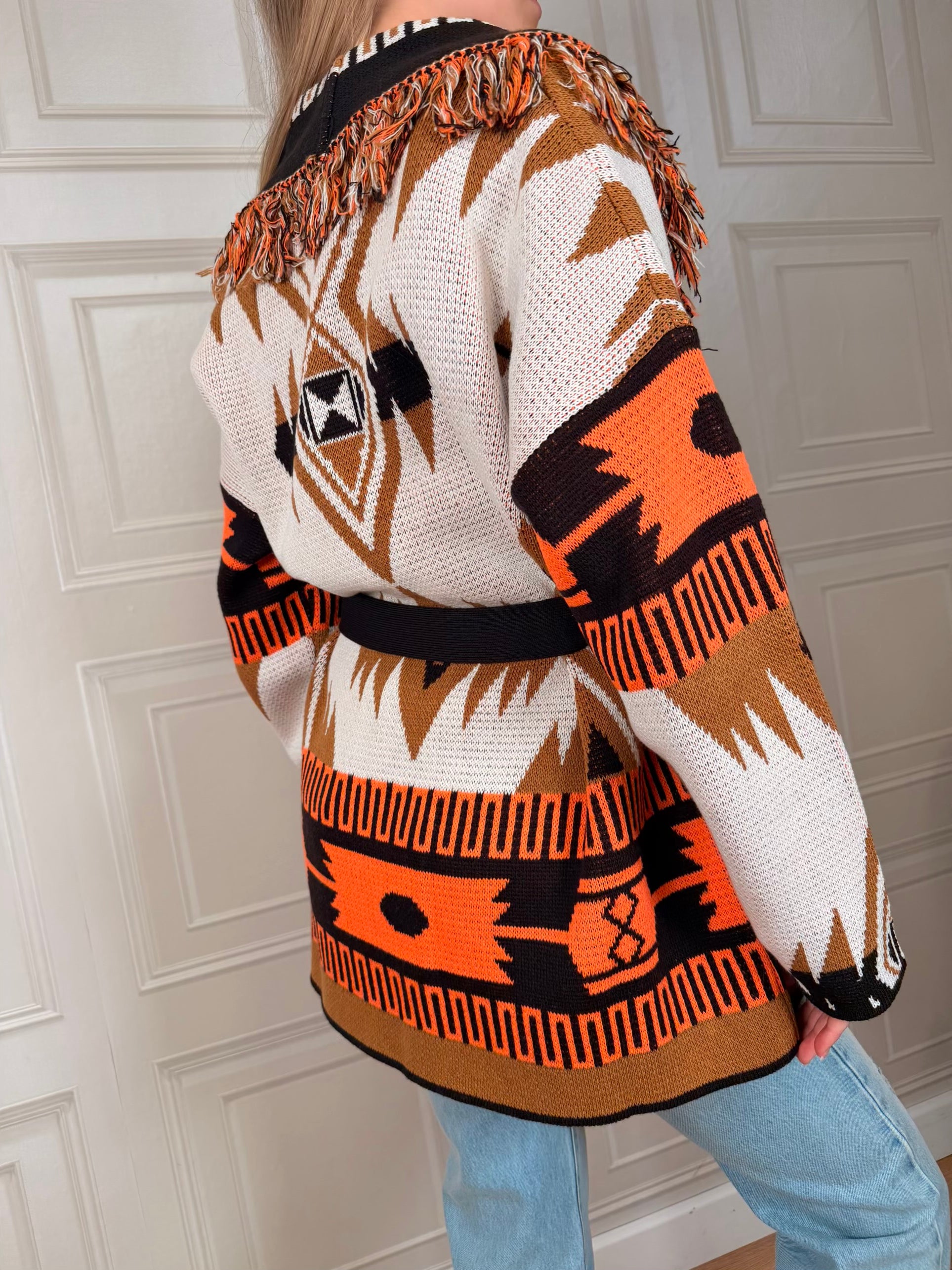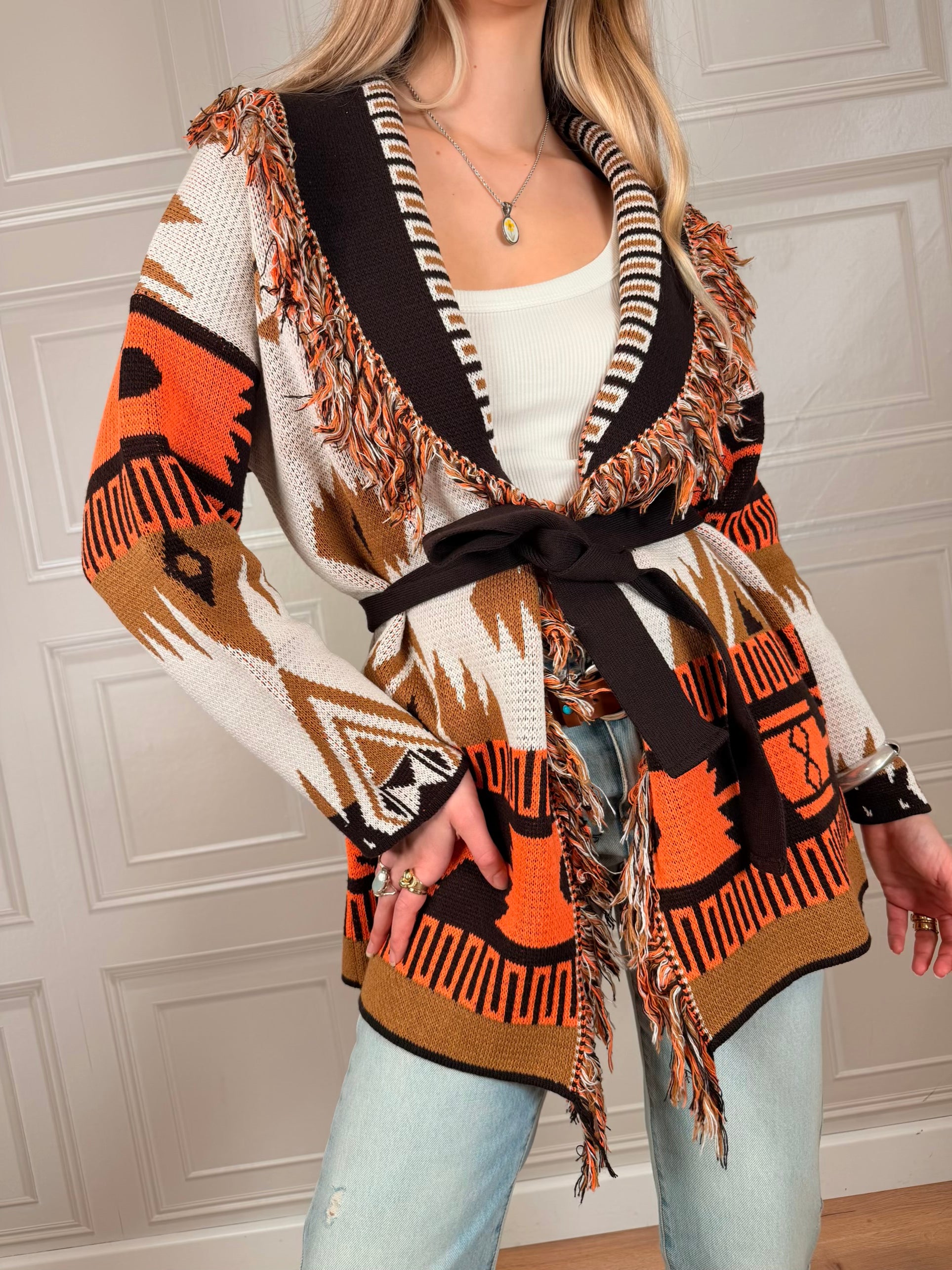 Cardigan sui toni del moro, ocra, panna è arancione. Vestibilità regolare. Dettaglio di frange sulla scollatura. cinturino incluso. Taglia unica