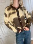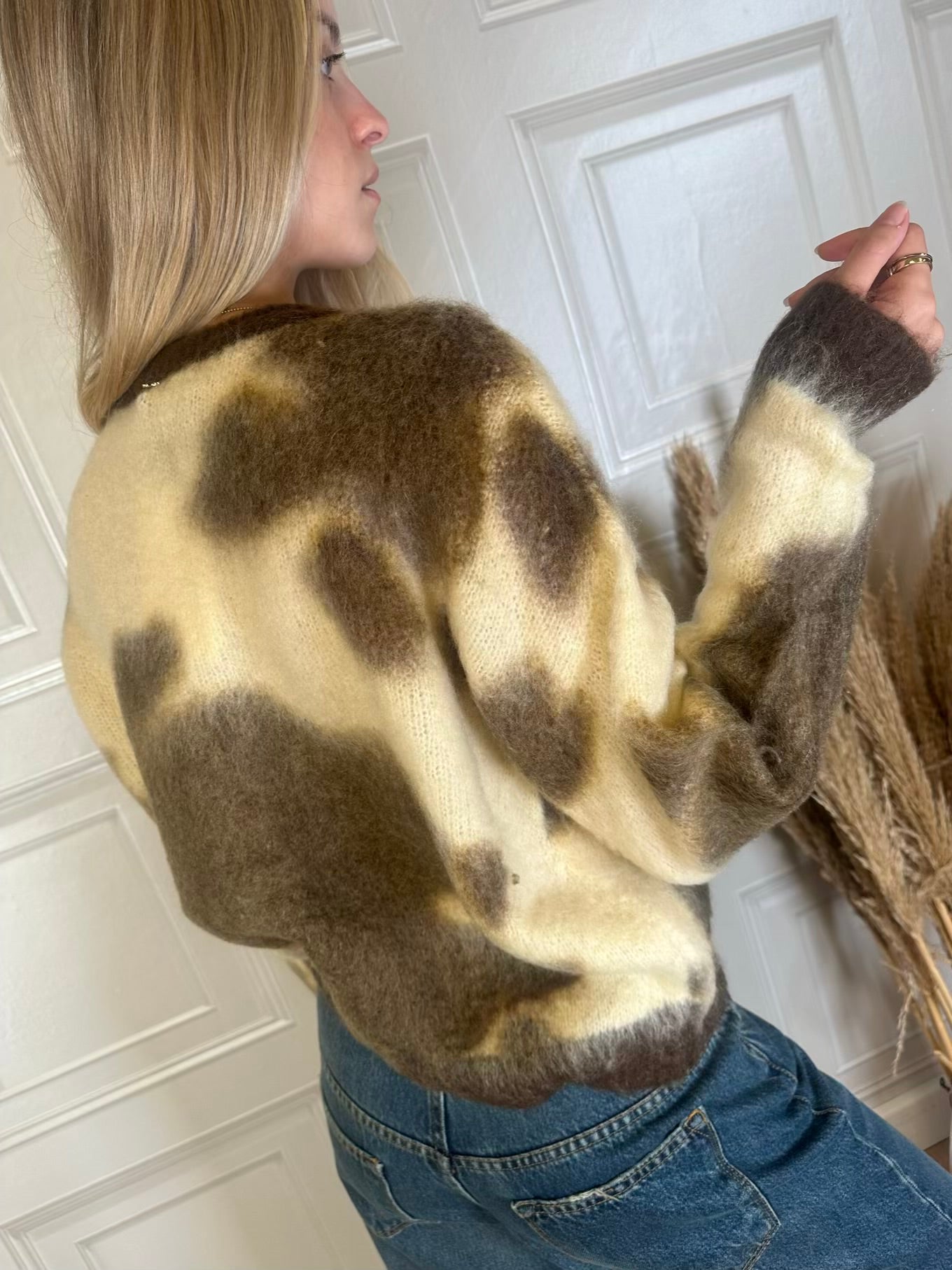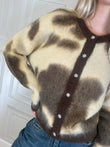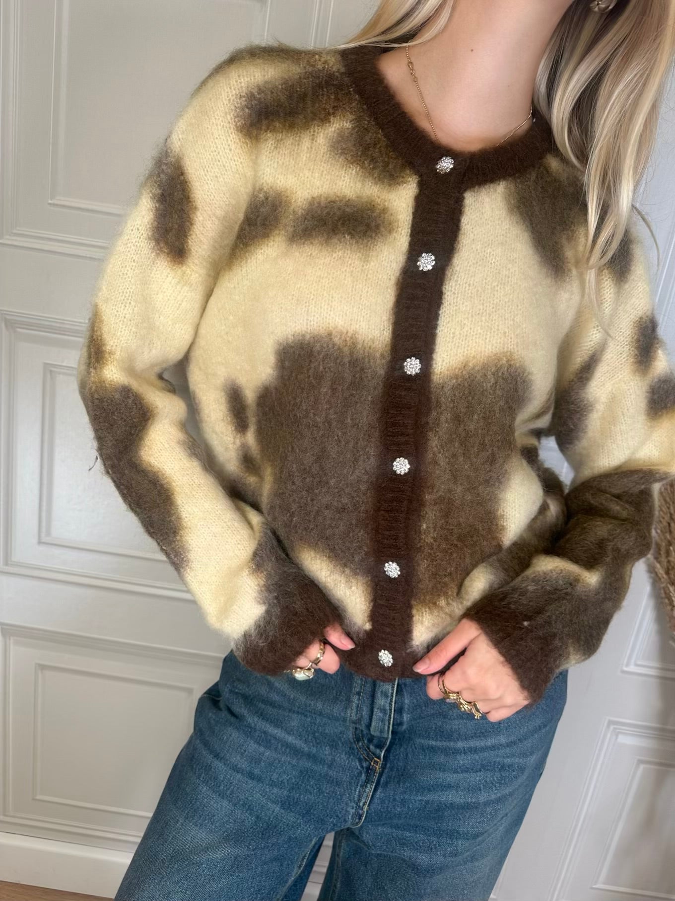 Cardigan fantasia cow in misto mohair Philia Loft. Modello girocollo a manica lunga con polsino sul fondo. Chiusura frontale con bottoni gioiello.