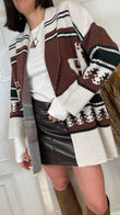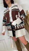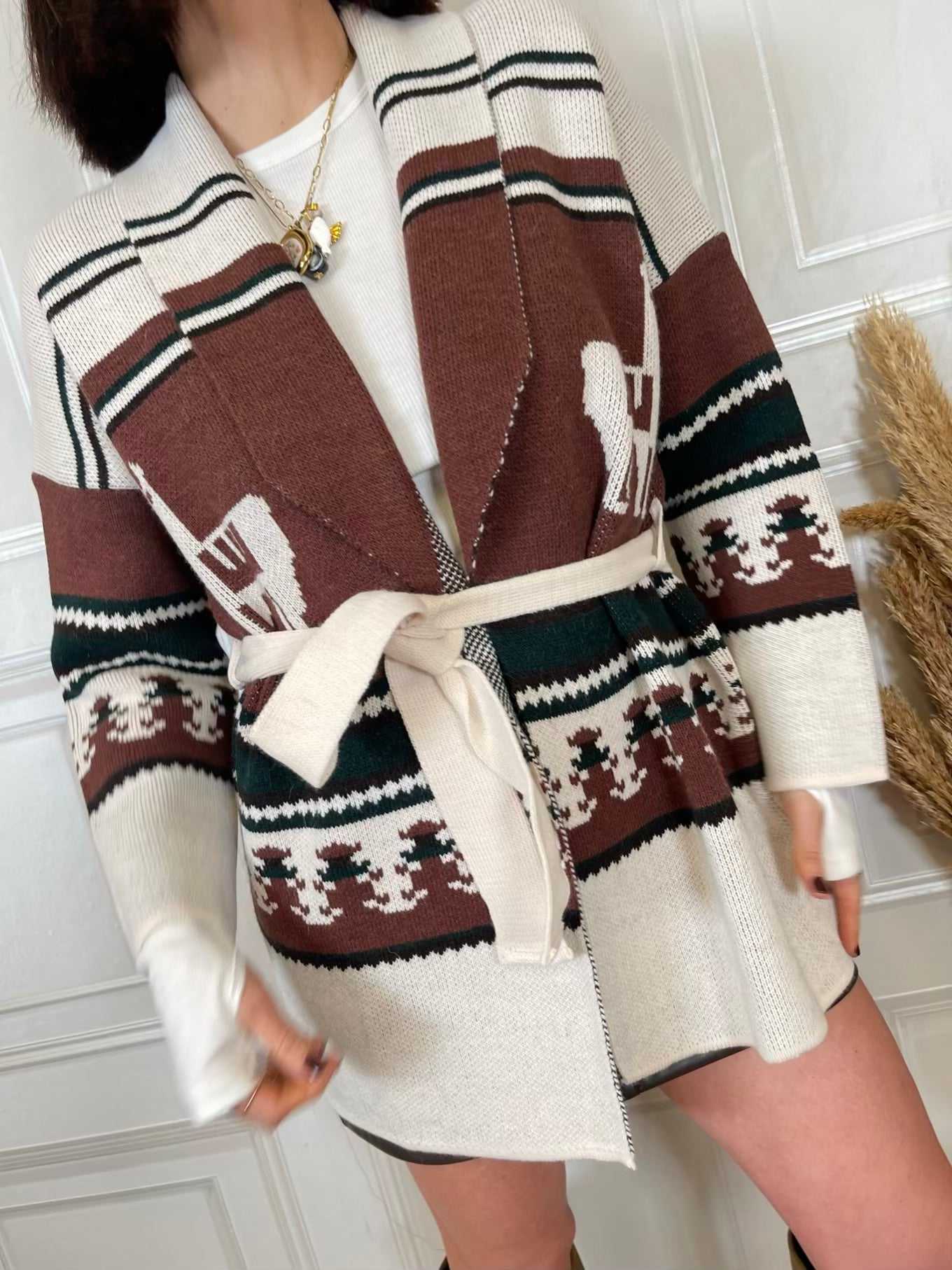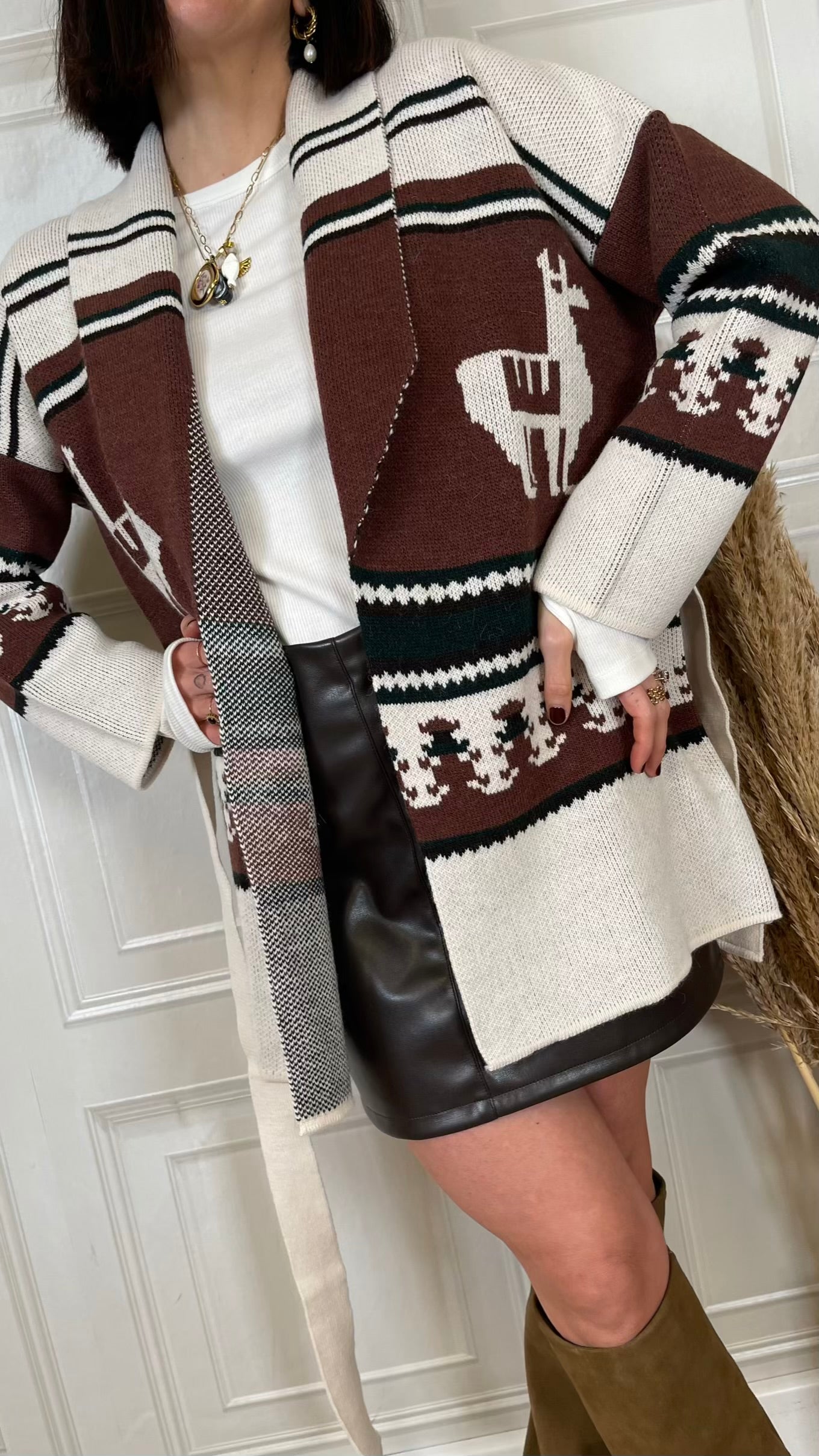 Cardigan alpaca lavorazione jacquard nei toni del marrone, burro e verde. Modello a kimono con cintura. Vestibilità regolare. Taglia unica.