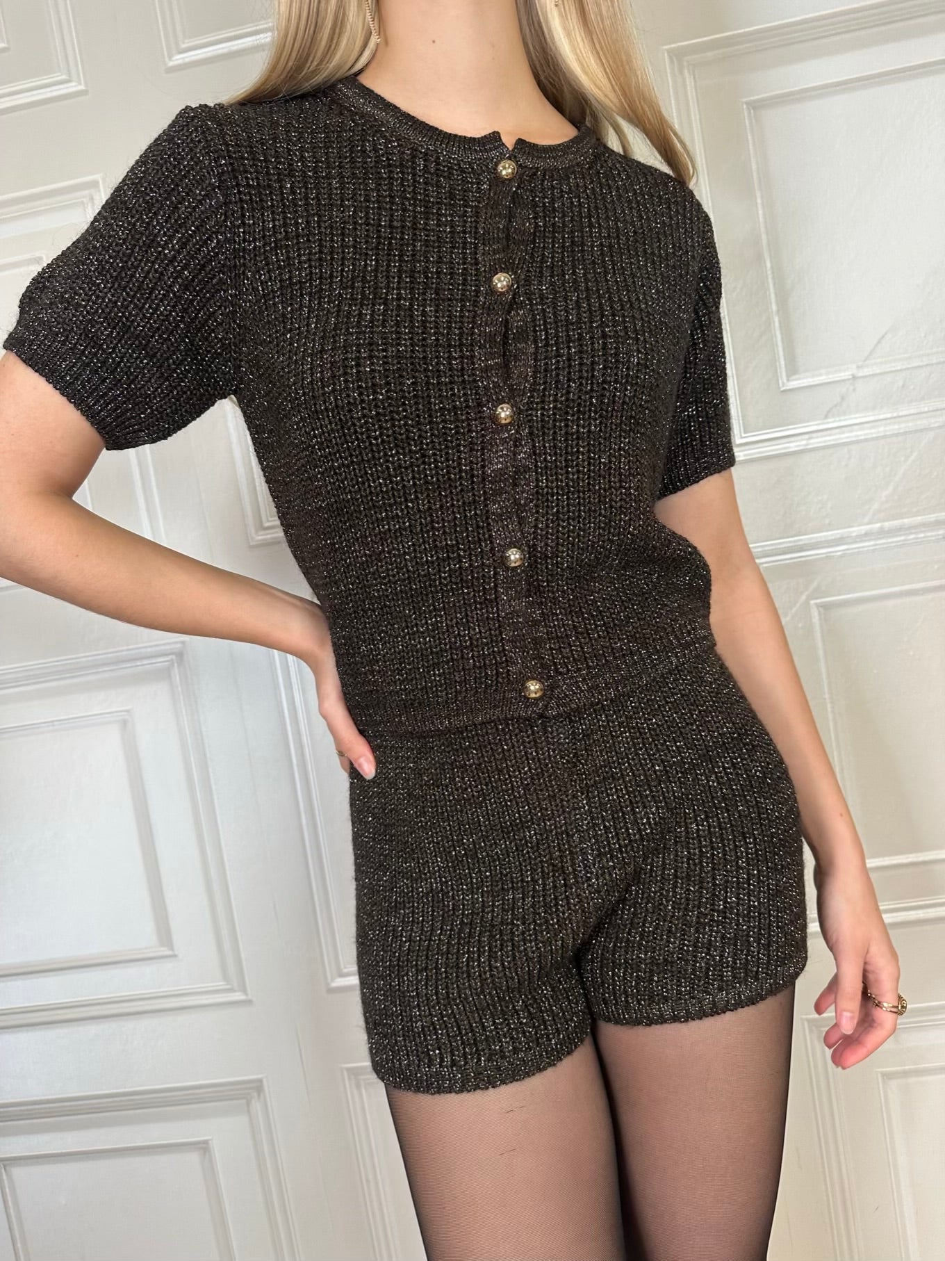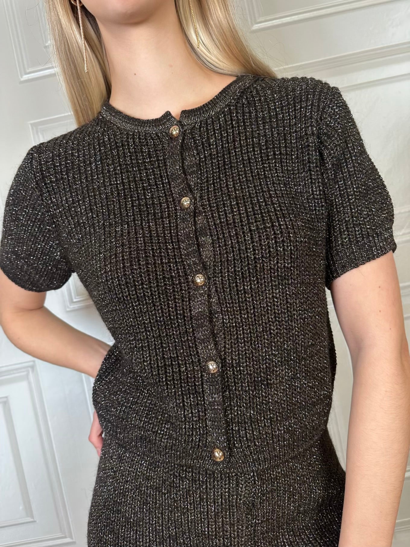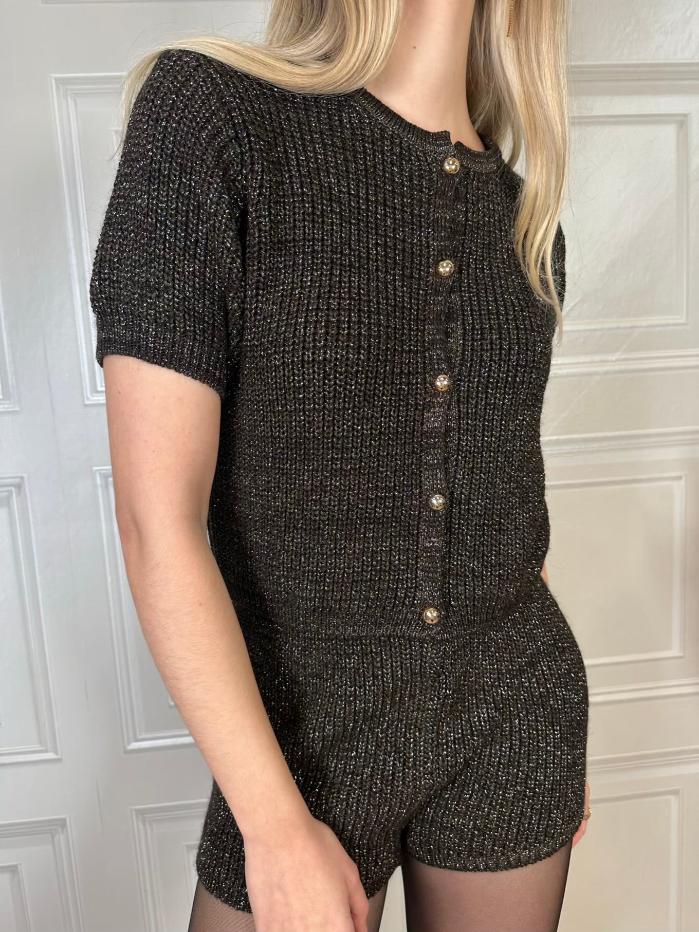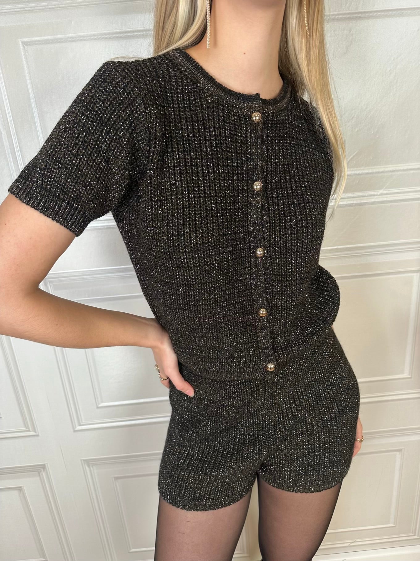 Cardigan in maglia lurex. Modello a mezza manica. Chiusura con bottoncini sul fronte.