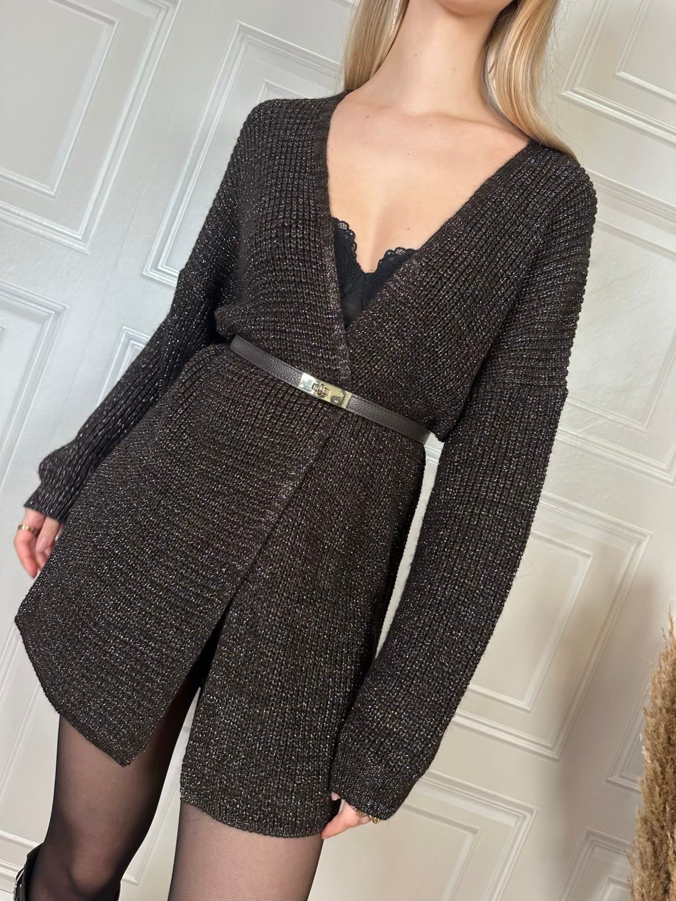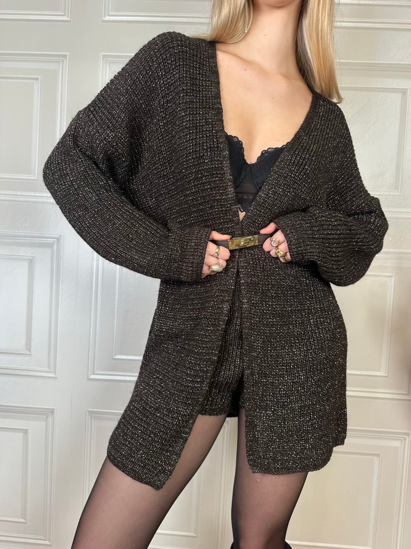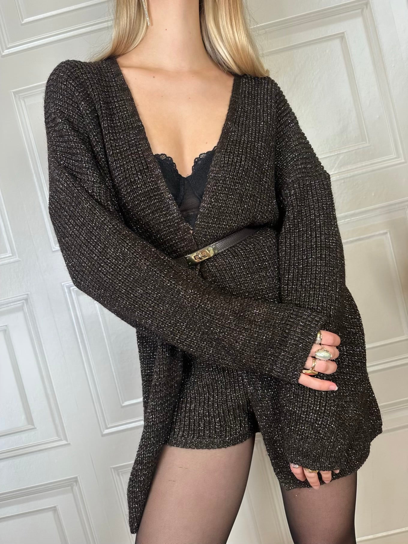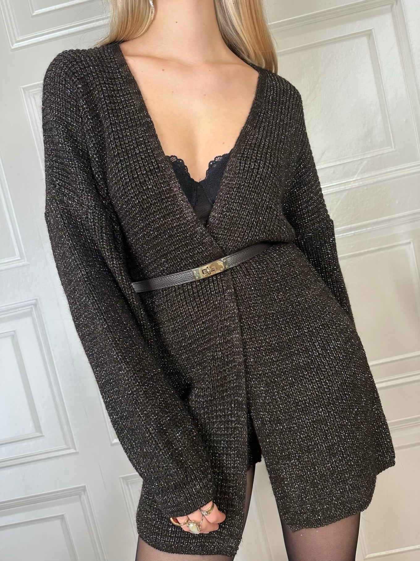 Cardigan lungo in maglia lurex. Modello a manica lunga.