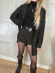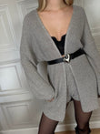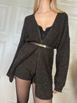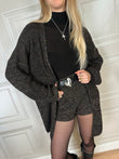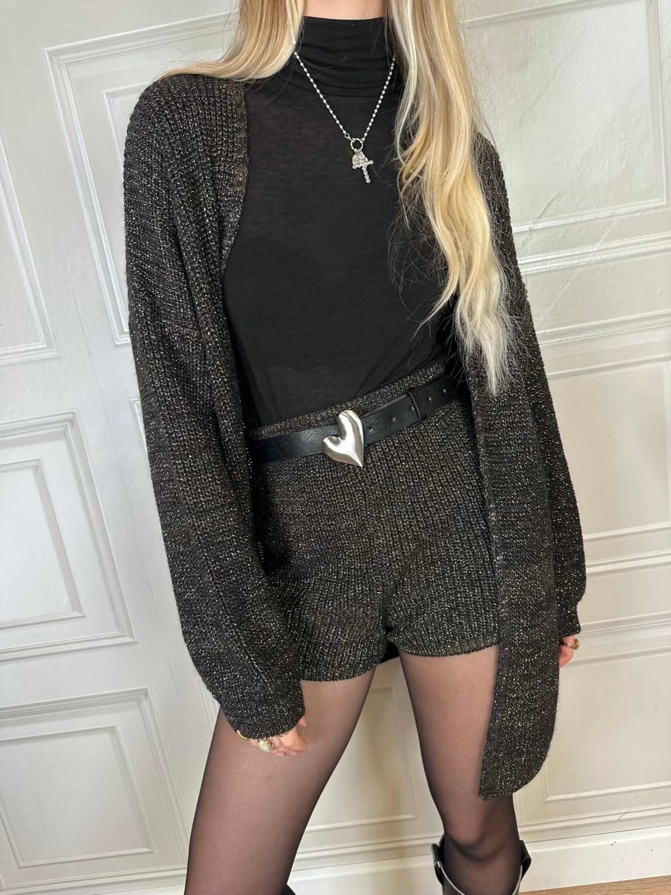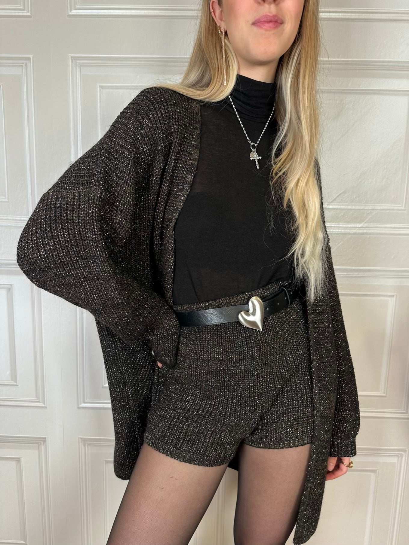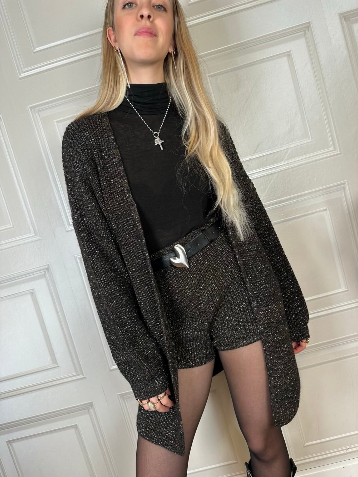 Cardigan lungo in maglia lurex. Modello a manica lunga.