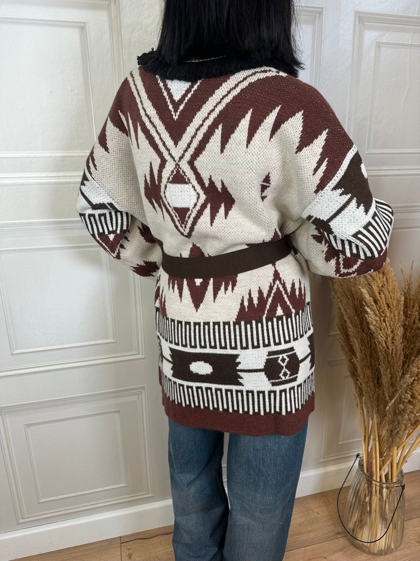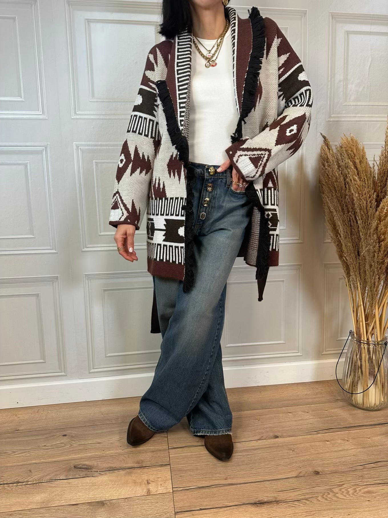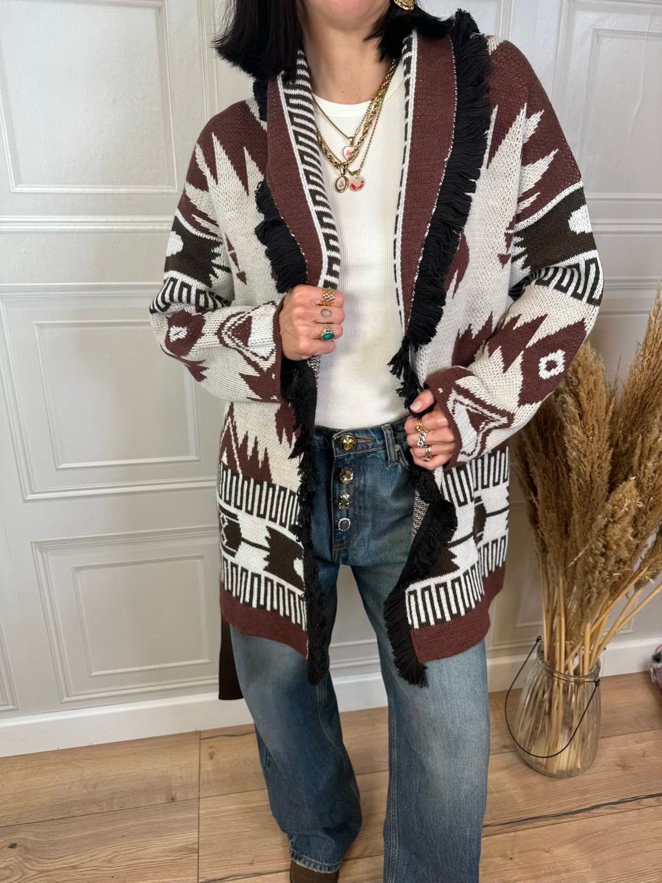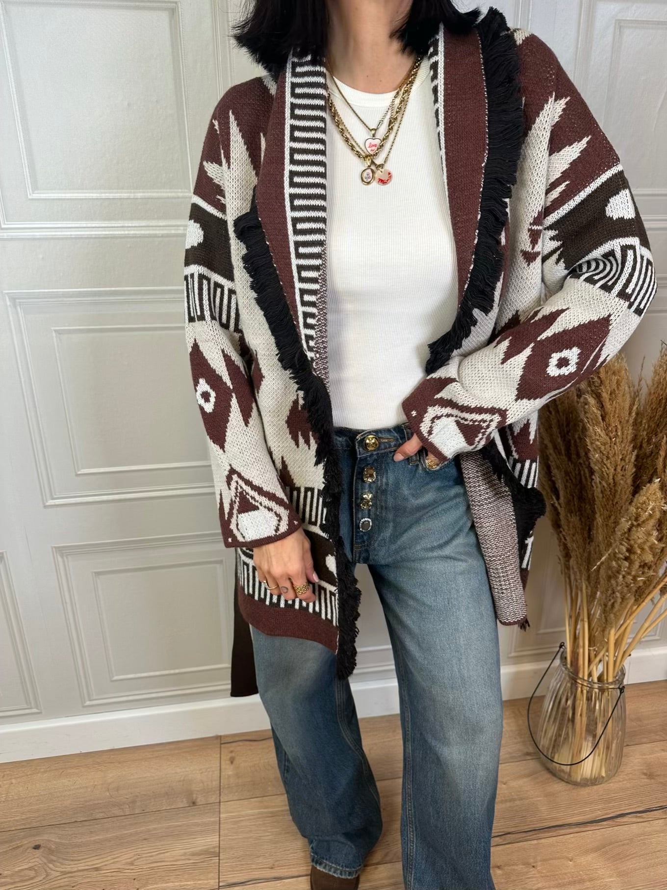 Cardigan Nevada sui toni del panna e del moro. Vestibilità over. Dettaglio di frange sulle estremità, cinturino incluso. Taglia unica