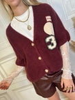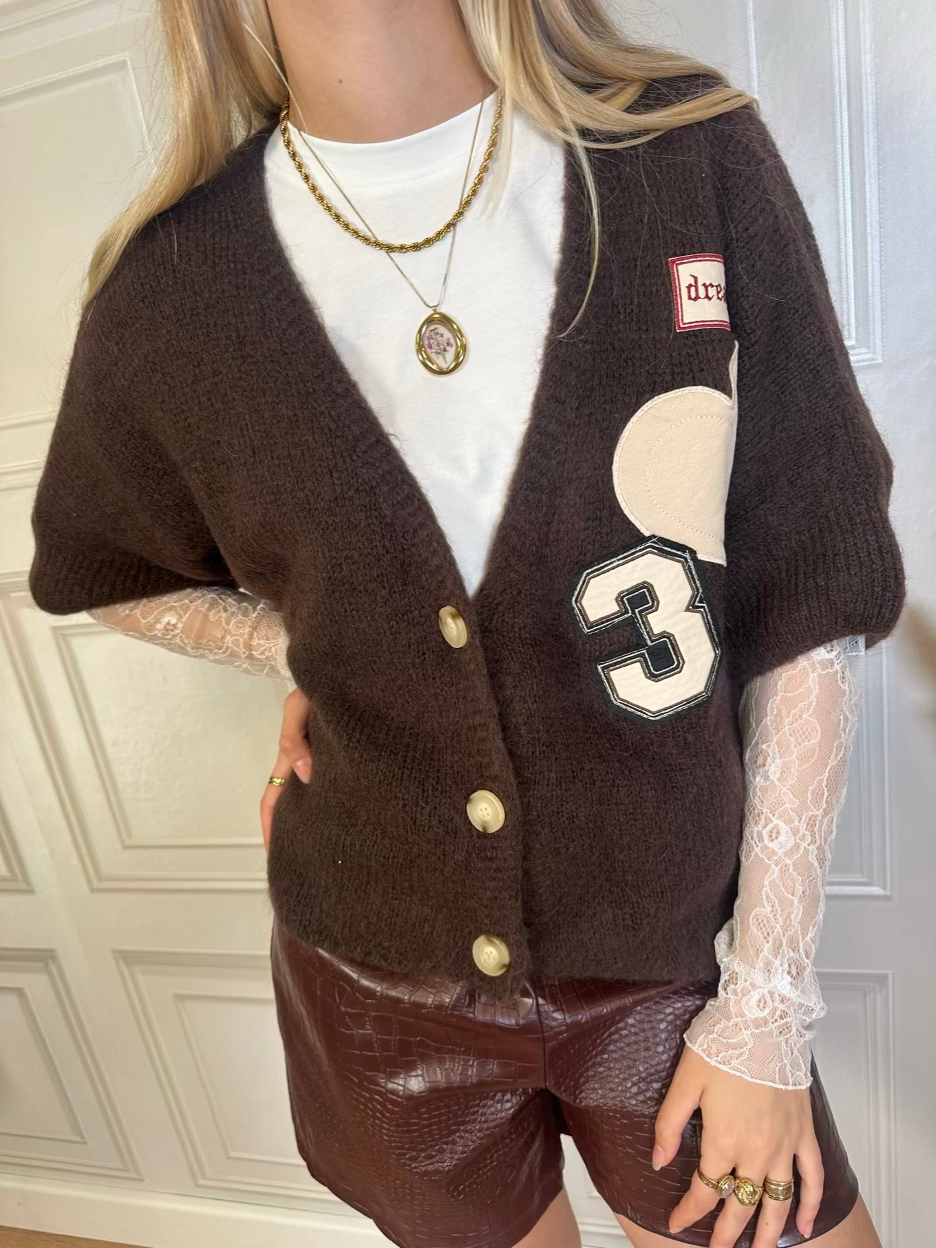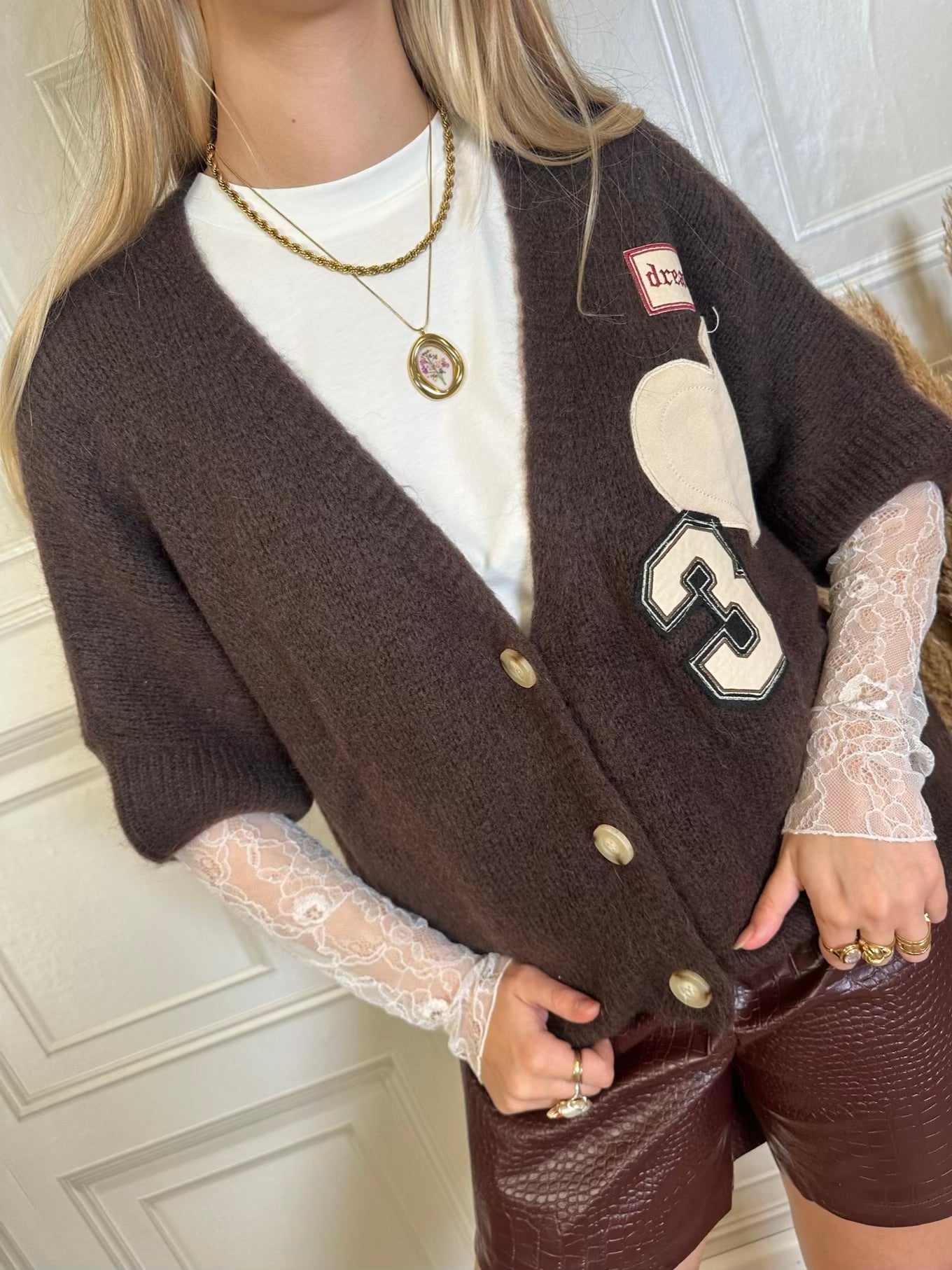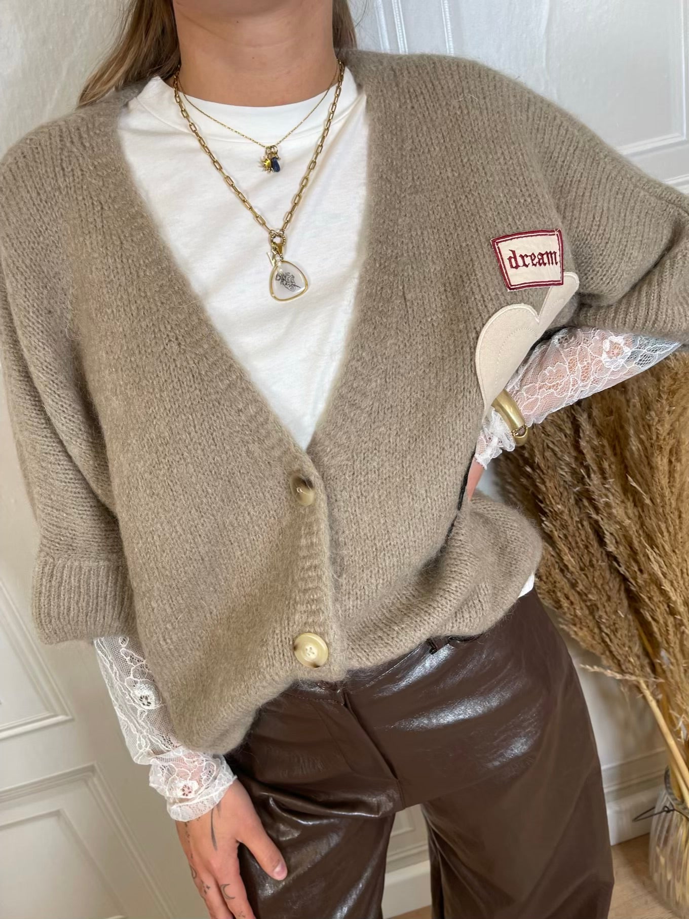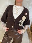 Cardigan con manica corta spalla scesa con chiusura frontale a tre bottoni. Presenta patch sul davant.