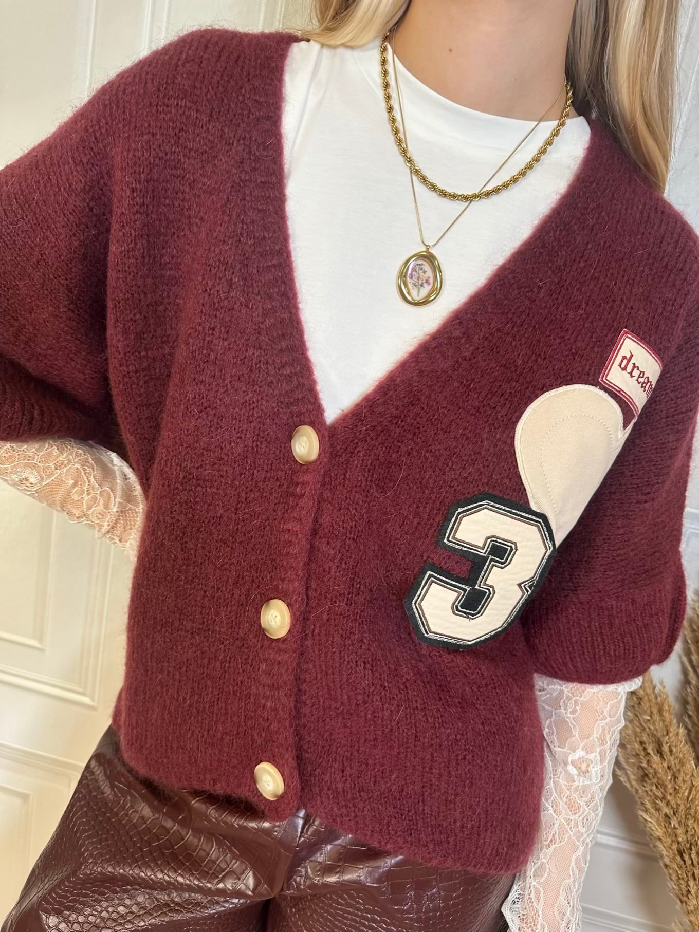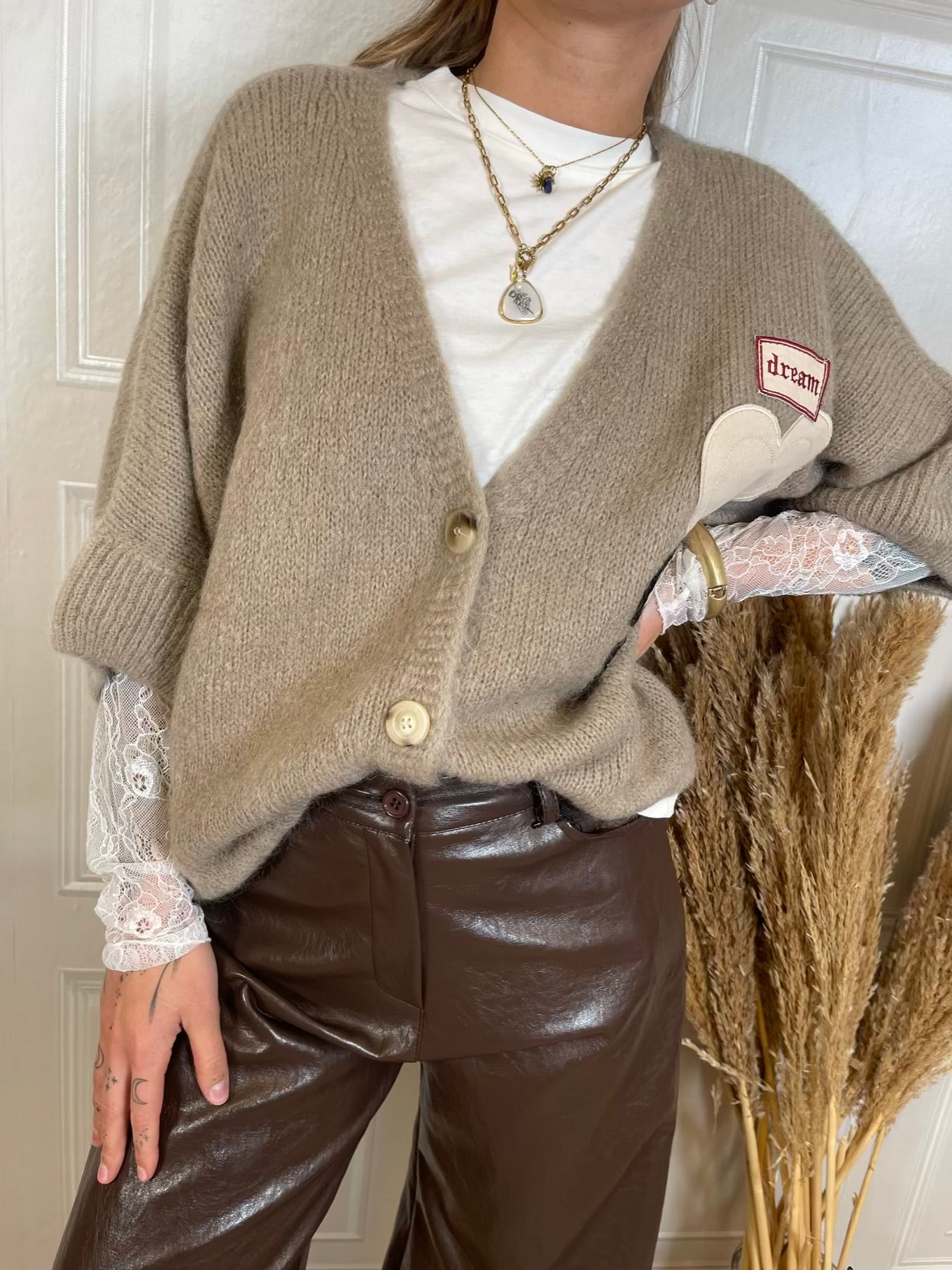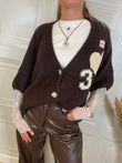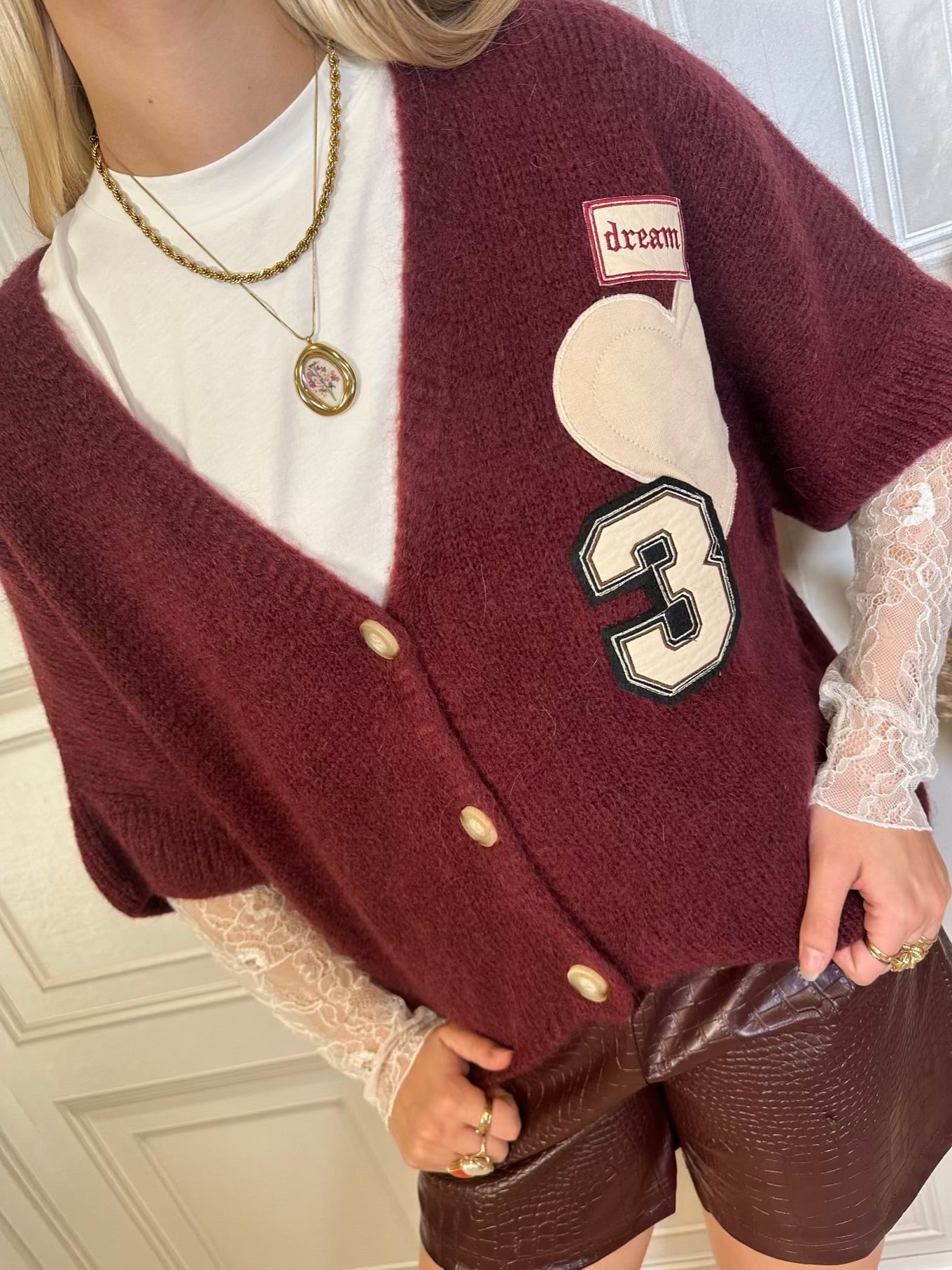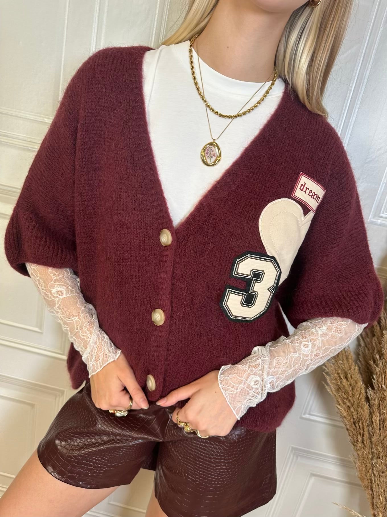 Cardigan con manica corta spalla scesa con chiusura frontale a tre bottoni. Presenta patch sul davant.
