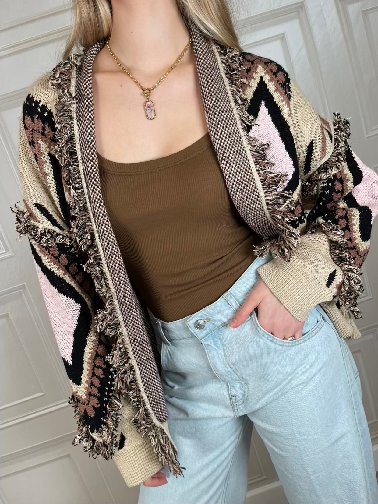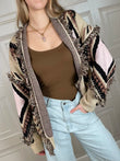 Cardigan sui toni del nero, caffè, rosa e ecrù. Vestibilità leggermente morbida. Dettaglio di frange. Taglia unica