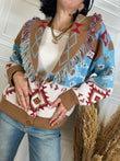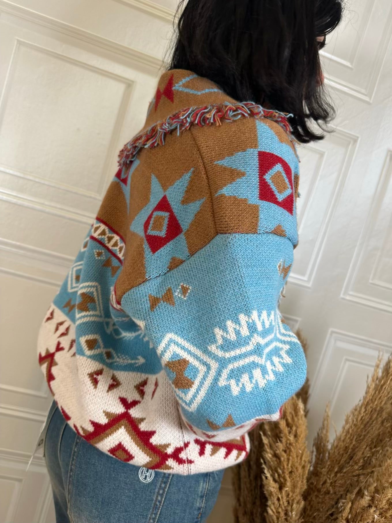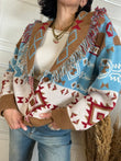 Cardigan Texas sui toni del panna, moro, rosso e azzurro. Vestibilità over. Dettaglio di frange sulle estremità, chiusura con tre bottoni. Taglia unica