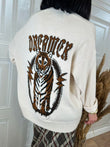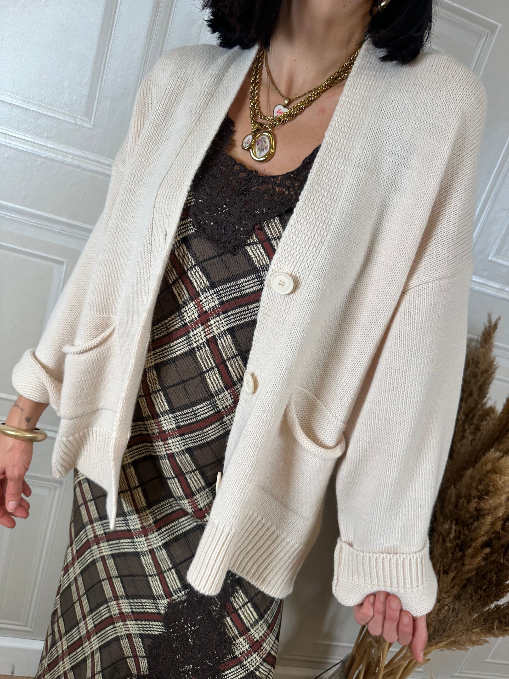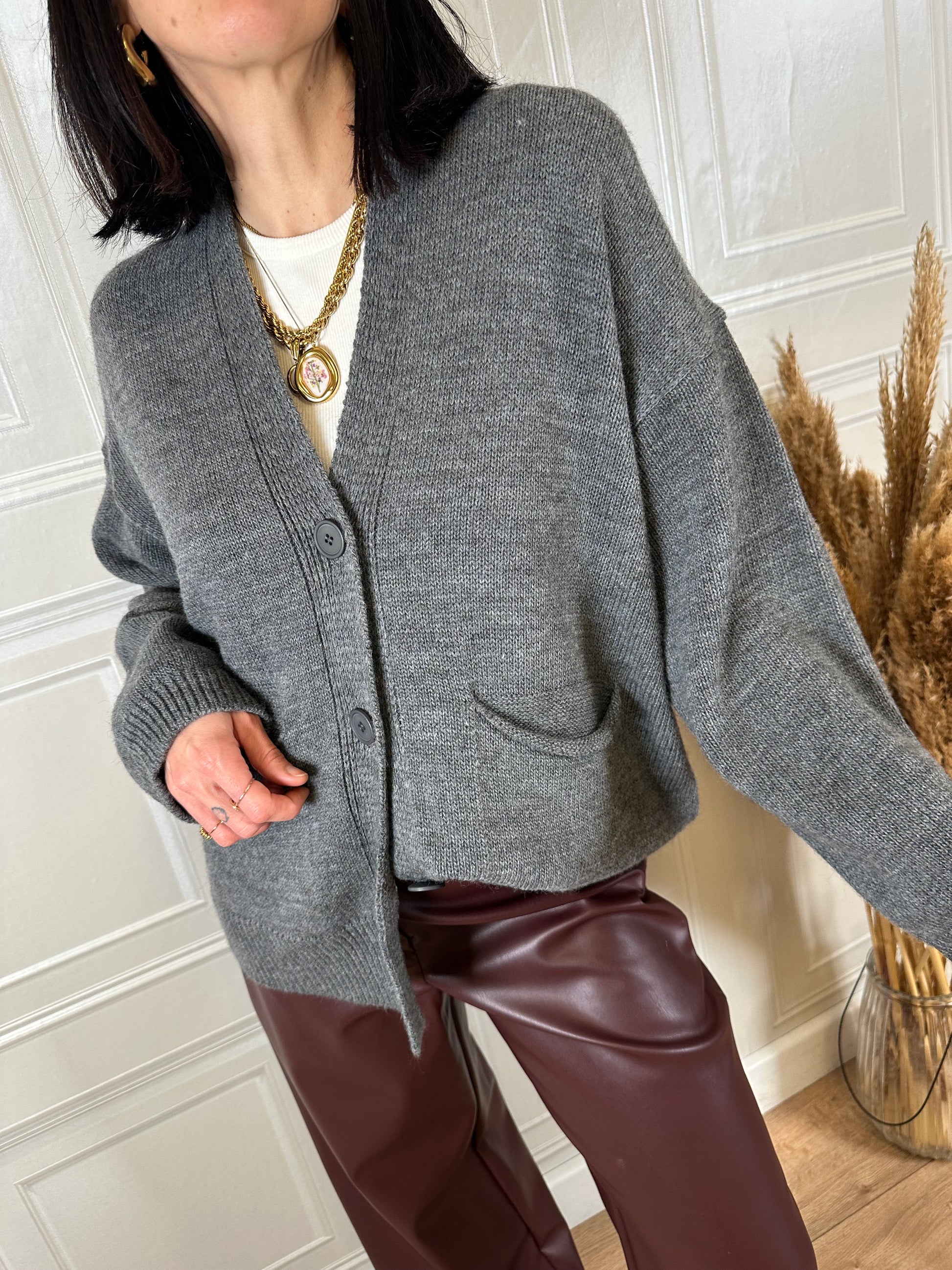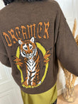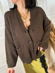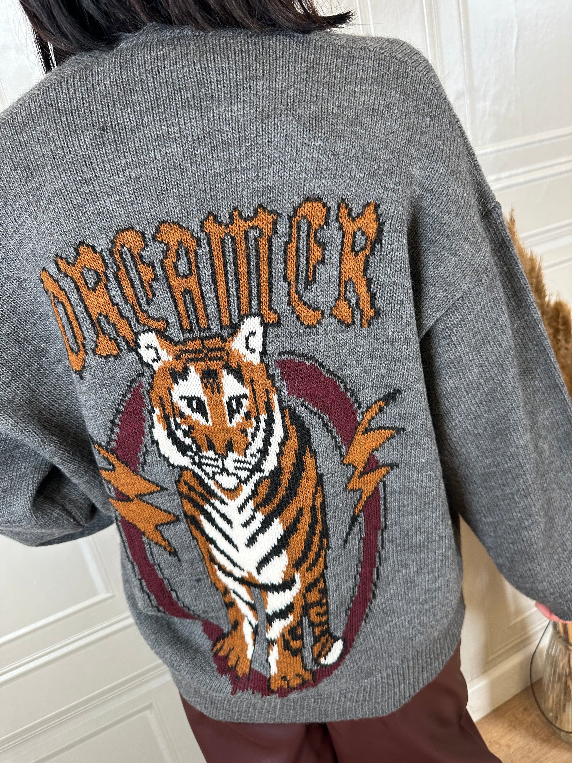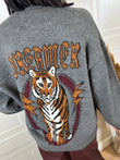 Cardigan smacchinato in lana alpaca con intarsio di tigre sul retro, scollatura a V e bottoni apribili sul davanti. Fondo a costina. Vestibilità morbida