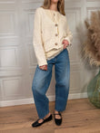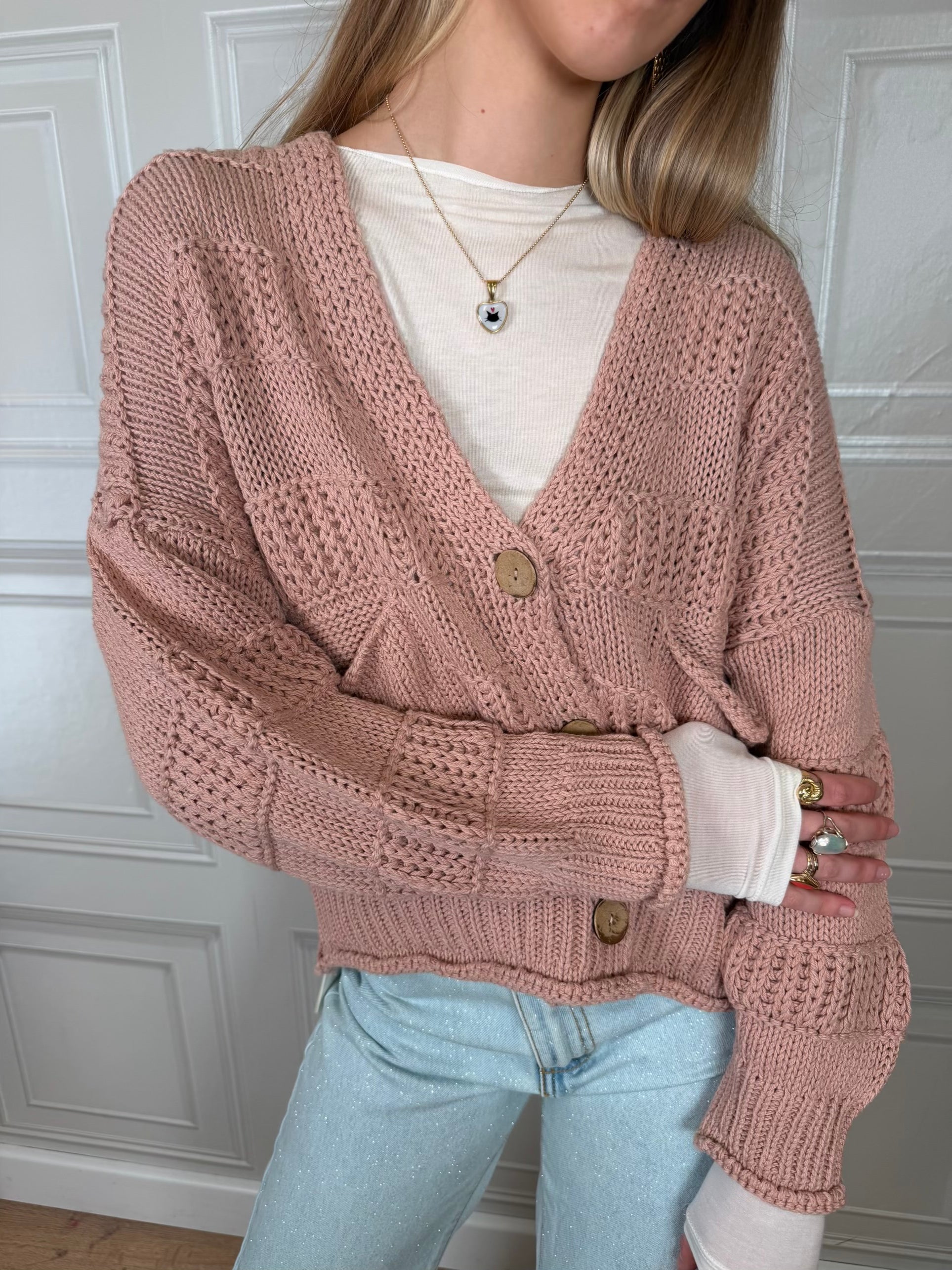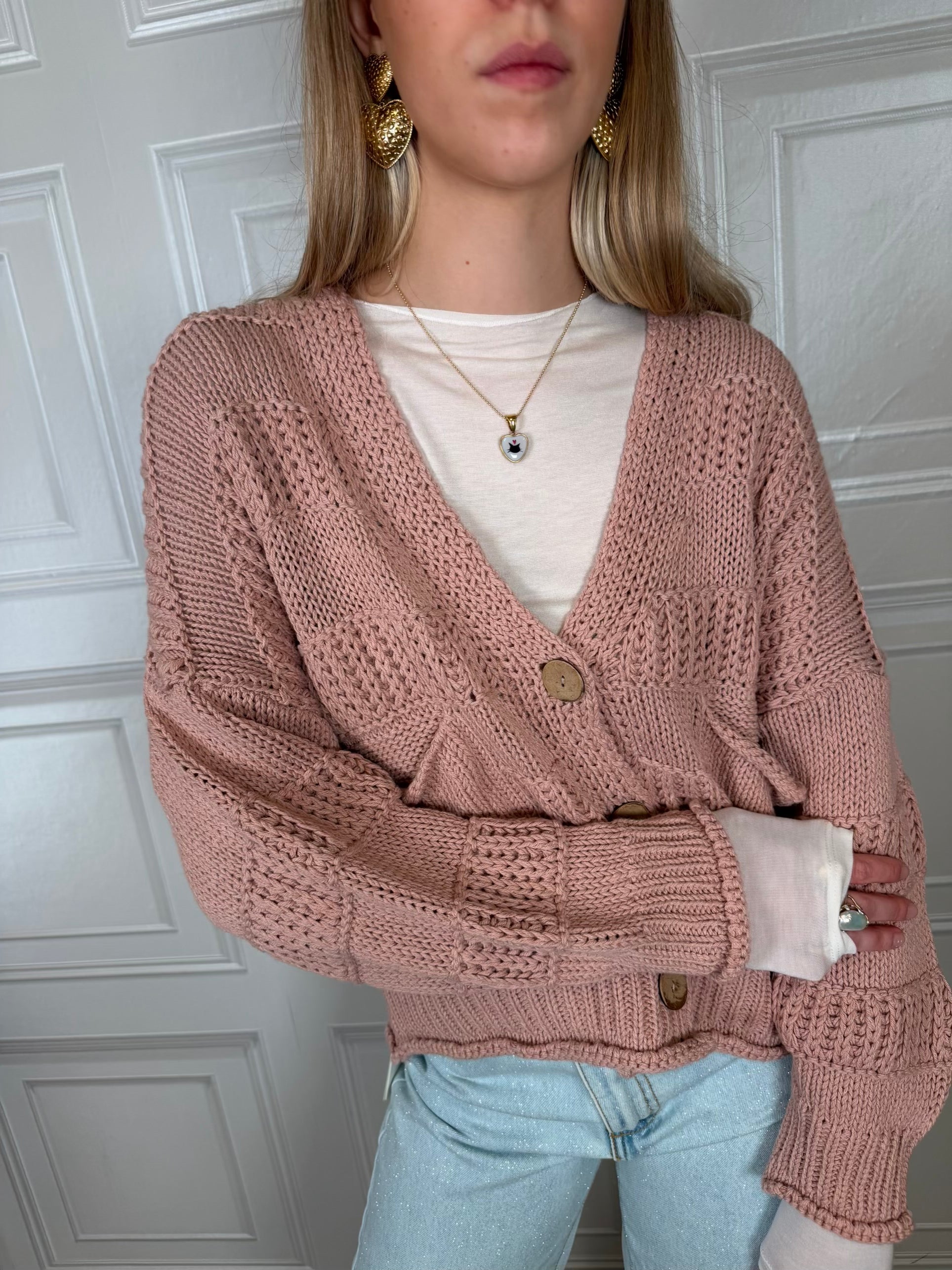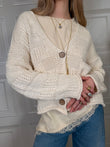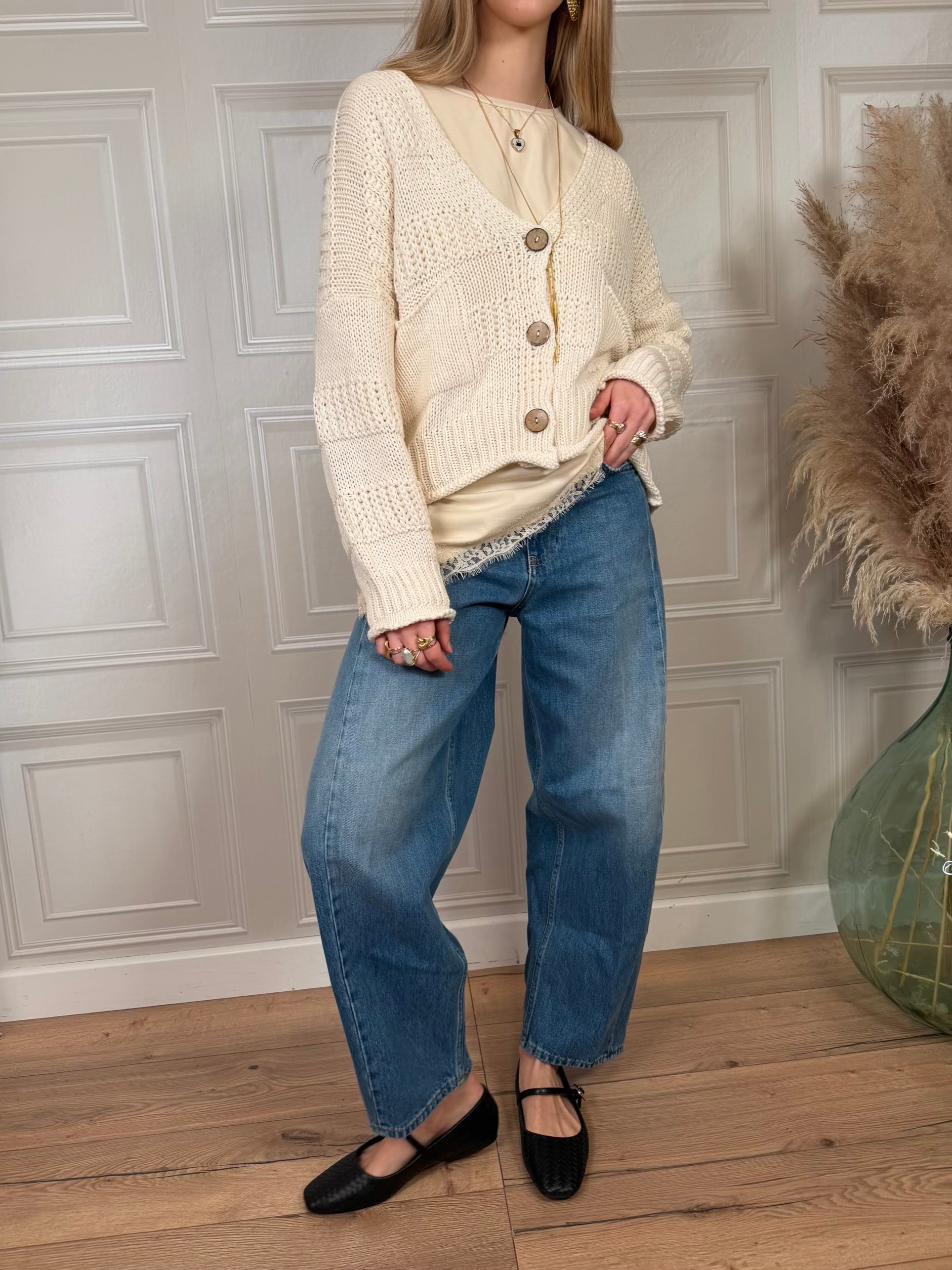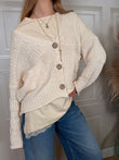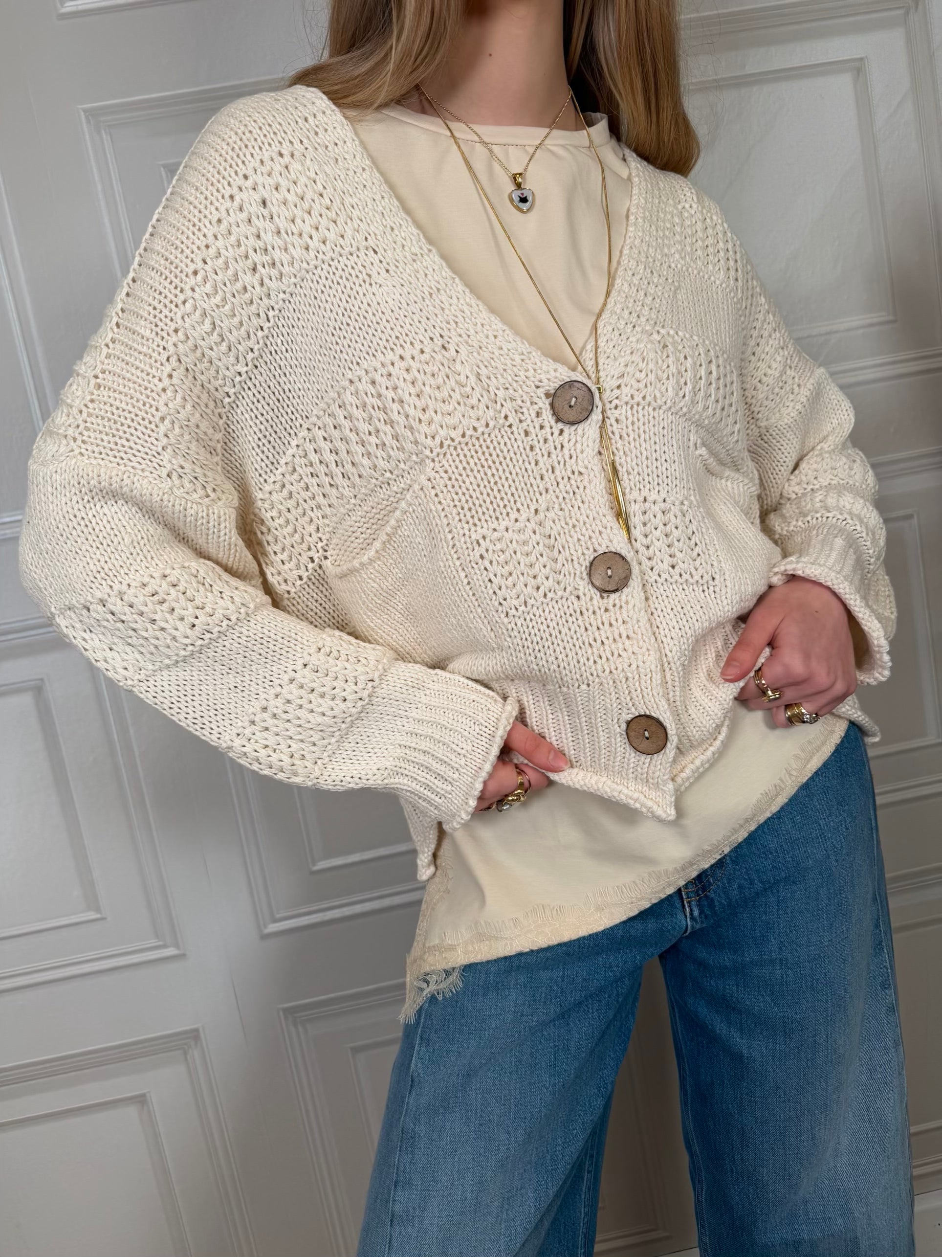 Modello scollo a V, chiusura a tre bottoni. Due taschine frontali. Taglia unica, vestibilità regolare.