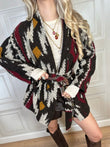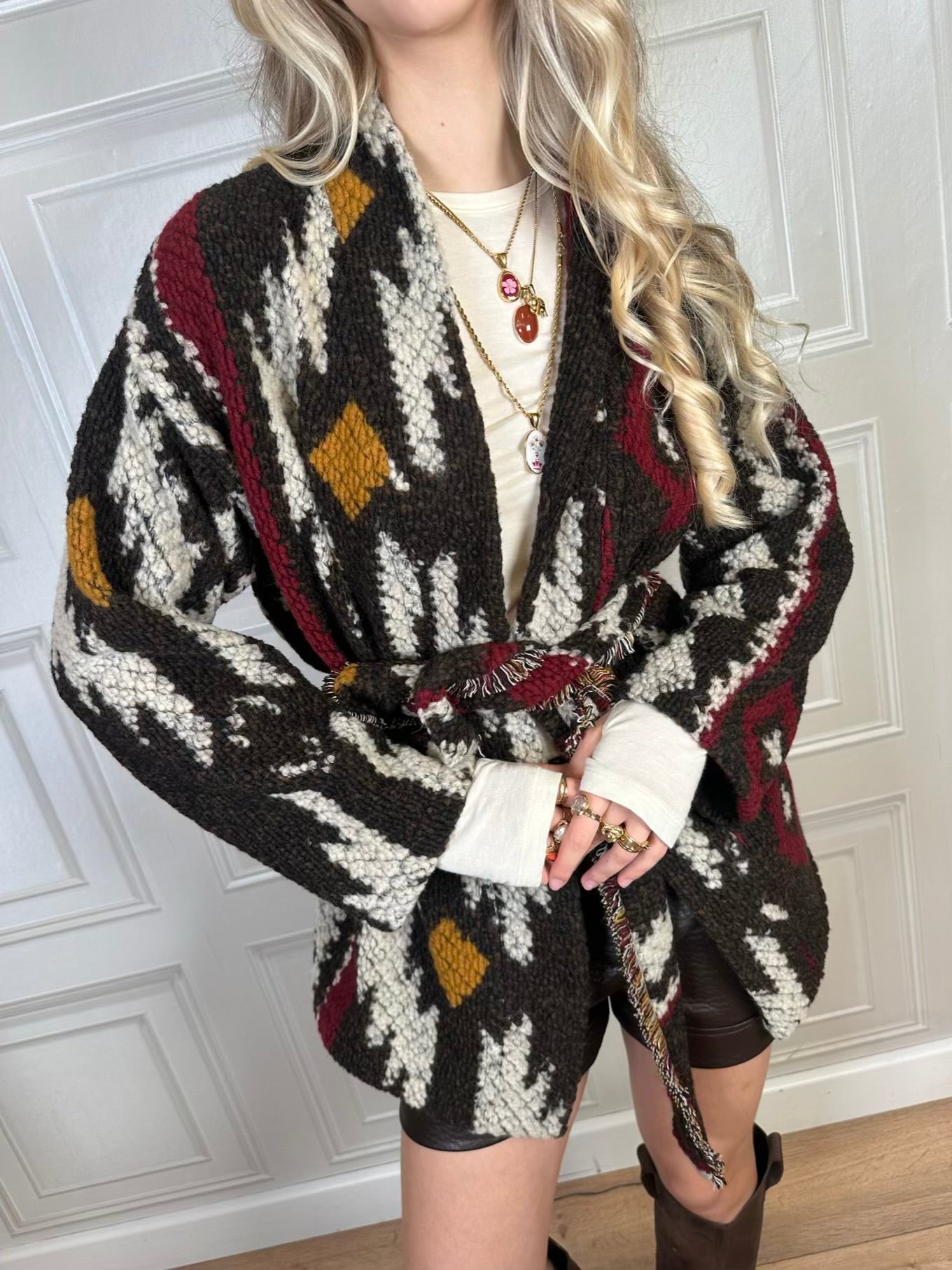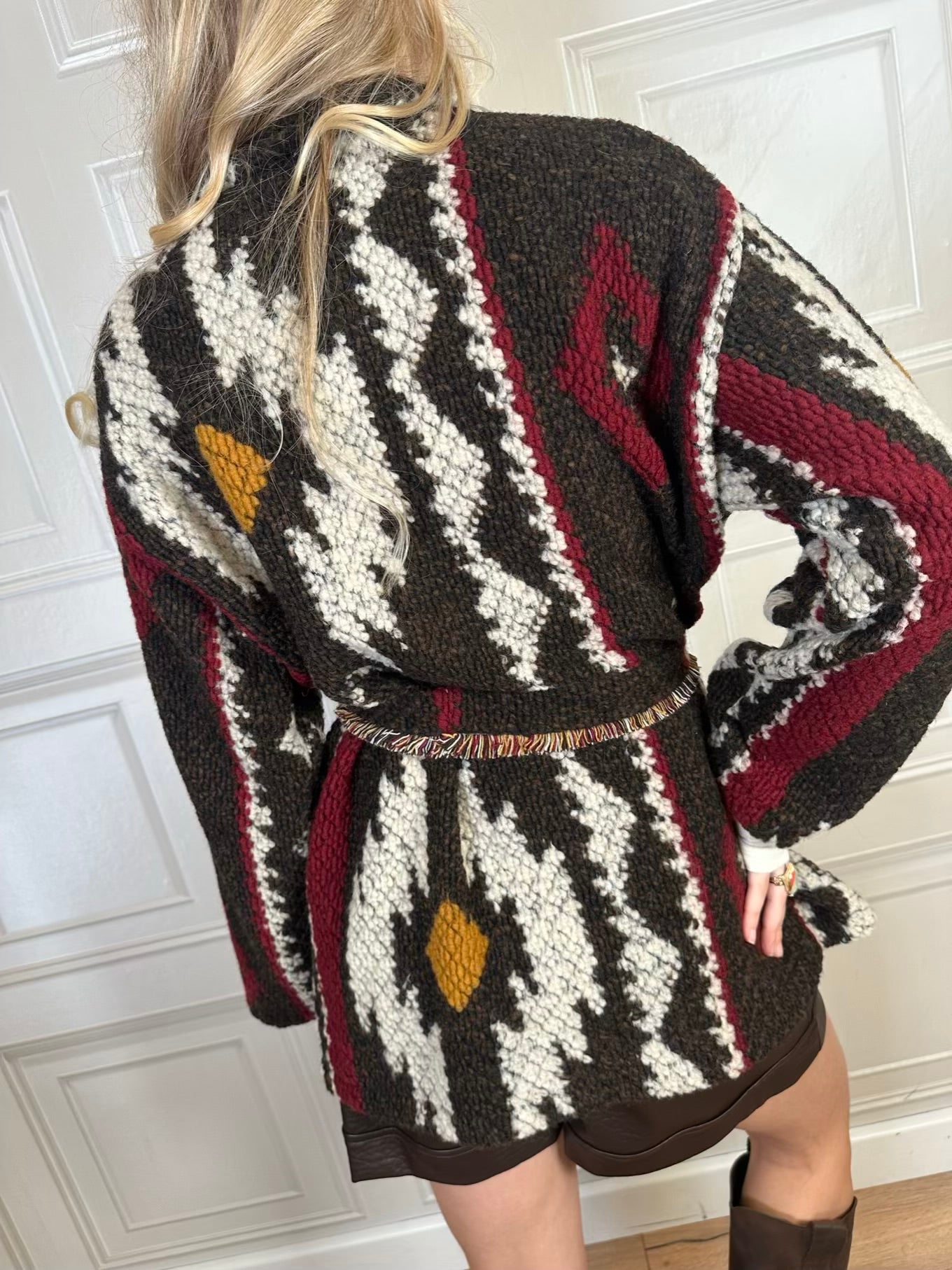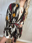Cappotto fantasia Tulum in morbida maglia. Sui toni del panna, moro, senape e india. Modello a kimono con spalla scesa e cintura a chiusura in vita. .