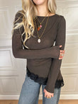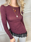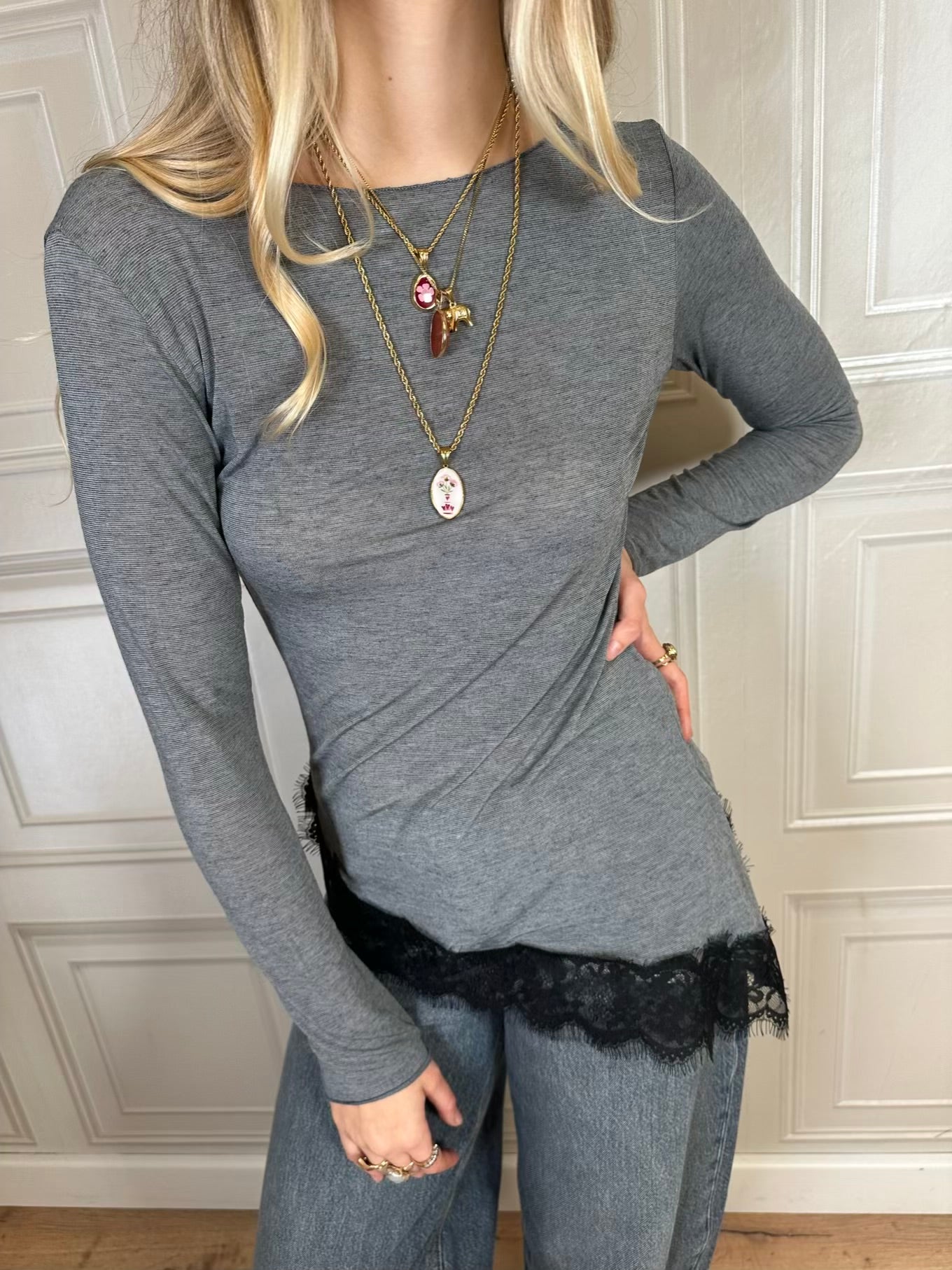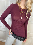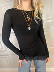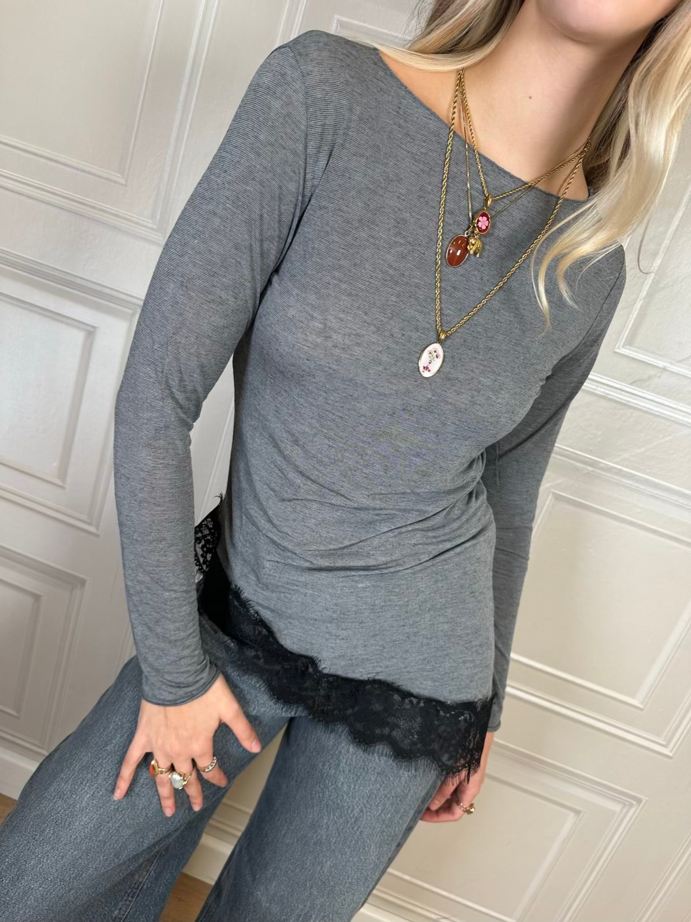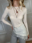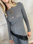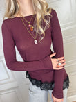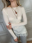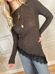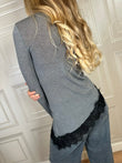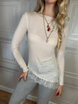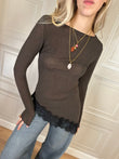 Maglia in misto cashmere. Modello con scollo a barchetta e fondo asimmetrico bordato in pizzo.