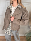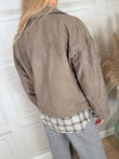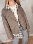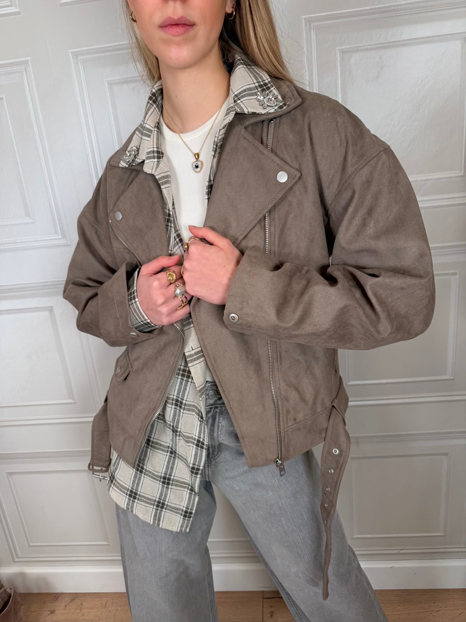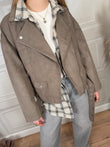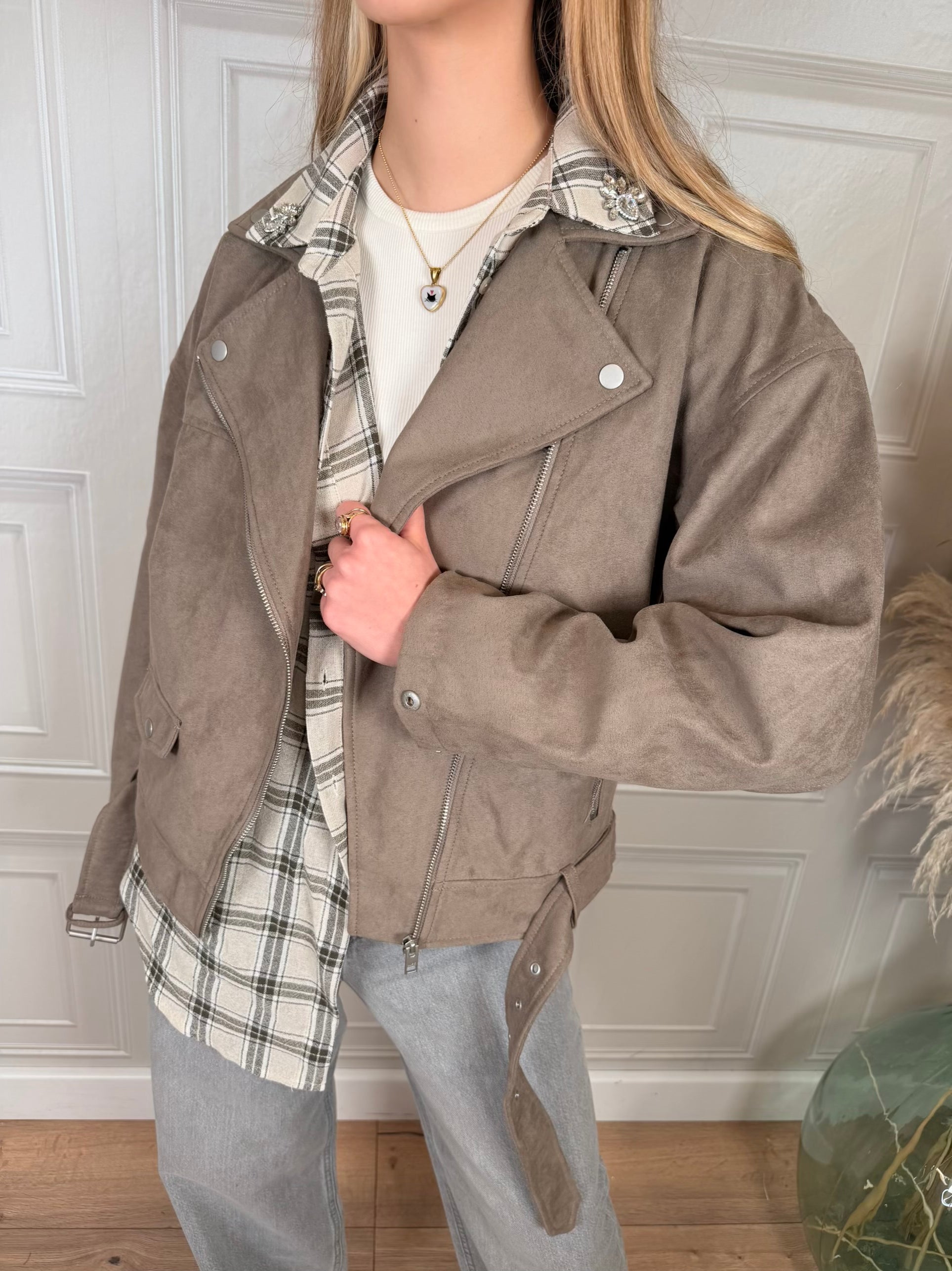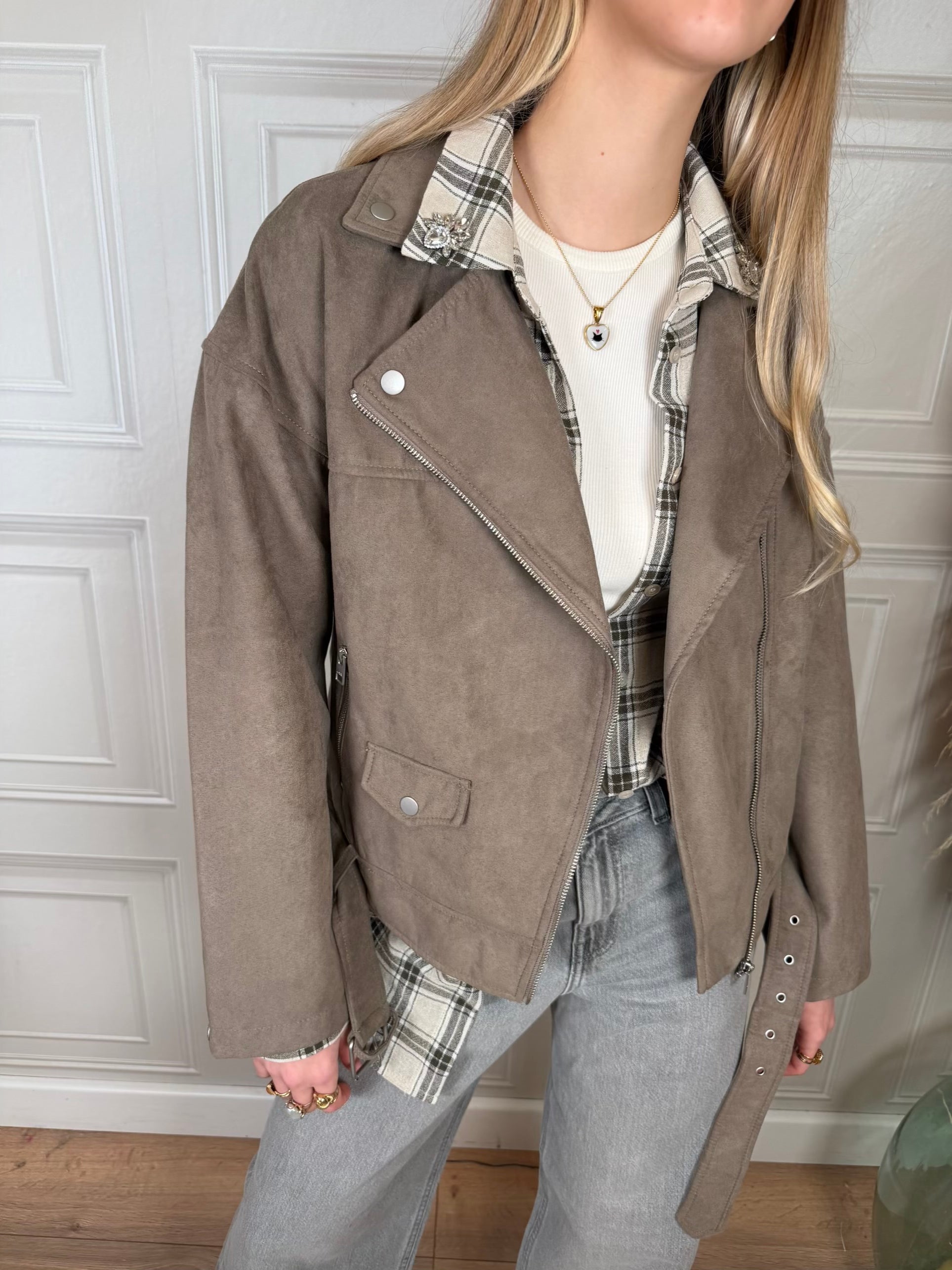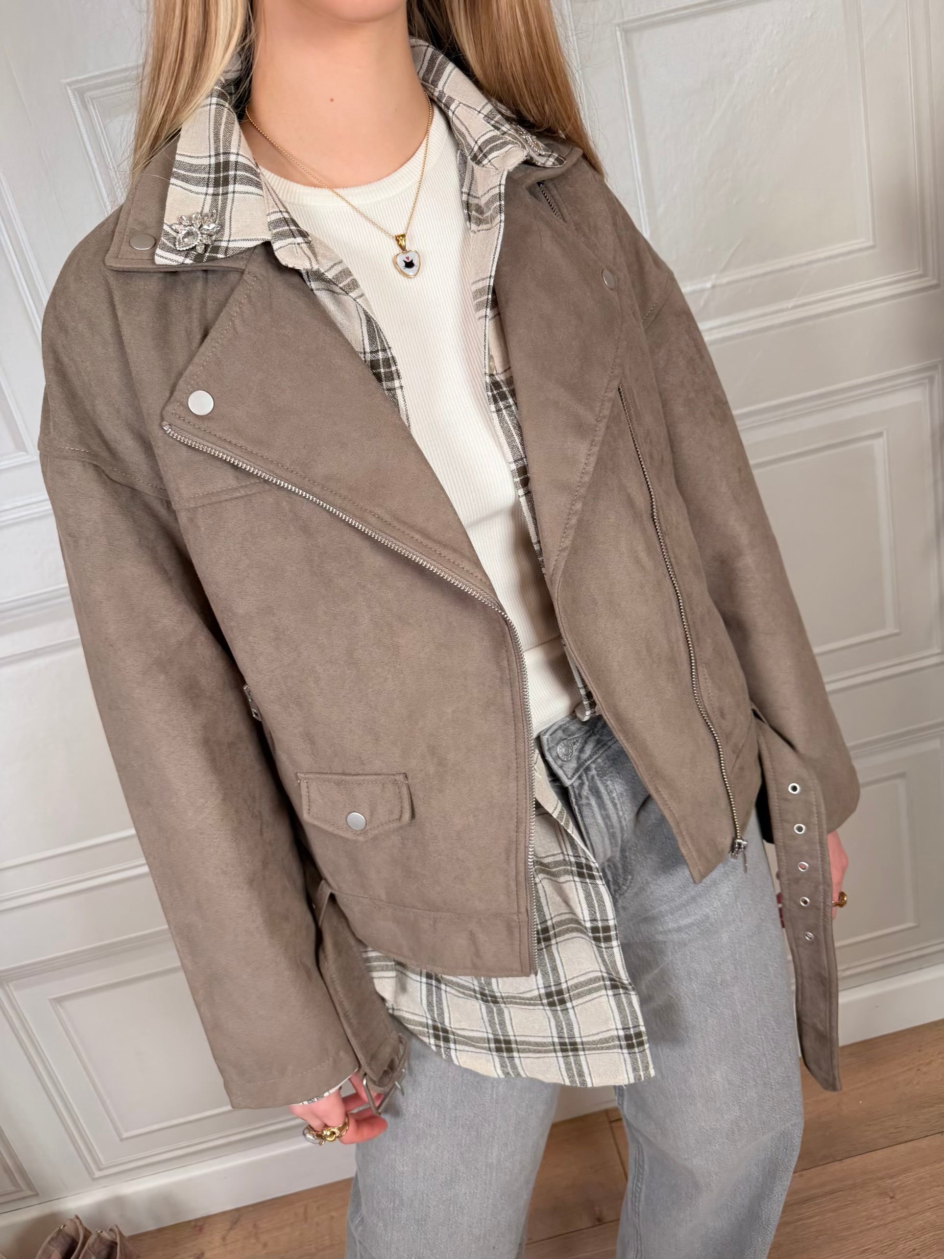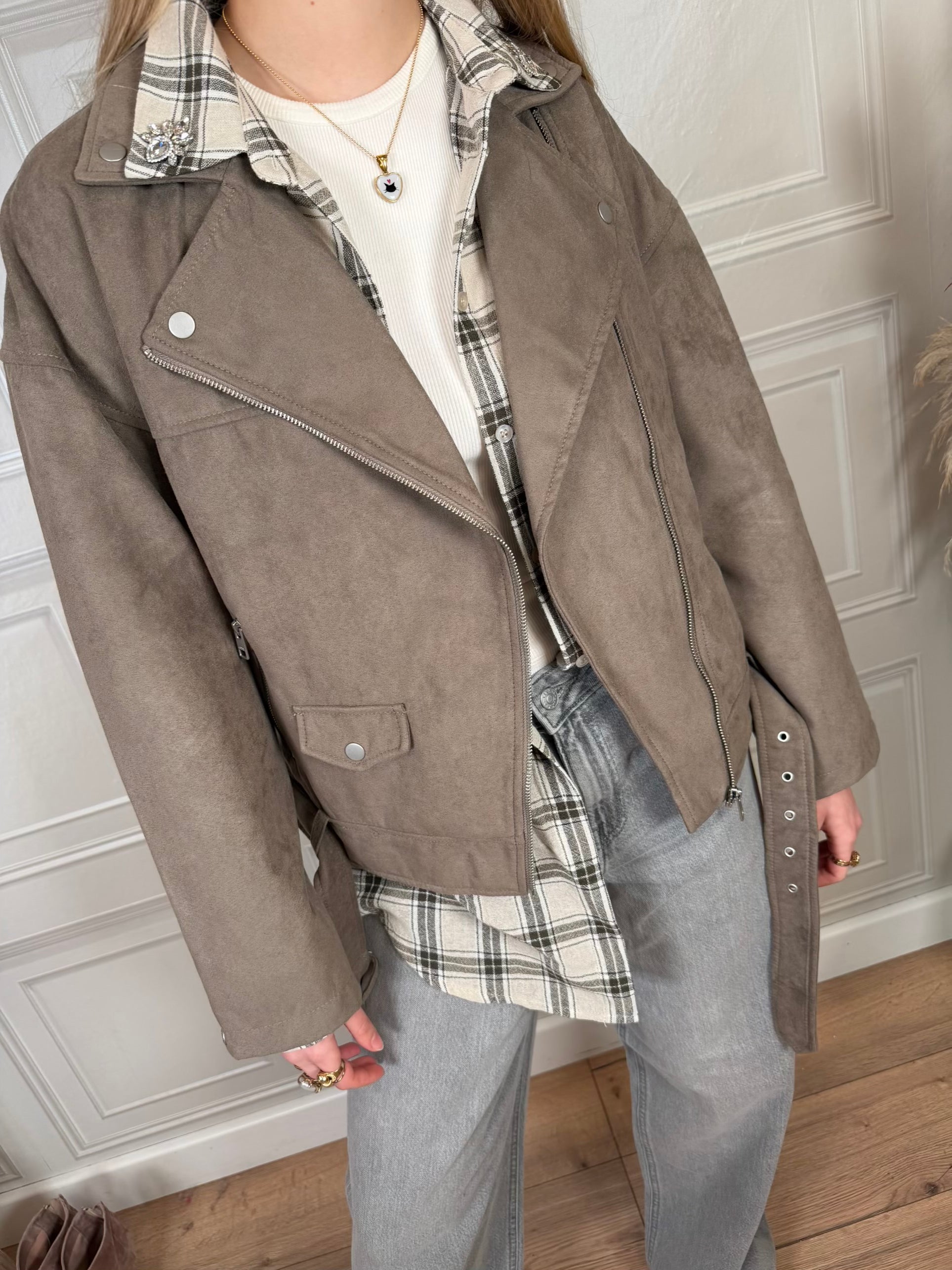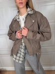 Chiodo Biker scamosciato tortora. Chiusura anteriore con zip. Tasche laterali con zip.