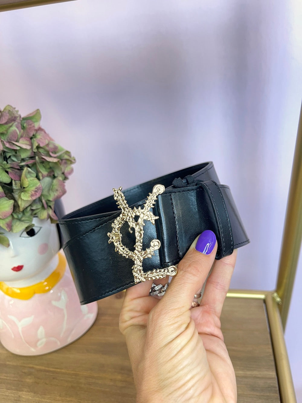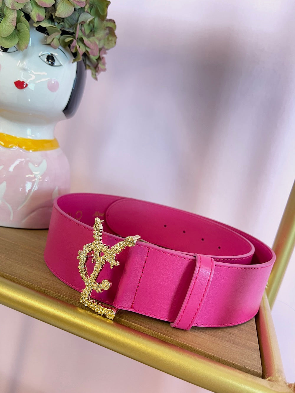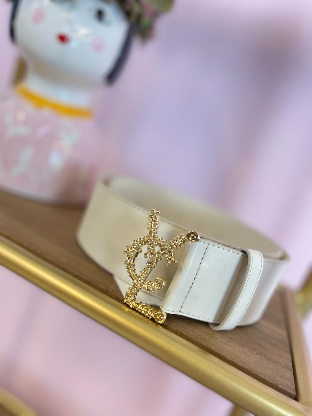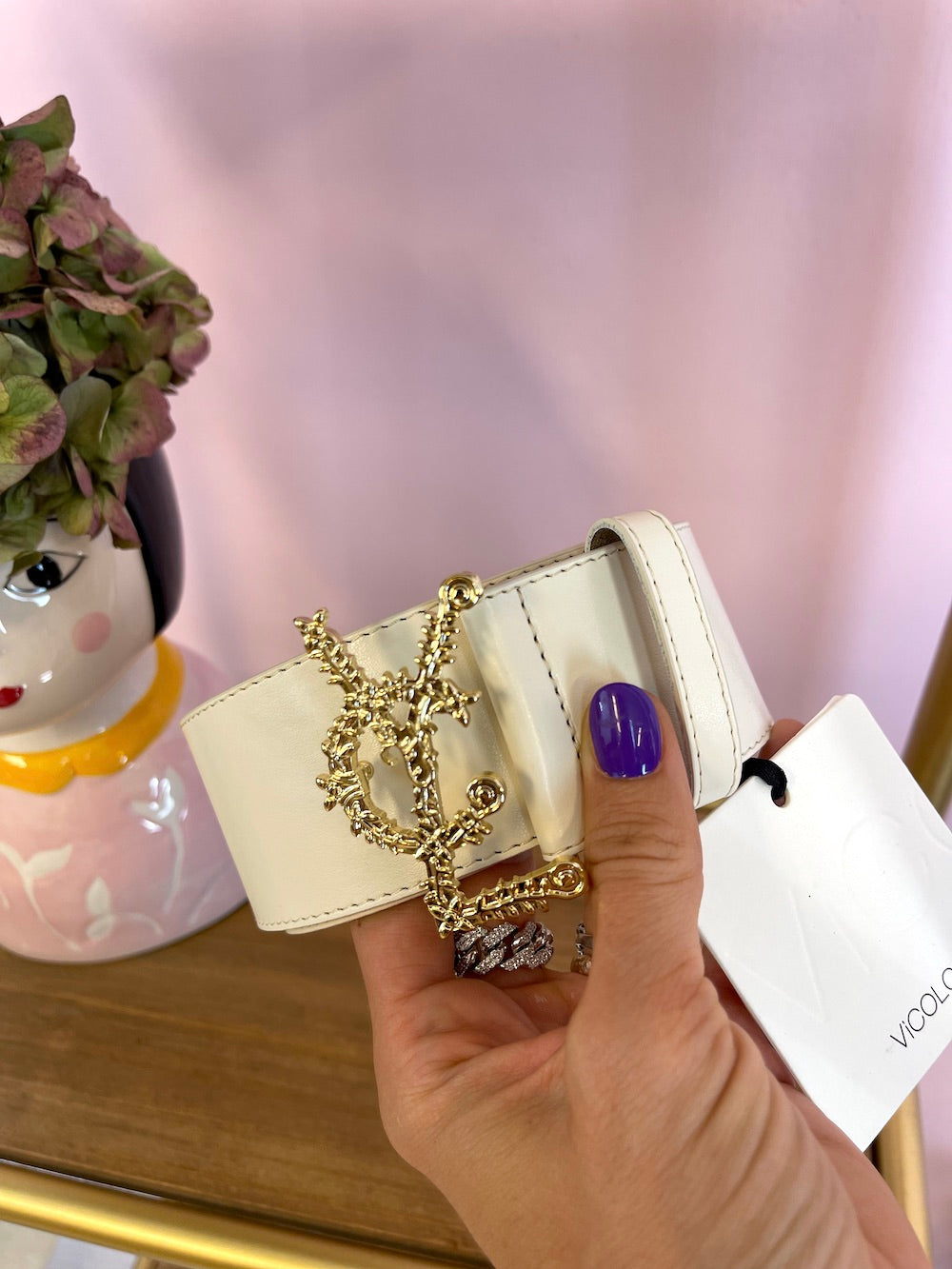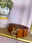Cintura in pelle alta con fibbia oro, logo lavorato “Vcl”.