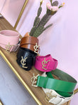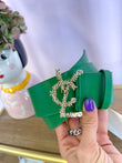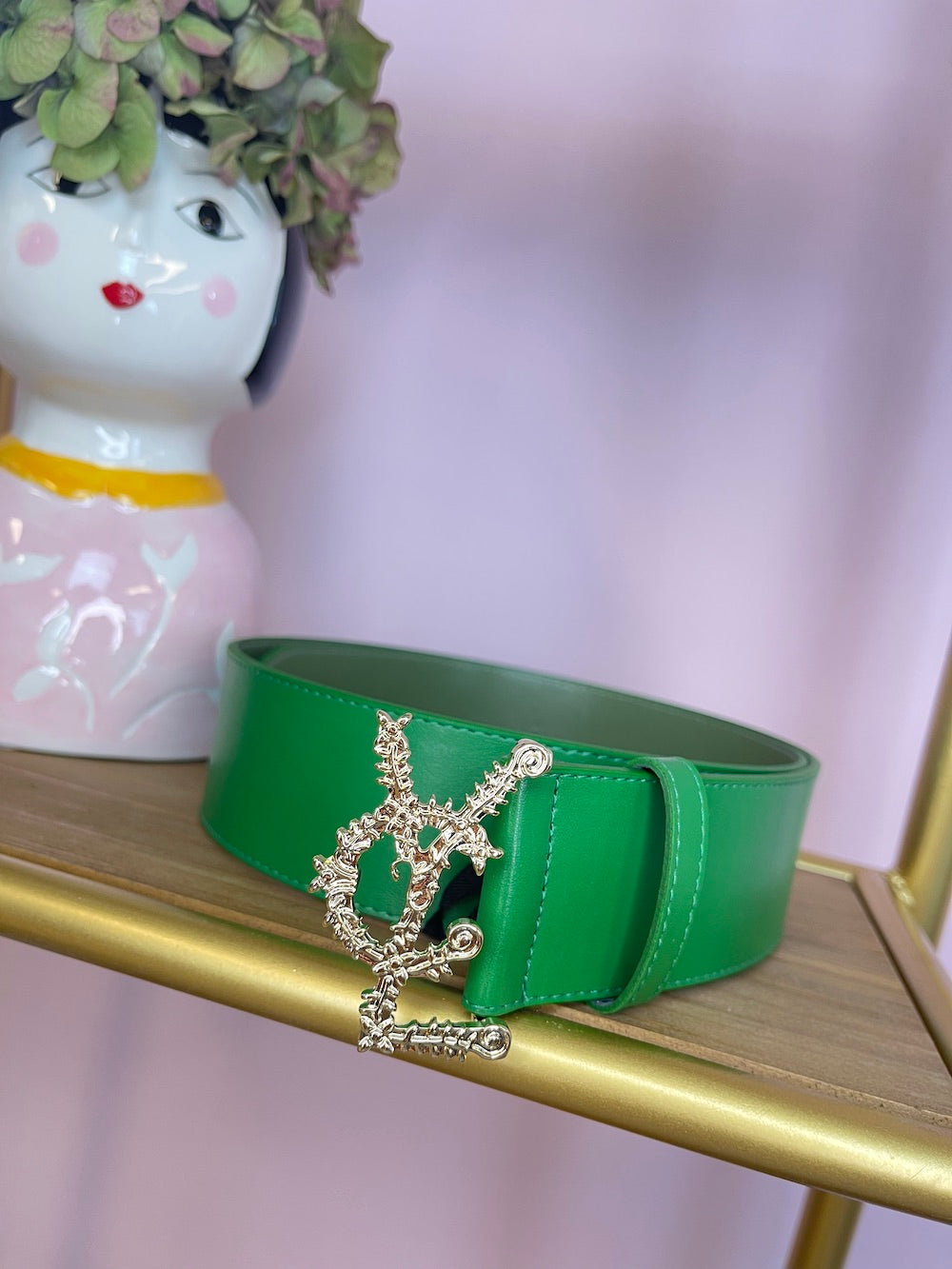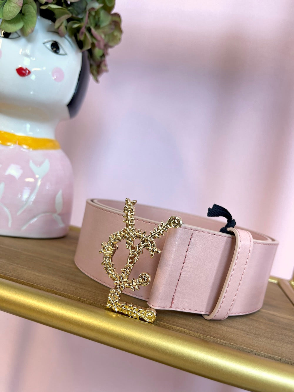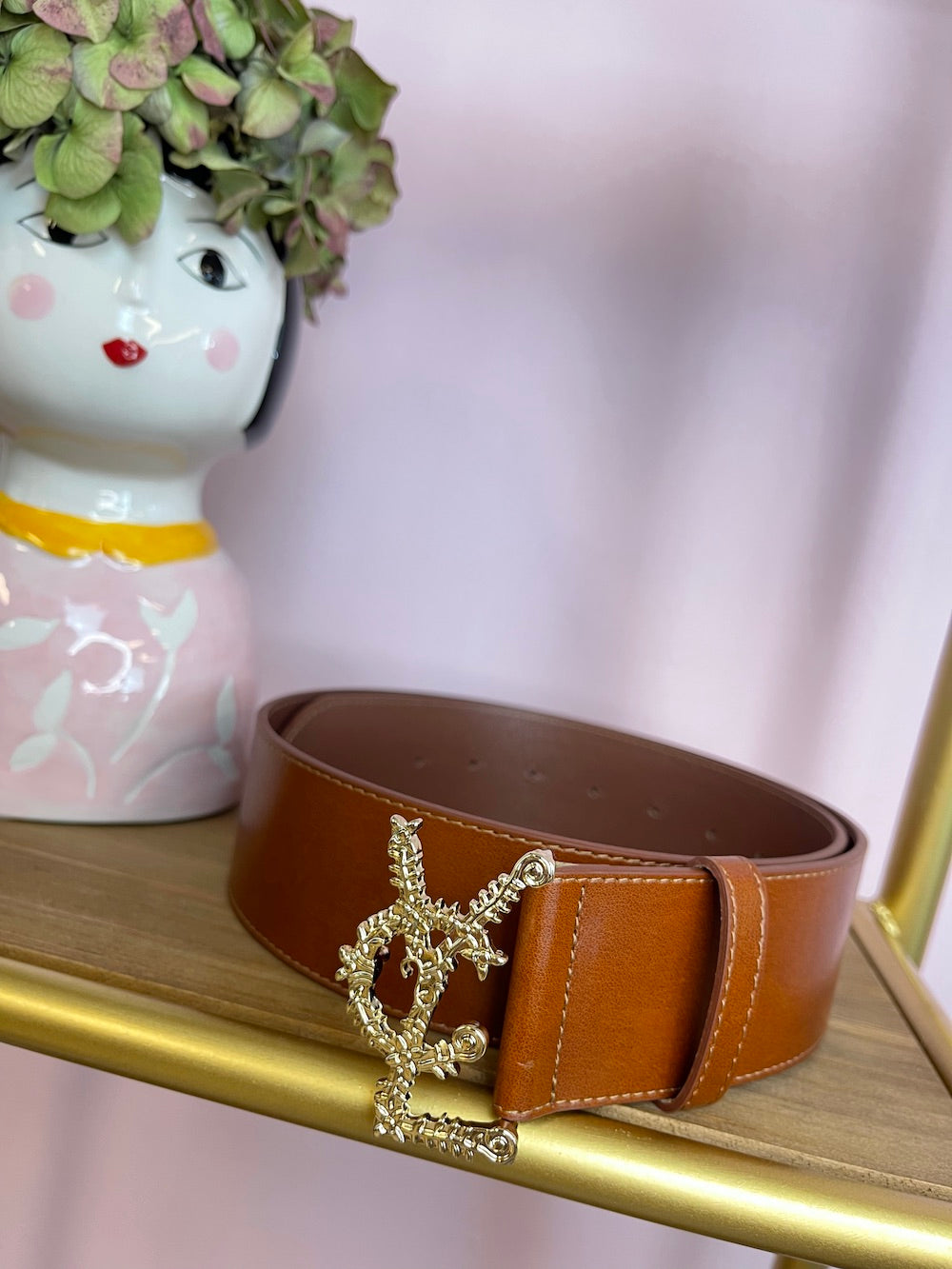 Cintura in pelle alta con fibbia oro, logo lavorato “Vcl”.