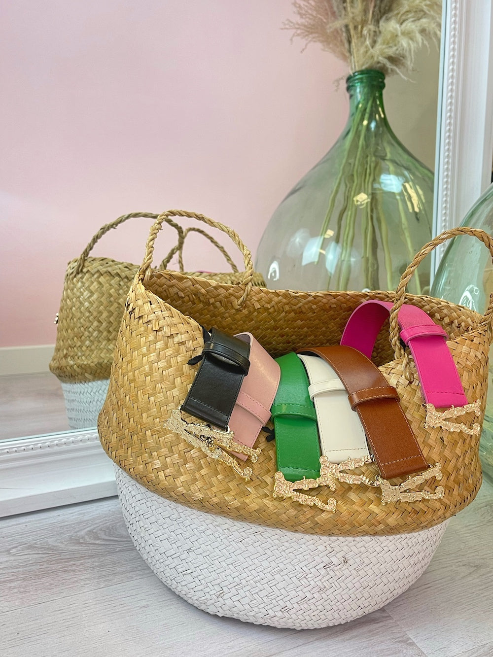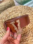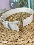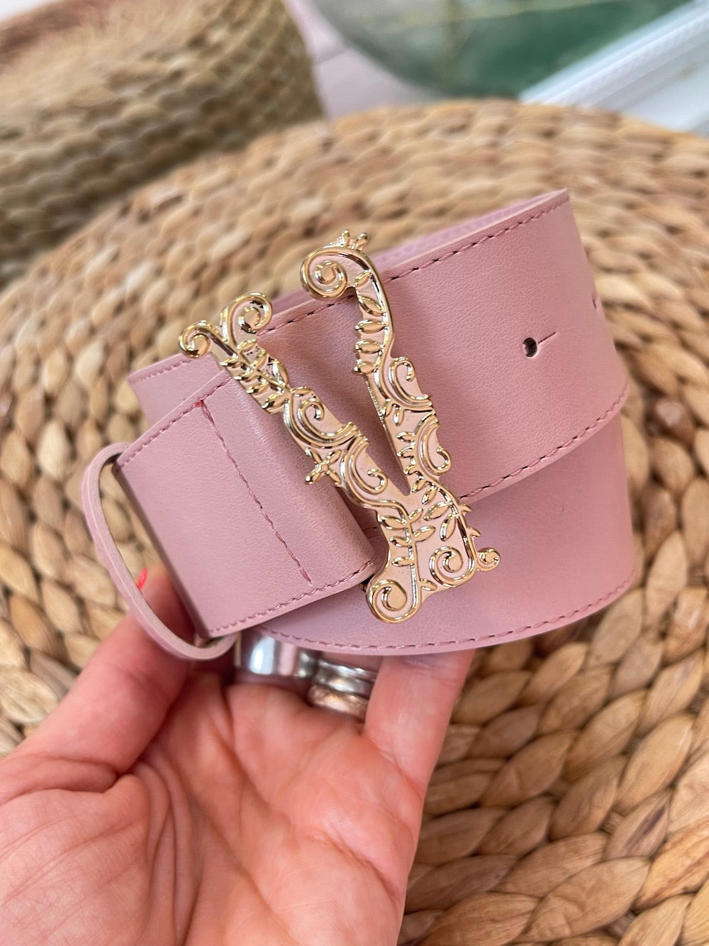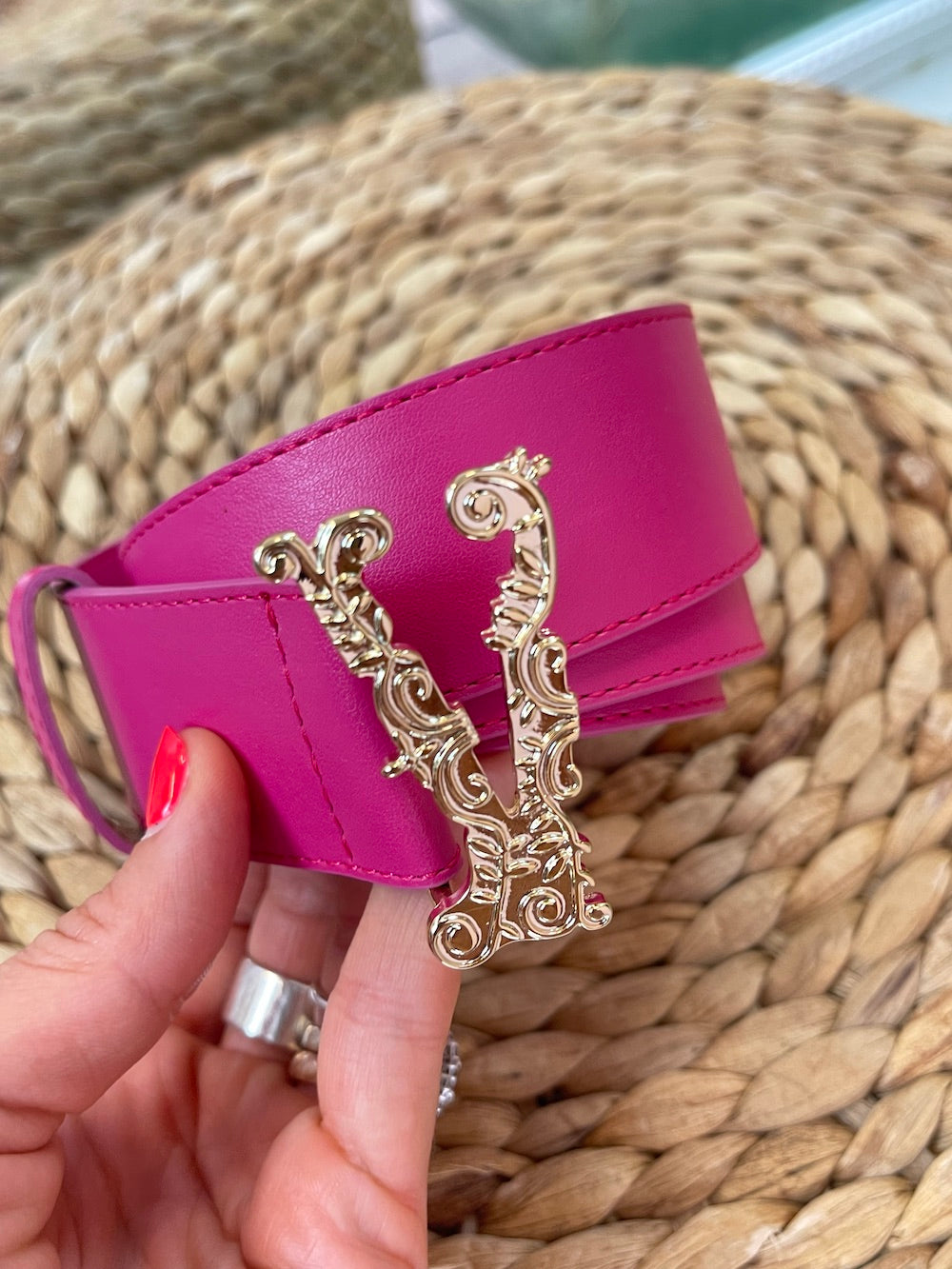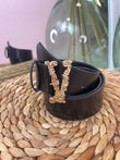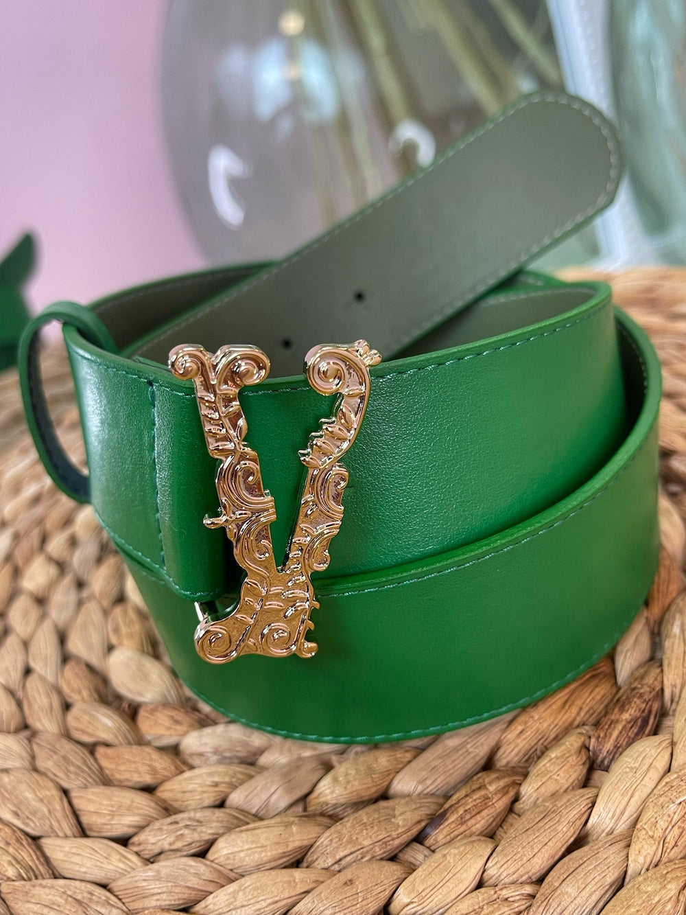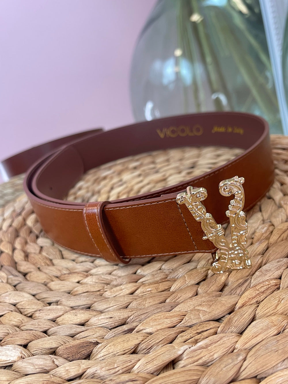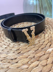 Cintura in pelle media con fibbia oro, logo lavorato “V”.