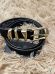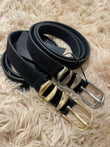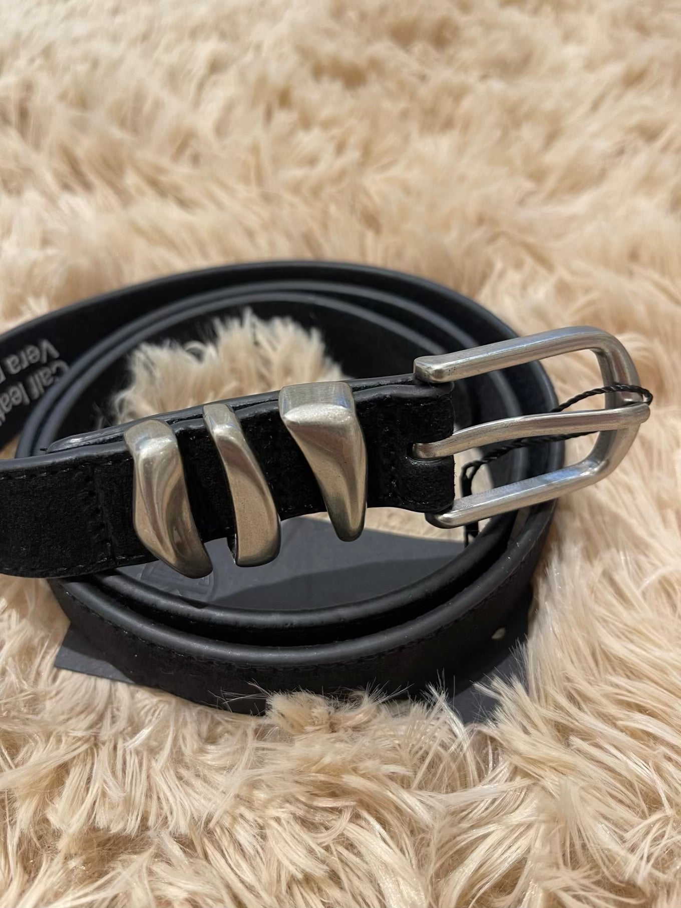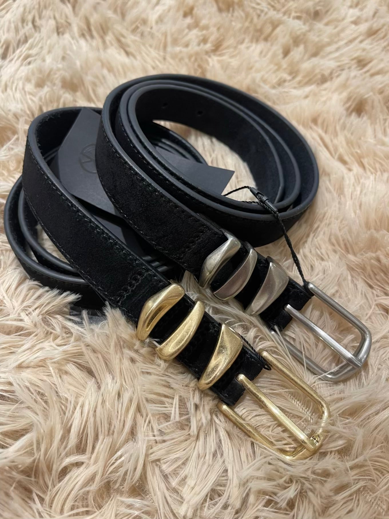 Cintura in suede nera con fibbia argentata o dorata e dettaglio tre passanti.