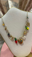 Collana multi charms, con filo intrecciato e annodato bianco e oro. Lunghezza 40cm+5cm catenella