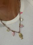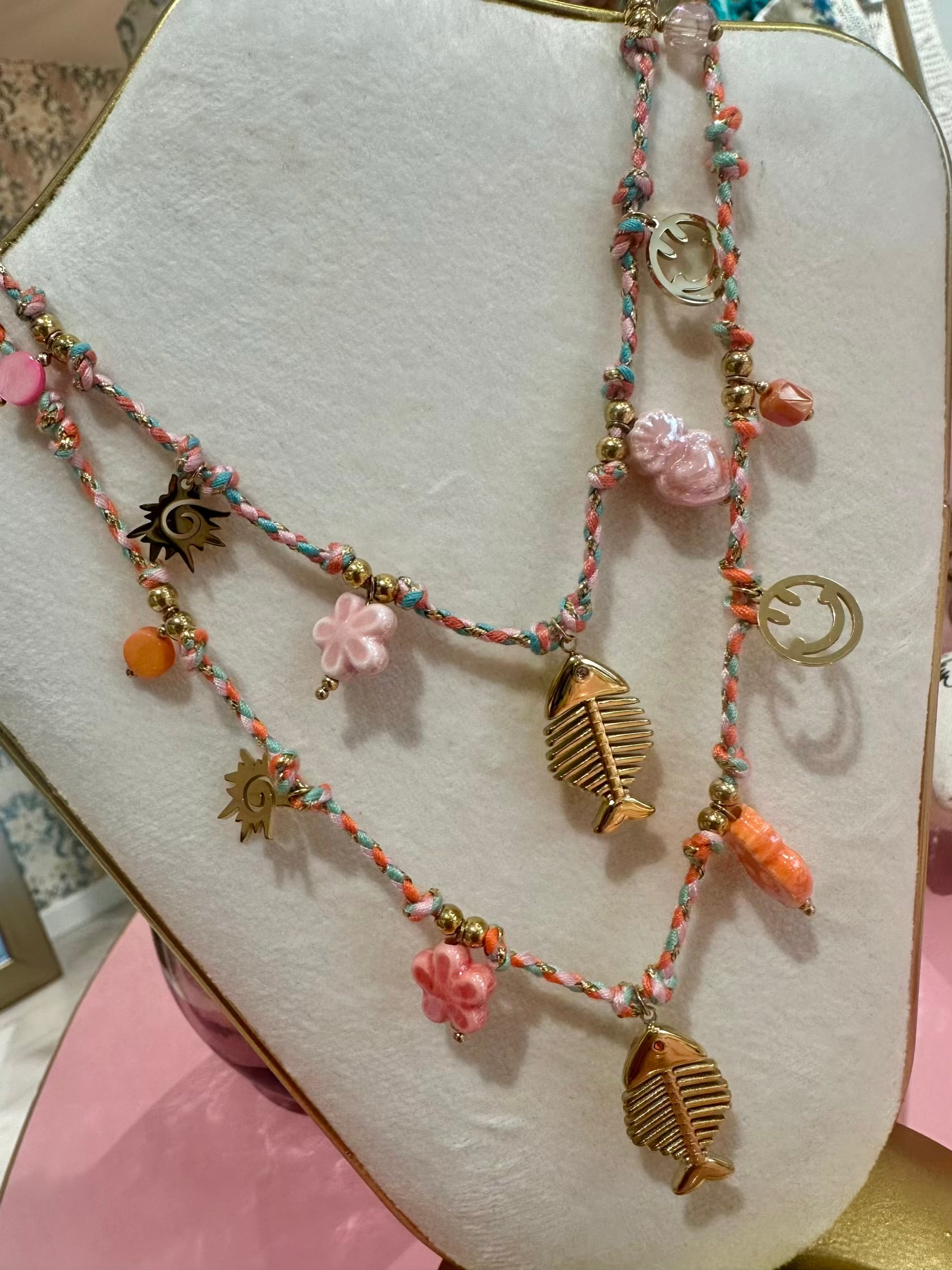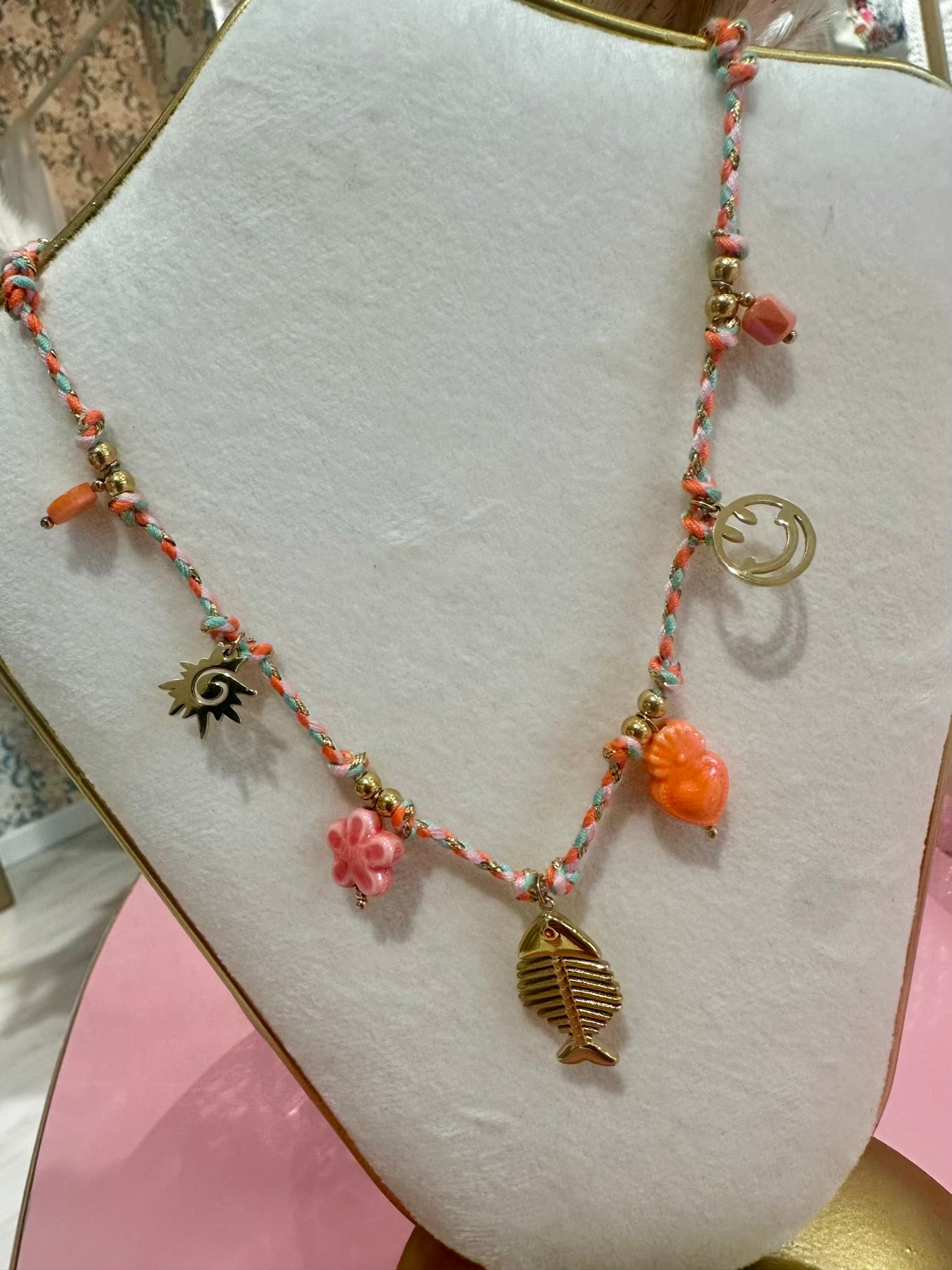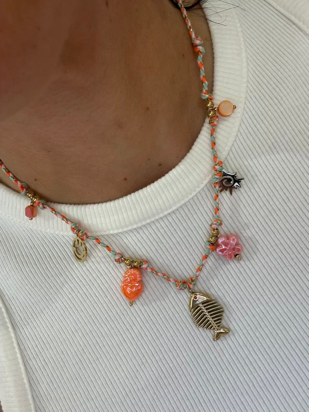 Collana multi charms, con filo intrecciato e annodato. Lunghezza 40cm+5cm catenella