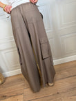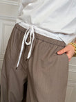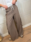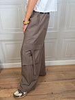 - Pantalone cargo a gamba ampia con elastico in vita e tasconi laterali , chiusura con laccetto.