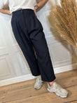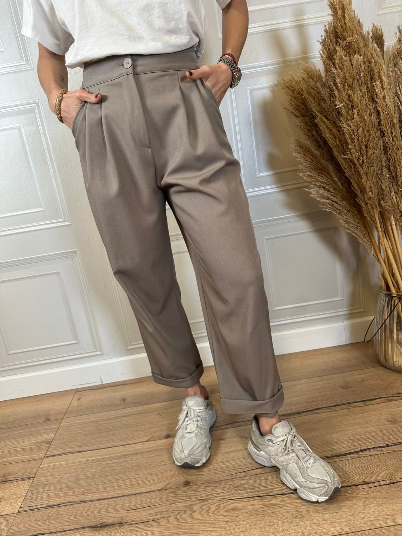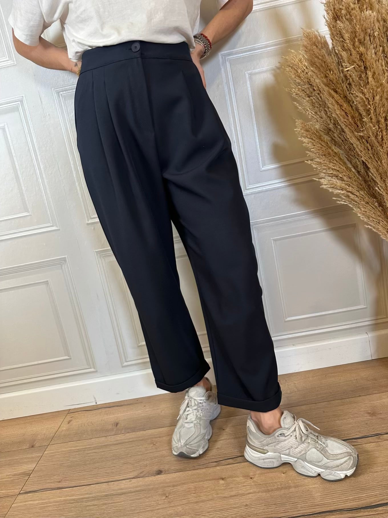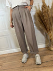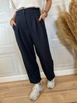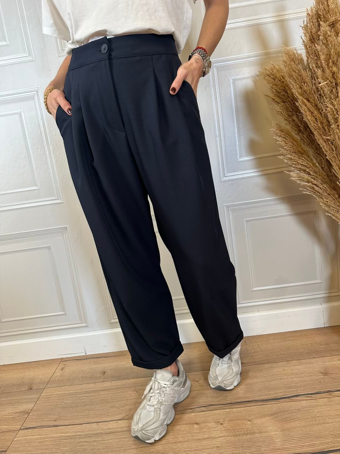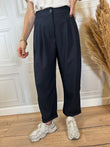 Pantalone modello baggy, effetto baloon, con doppie riprese sul davanti e risvoltino sul fondo. In foto taglia XS. Vestibilità leggermente morbida.