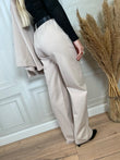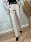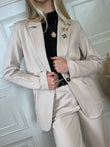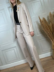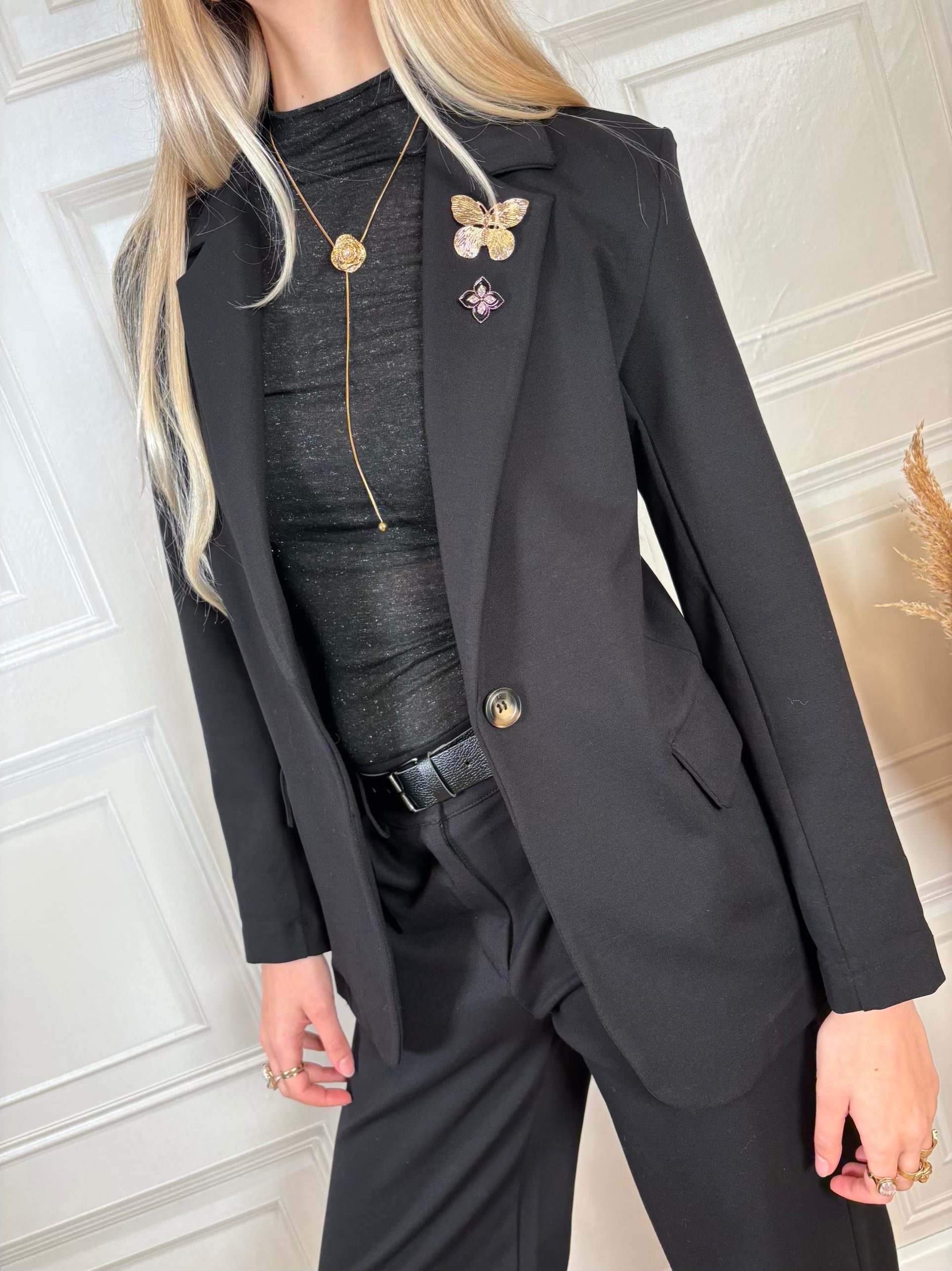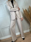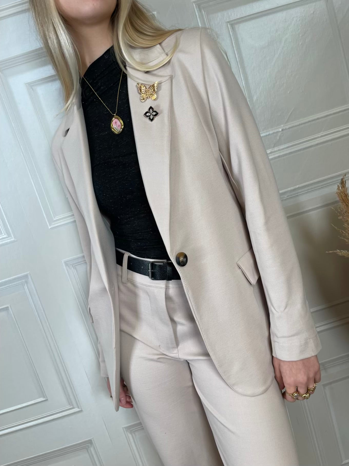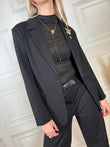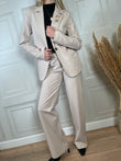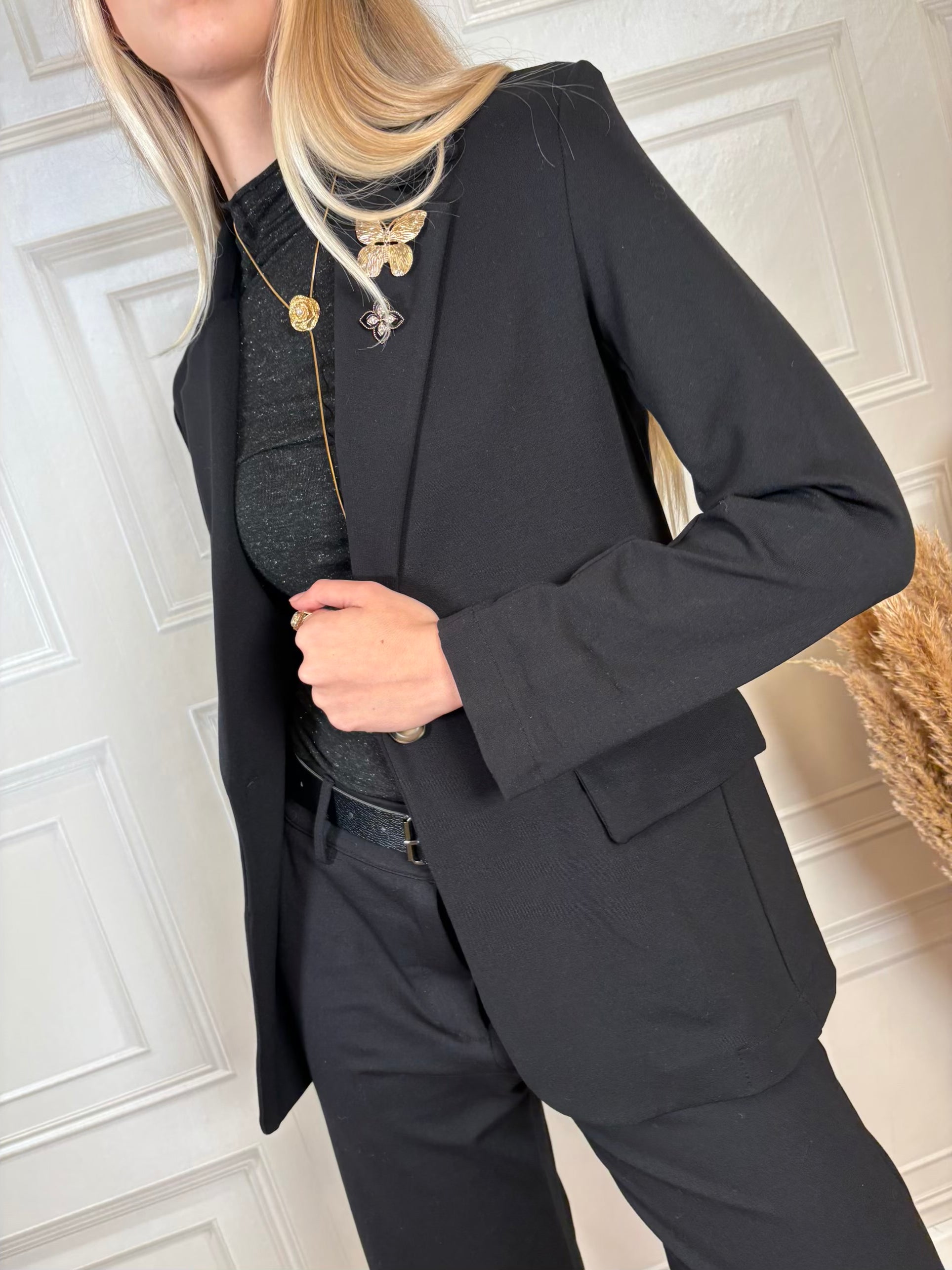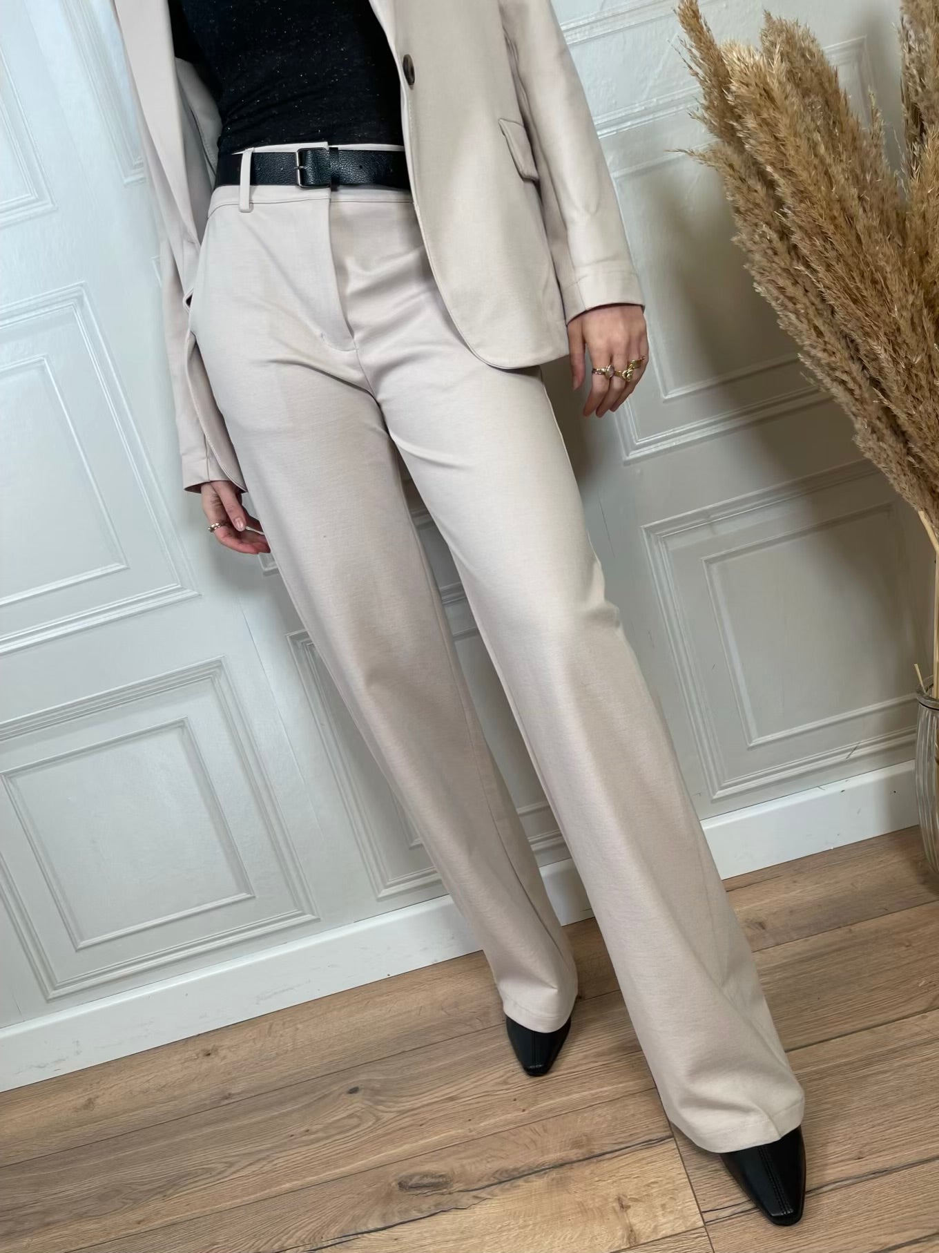 Completo in punto milano composto da: -blazer modello monopetto leggermente sfiancato, con chiusura a un bottone e spille comprese su reverse. -pantalone modello a palazzo con cintura inclusa ed elastico in vita. Chiusura con zip e bottone.