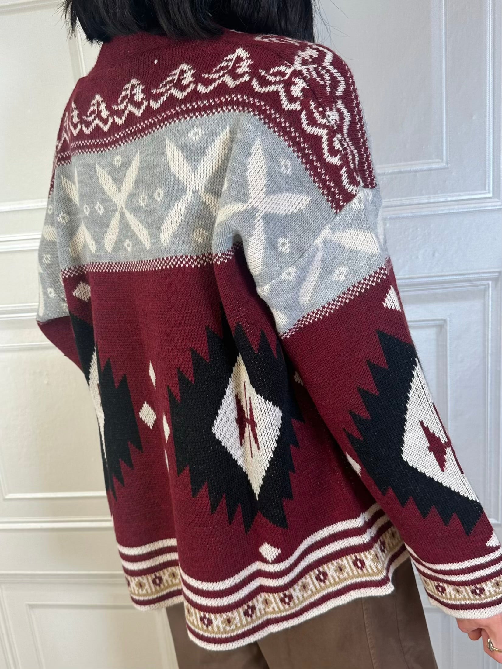 Cardigan jacquard sui toni del bordeaux , burro, nero e grigio.