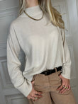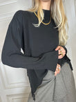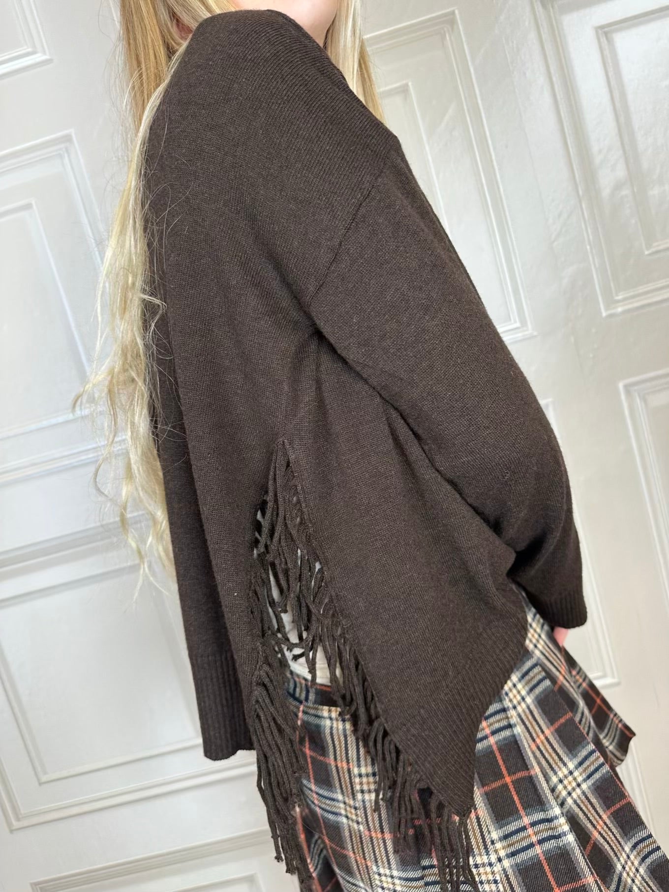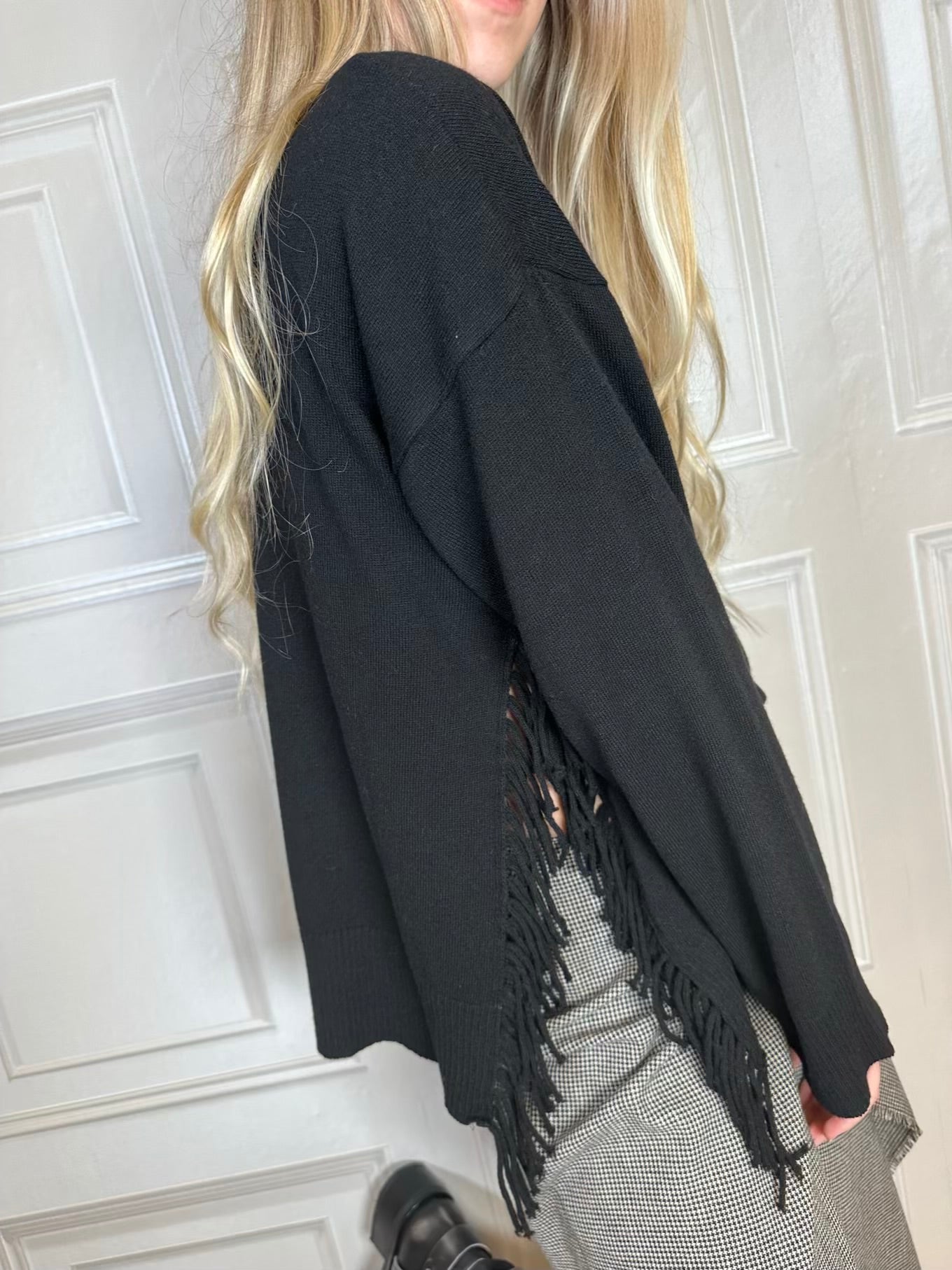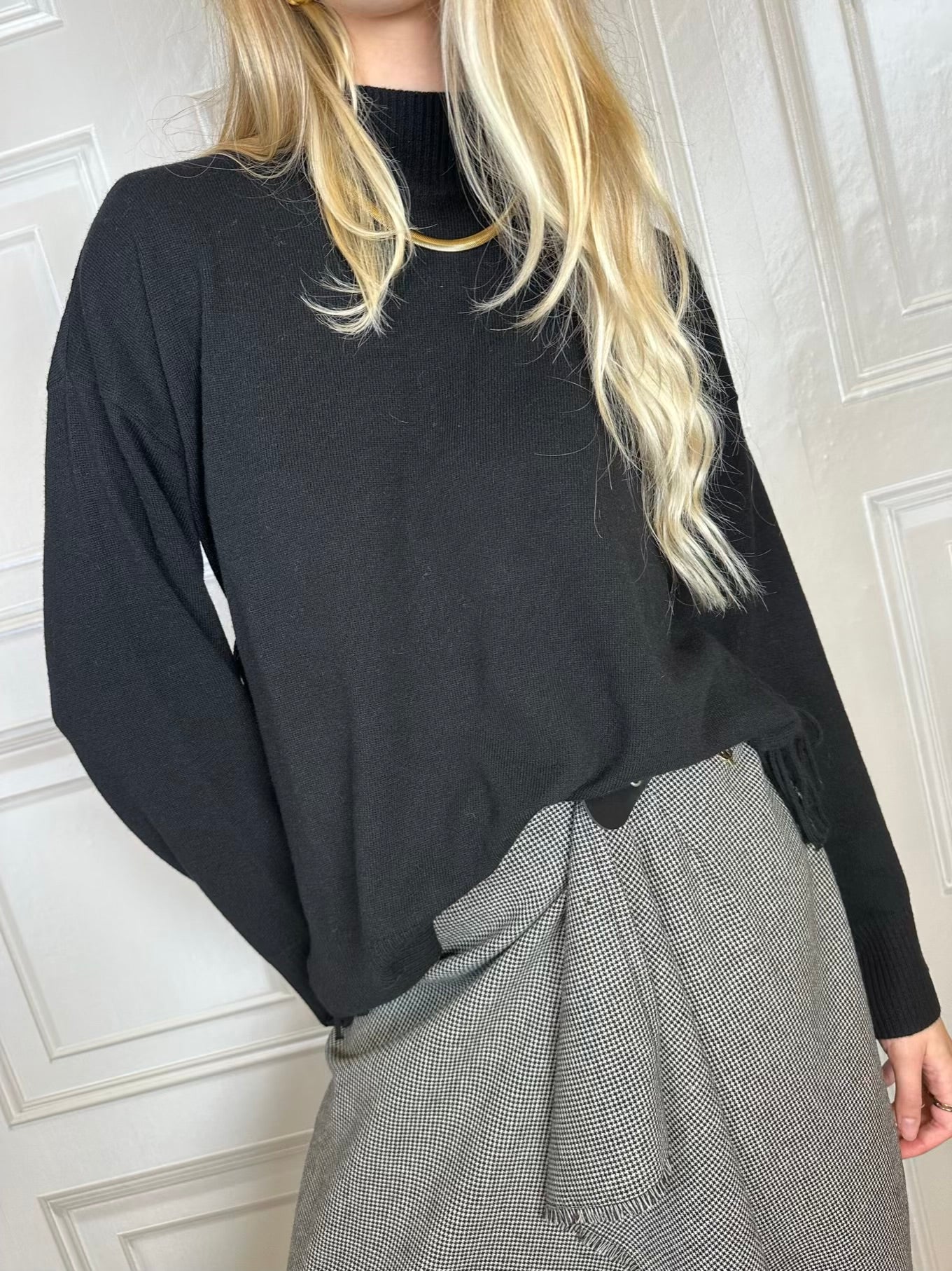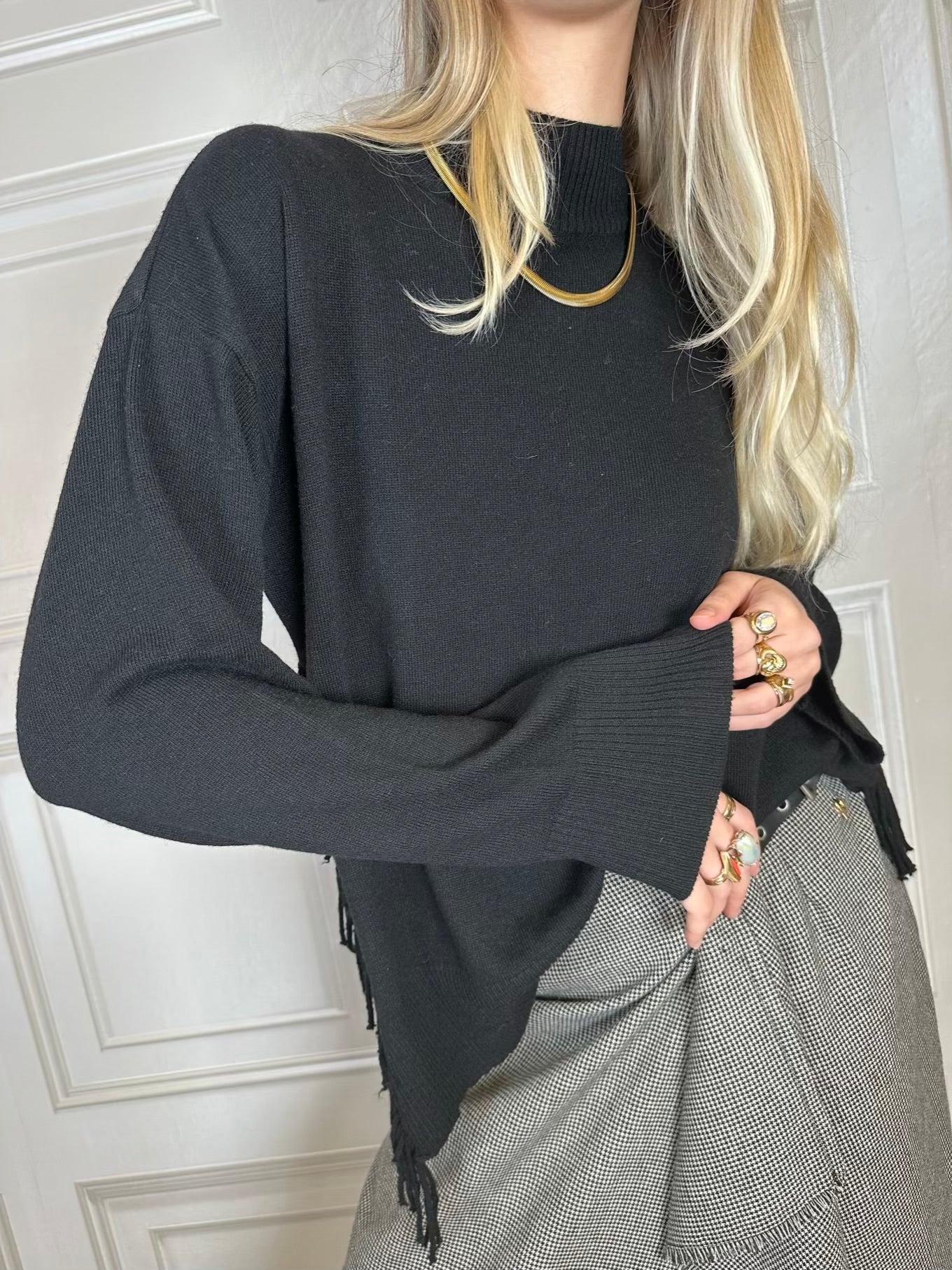 Lupetto con manica lunga in lana e cashmere. Modello con spacchi laterali e frange. Costine su collo, polsini e fondo. Taglia unica, vestibilità morbida.