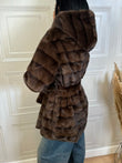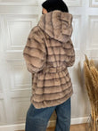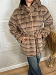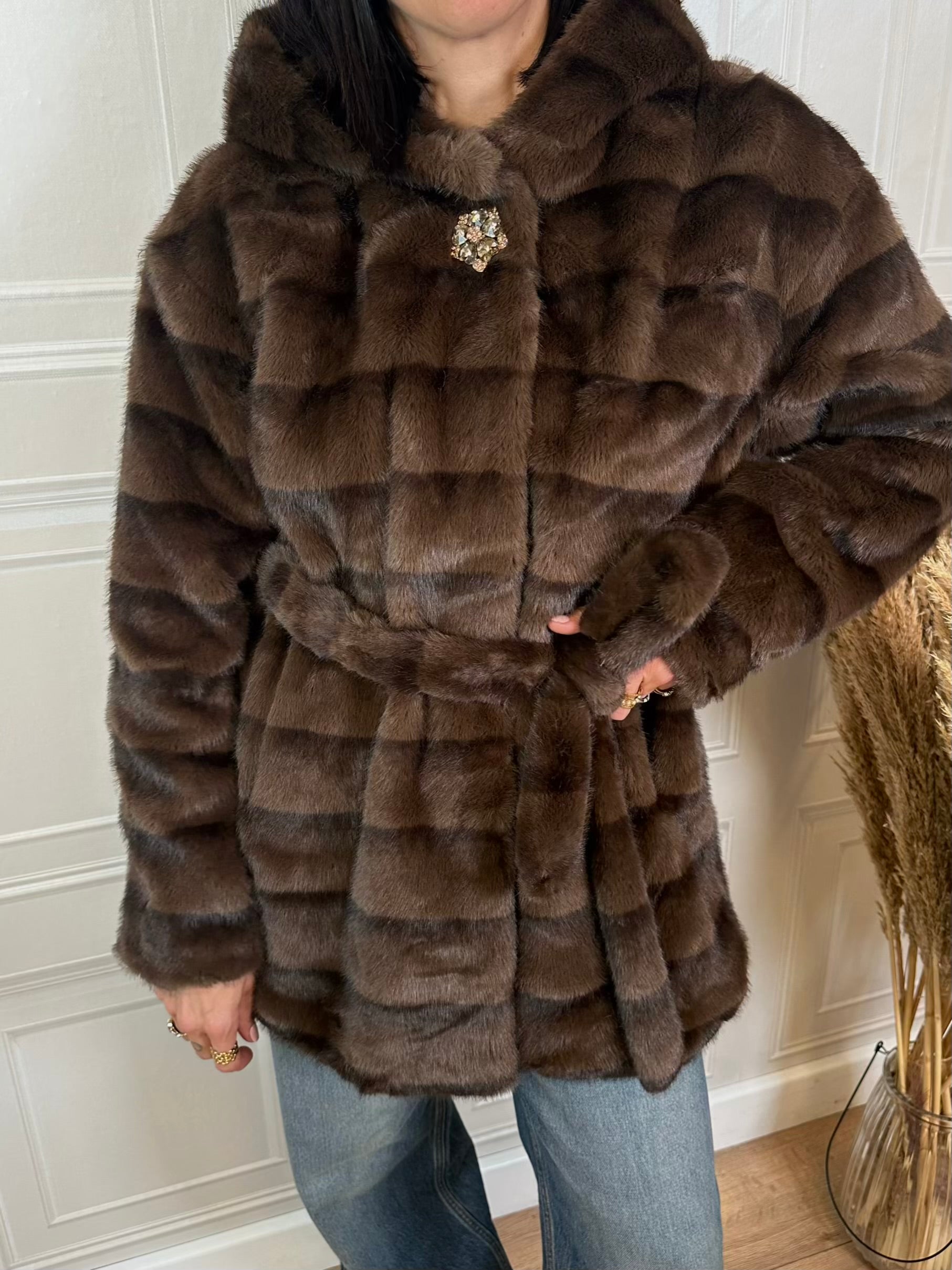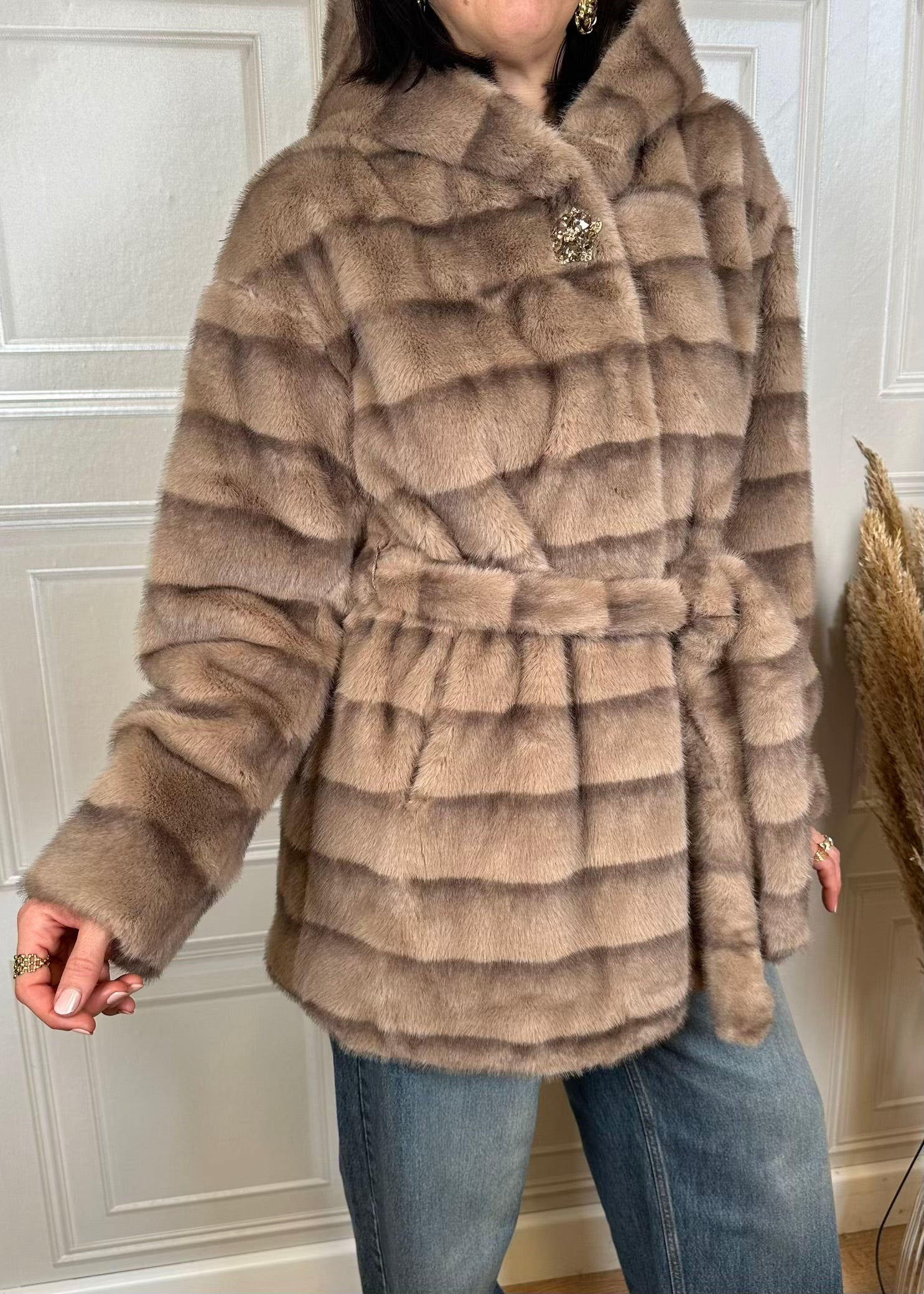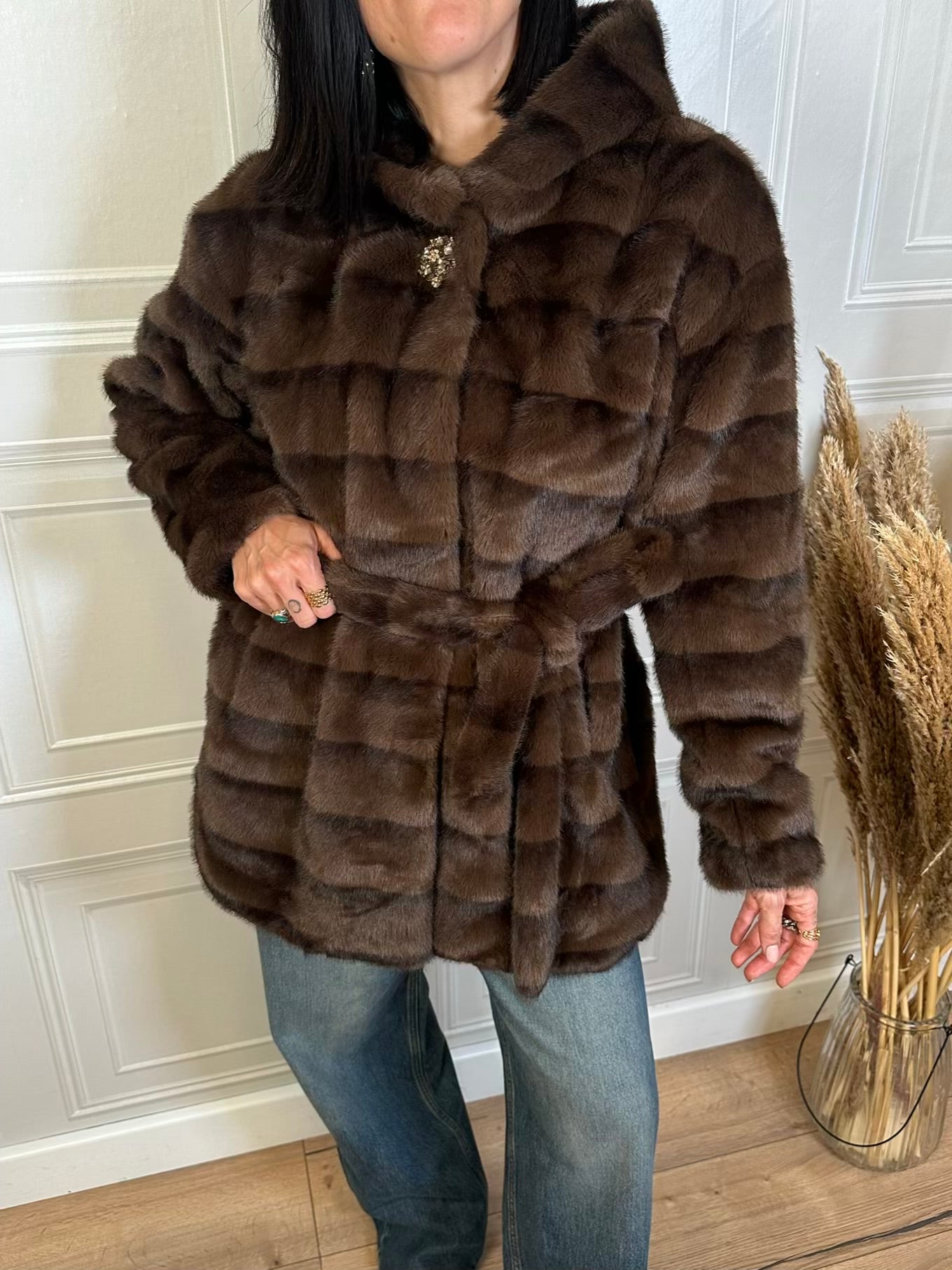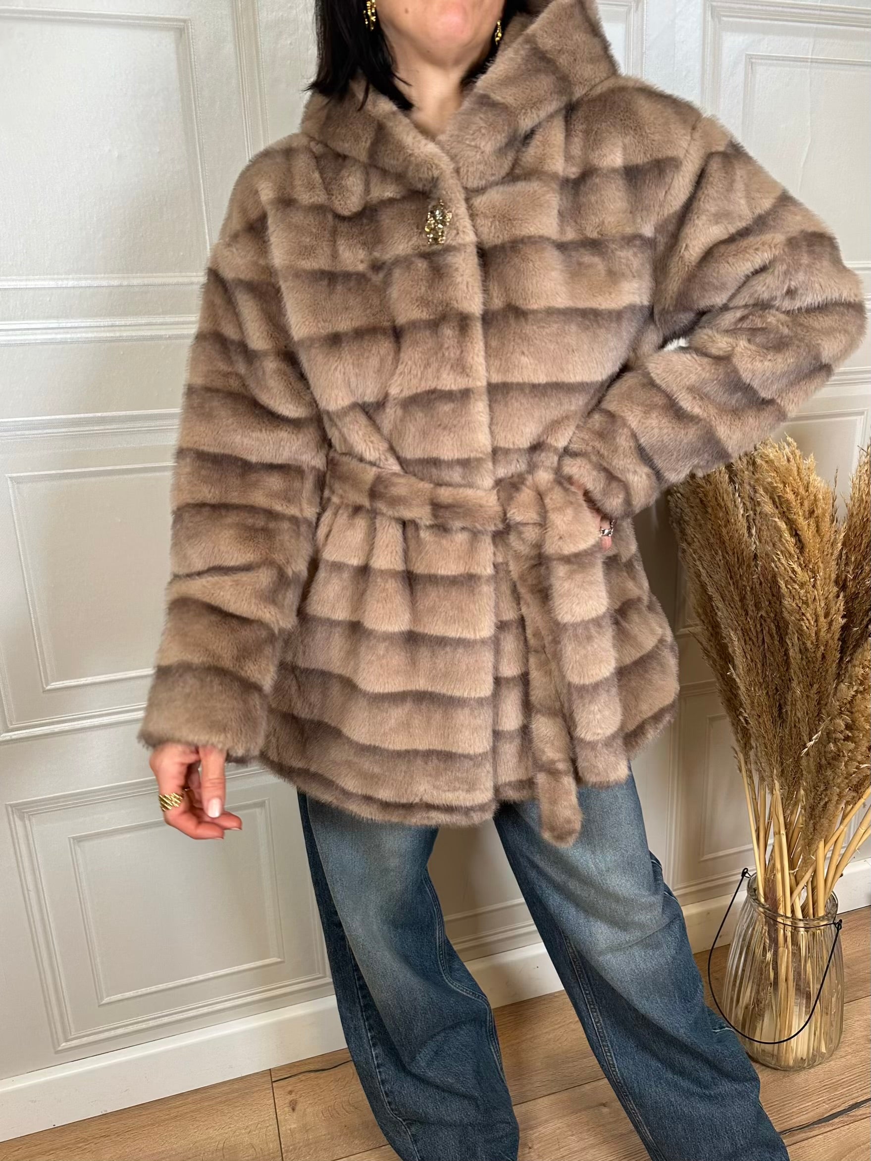 Eco pelliccia lavorazione trasversale a pelo corto, con bottone gioiello, cappuccio e cintura in vita. Modello regolare, lunghezza medio lunga. Chiusura con bottoni . Taglia unica.